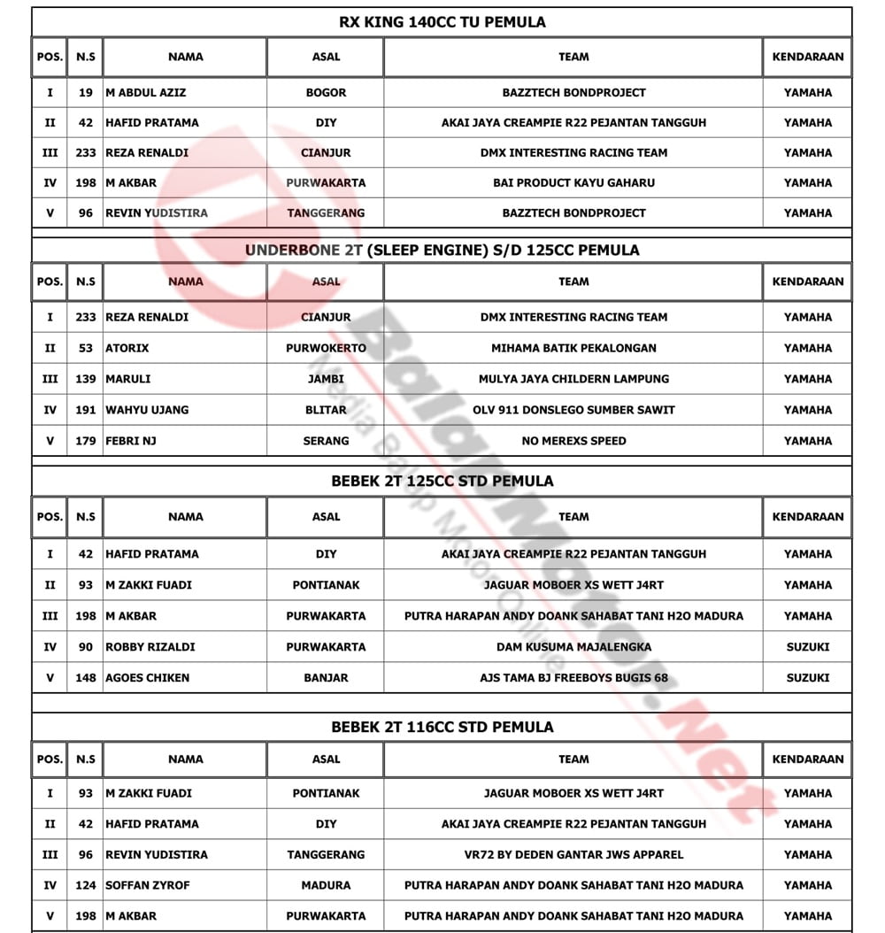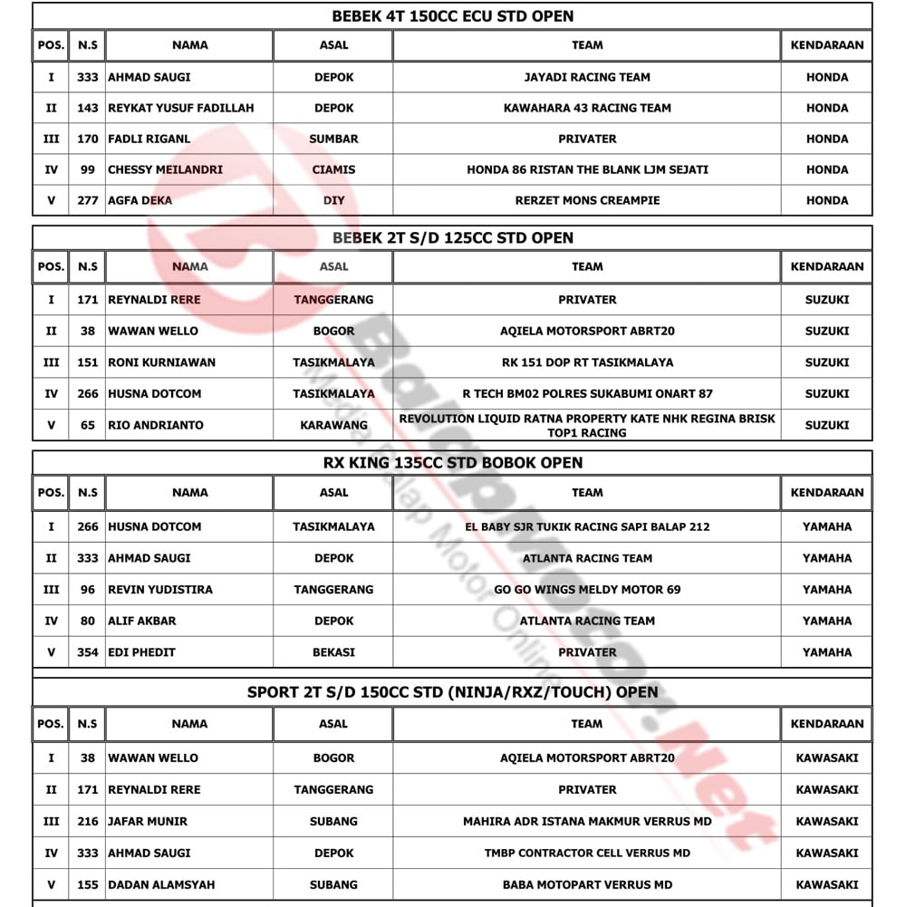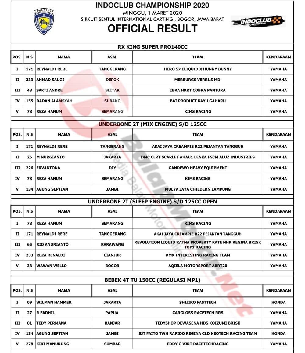 BalapMotor.Net – Berikut kami paparkan hasil lengkap juara dari kejuaraan Indoclub Championship 2020 putaran 1 yang berlangsung di sirkuit Sentul Karting, Bogor, Jabar pada Minggu 1 Maret 2020. | Yugo