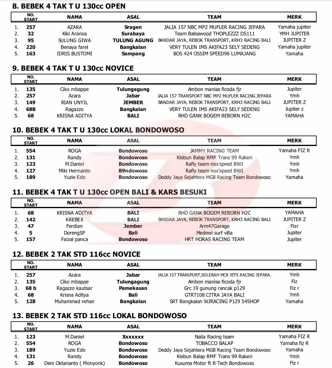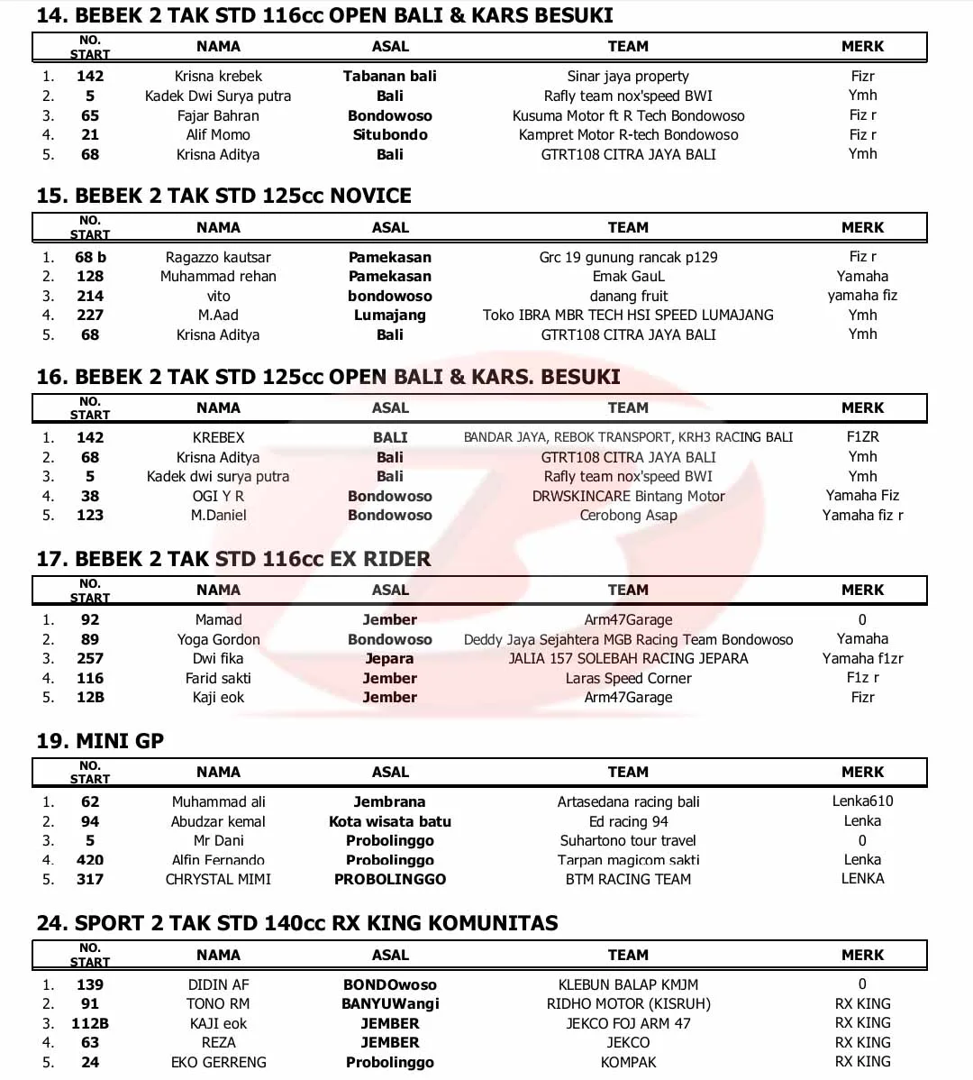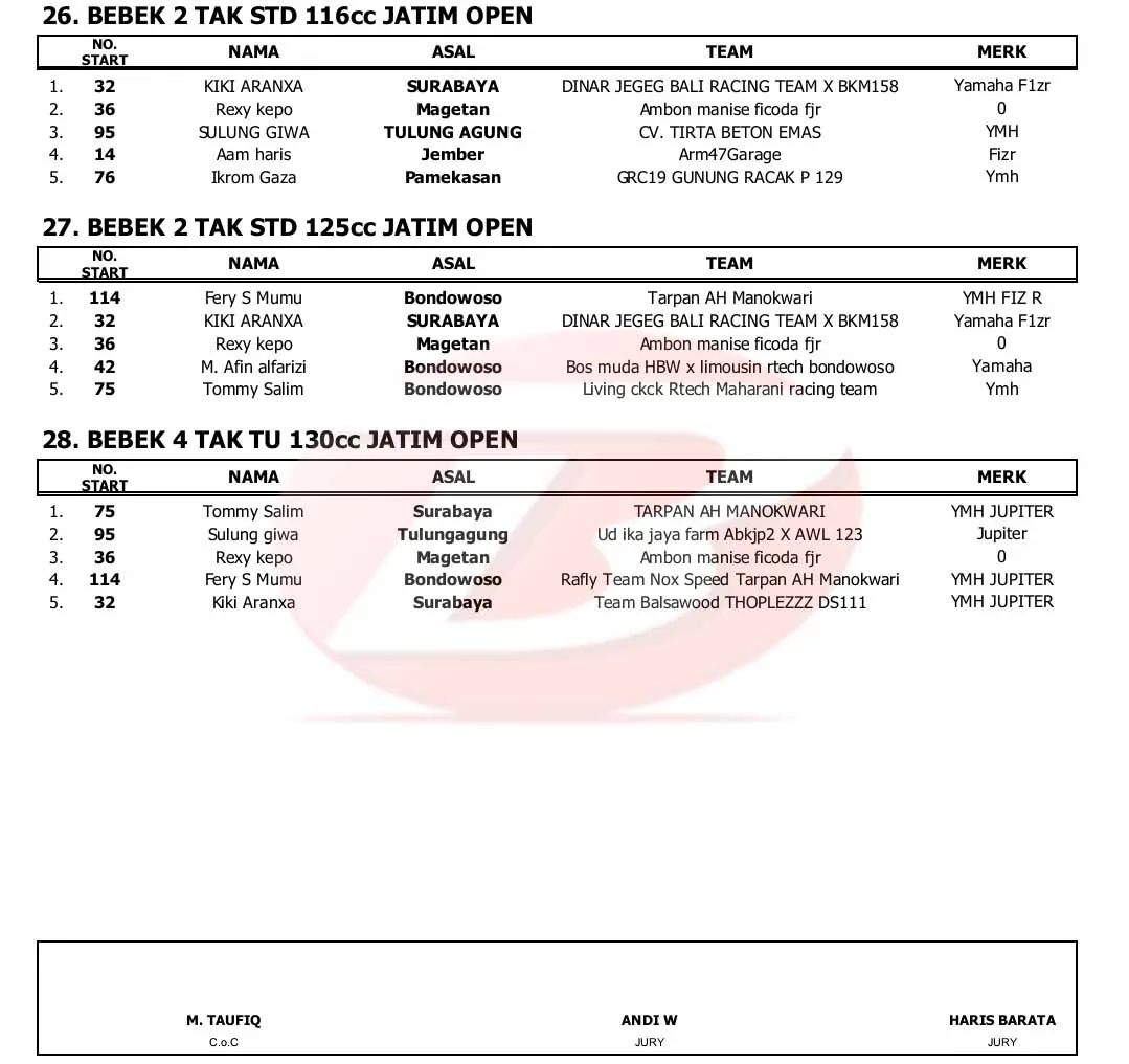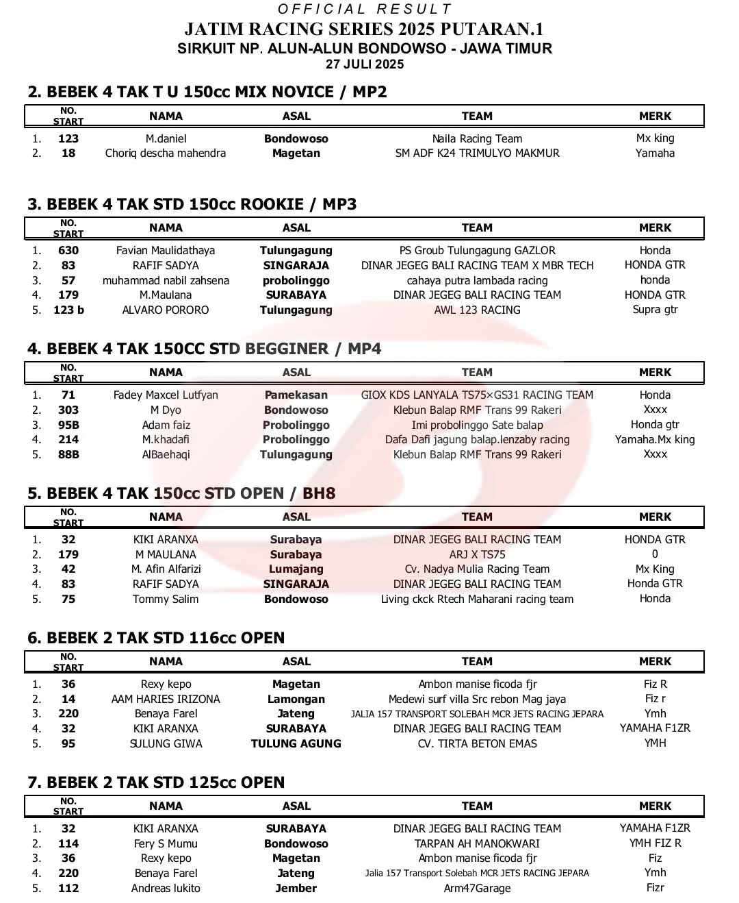 BalapMotor.Net – Berikut merupakan hasil lengkap Kejuaraan Jatim Racing Series (JRS) putaran pertama yang berlangsung di sirkuit NP. Alun-alun Bondowoso, Jawa Timur pada Minggu 27 Juli 2025. (**)