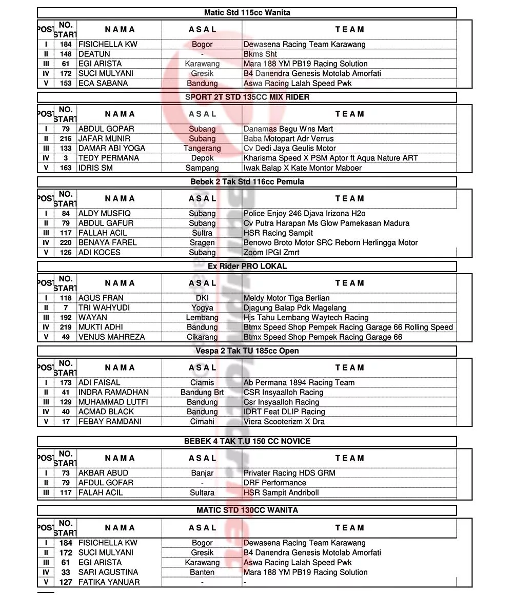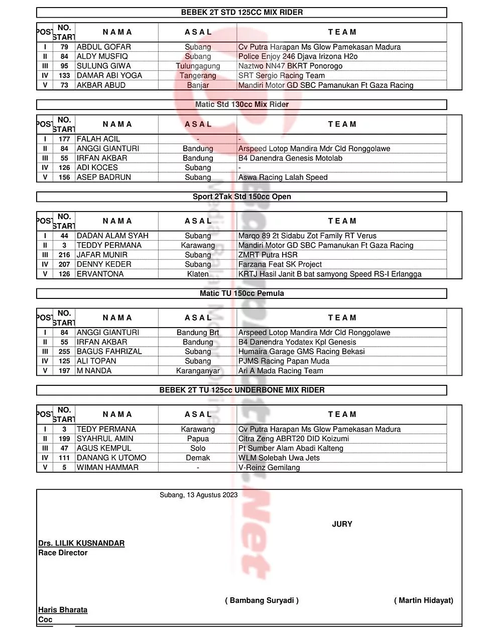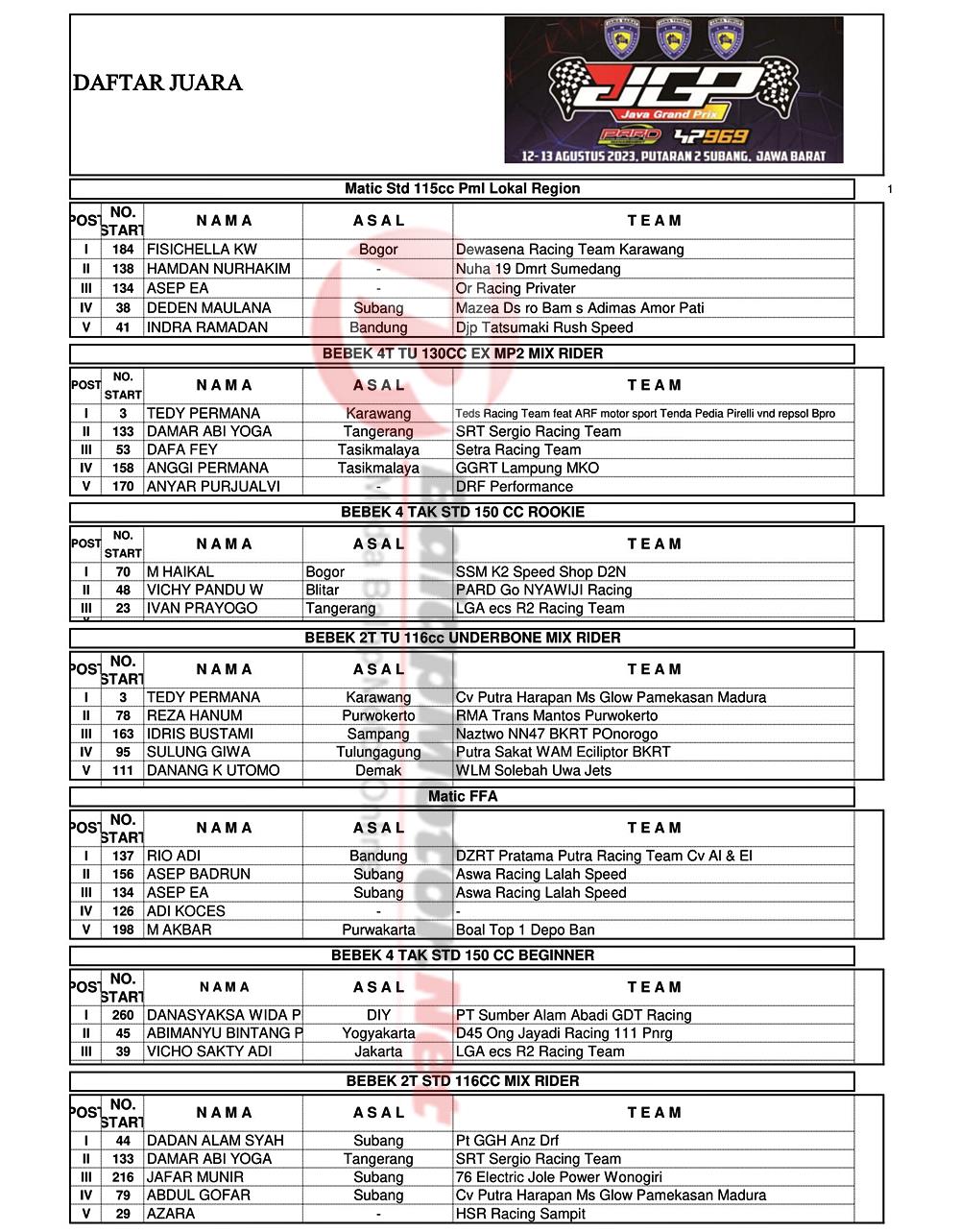 BalapMotor.Net – Berikut merupakan hasil lengkap Kejuaraan Java Grand Prix (JGP) putaran kedua yang berlangsung di sirkuit Gery Mang, Subang, Jawa Barat pada 12-13 Agustus 2023. (***)