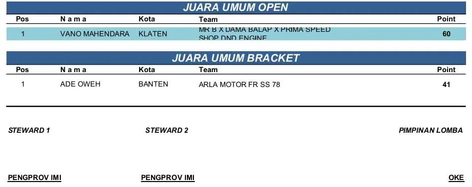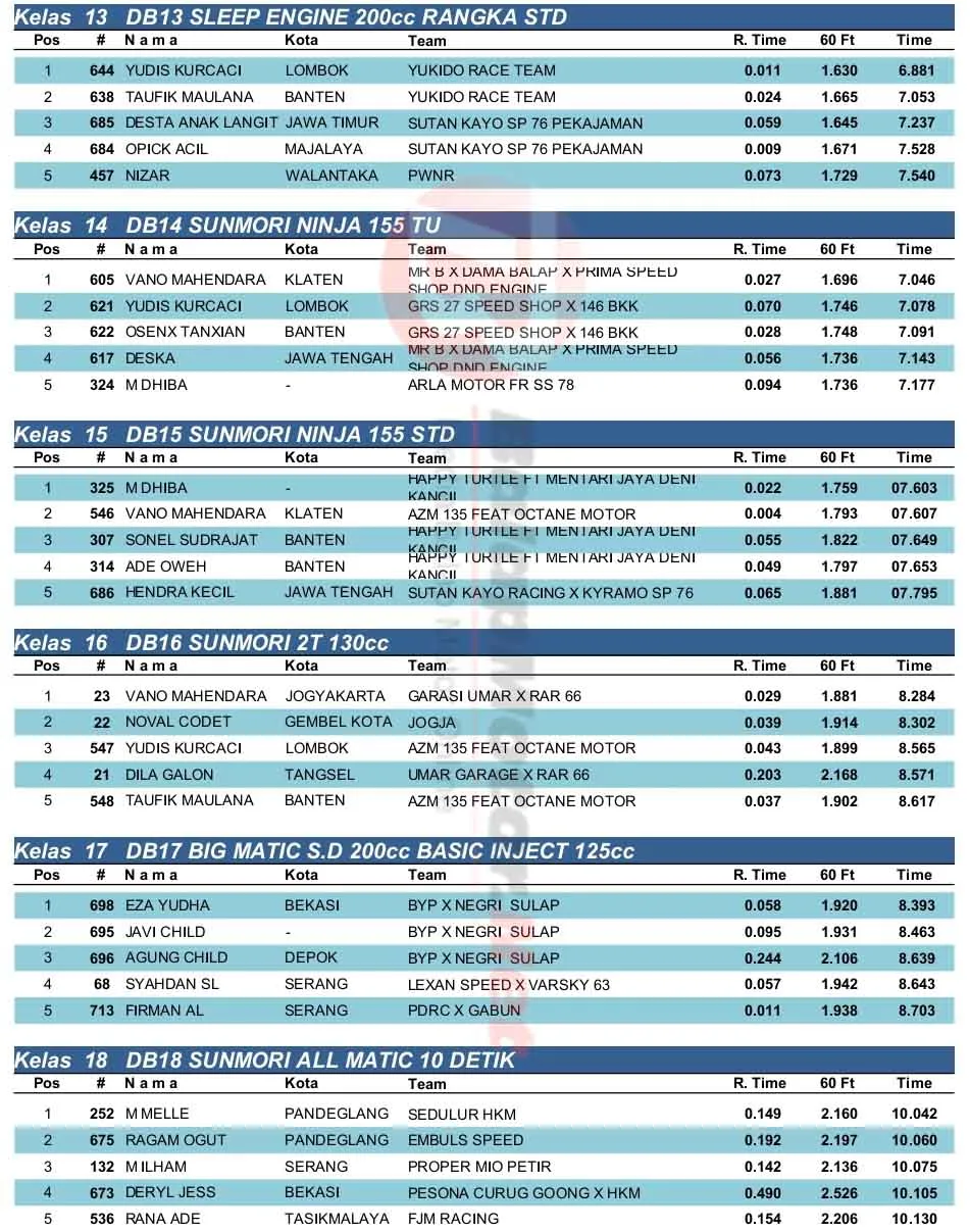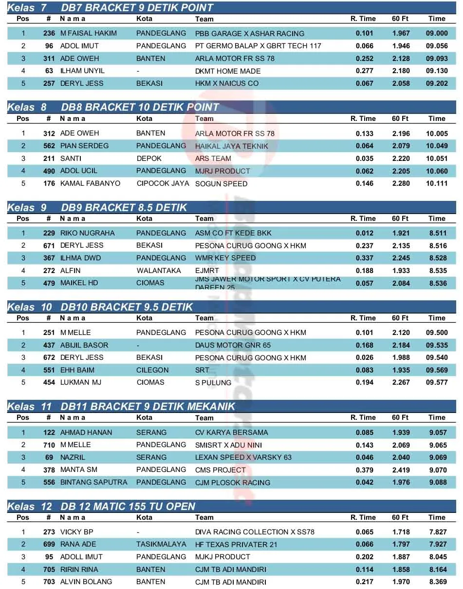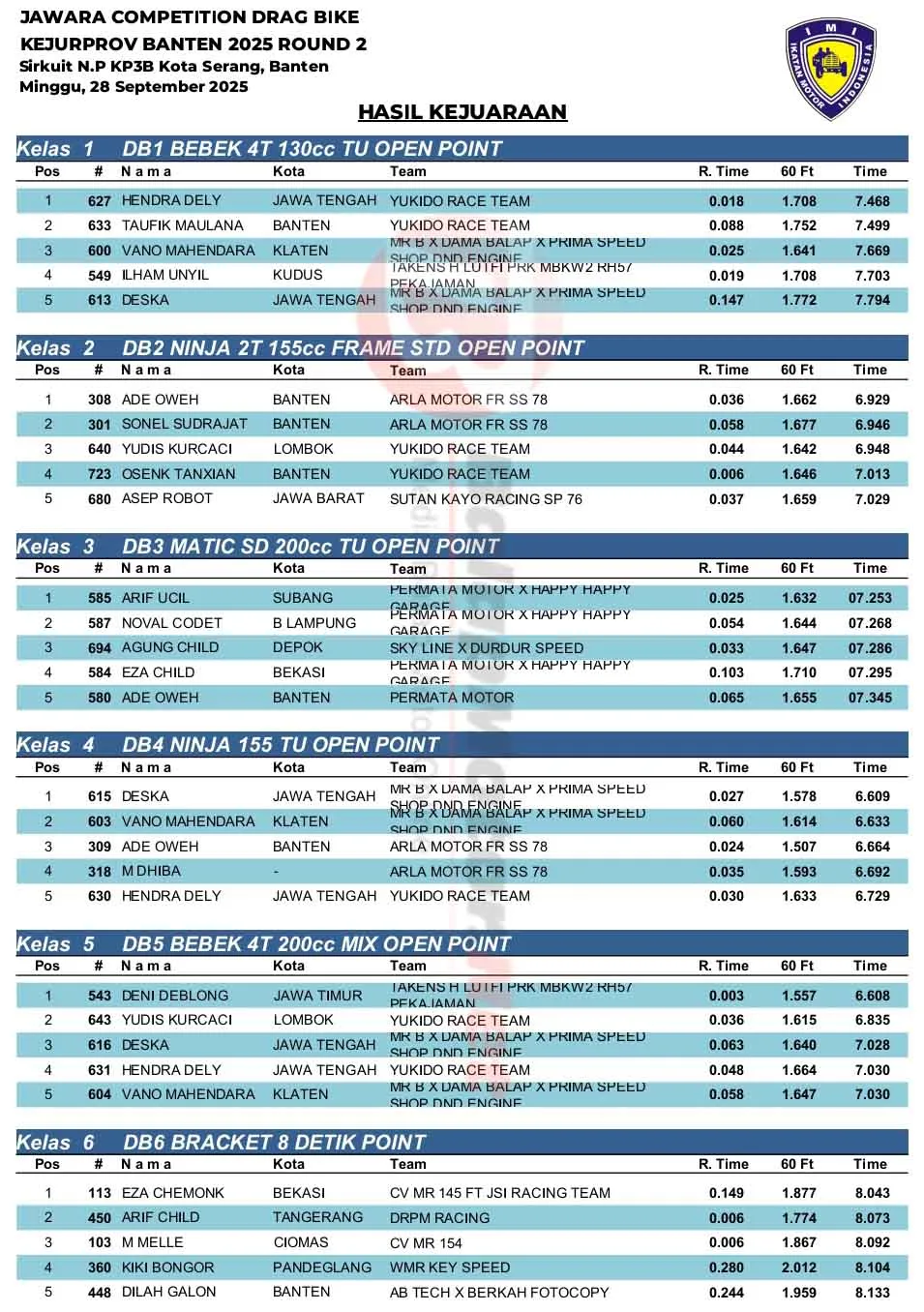 BalapMotor.Net – Berikut merupakan hasil lengkap kejuaraan balap lurus Jawara Competition Drag Bike Kejurprov Banten Seri 2 yang berlangsung di sirkuit NP. KP3B Serang pada Minggu 28 September 2025. (**)