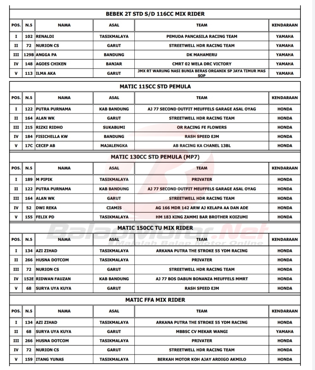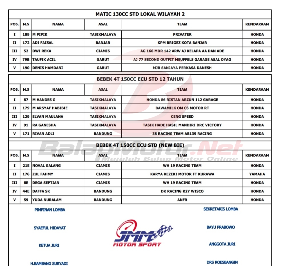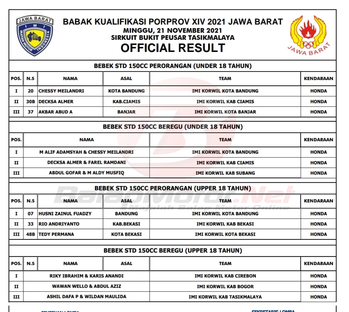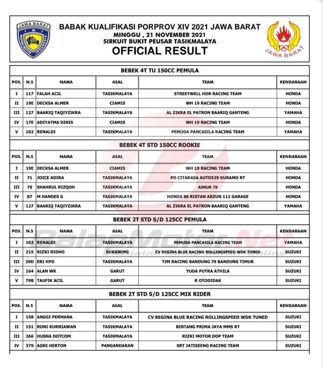 BalapMotor.Net – Berikut merupakan hasil juara dari gelaran Babak Kualifikasi Porprov XIV Jawa Barat yang berlangsung di sirkuit Bukit Peusar Kota Tasikmalaya pada 20-21 November 2021.