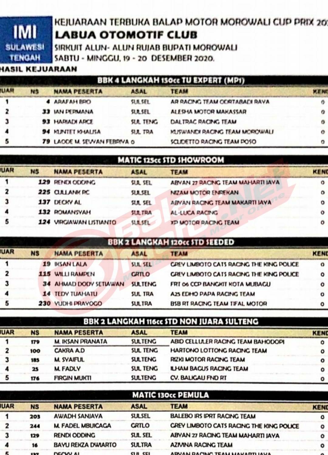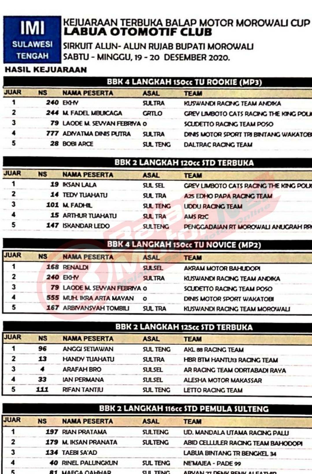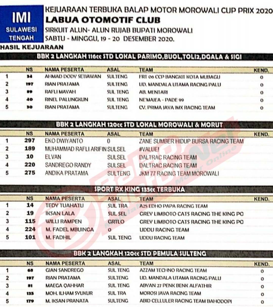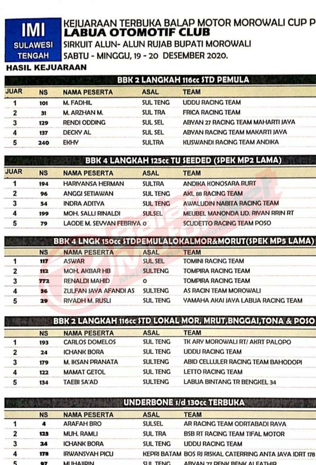 BalapMotor.Net – Berikut merupakan hasil resmi dari Kejuaraan Terbuka Balap Motor Morowali Cup yang digelar di sirkuit Alun-Alun Rujab Bupati Worowali, Sulawesi Tengah pada 19-20 Desember 2020.