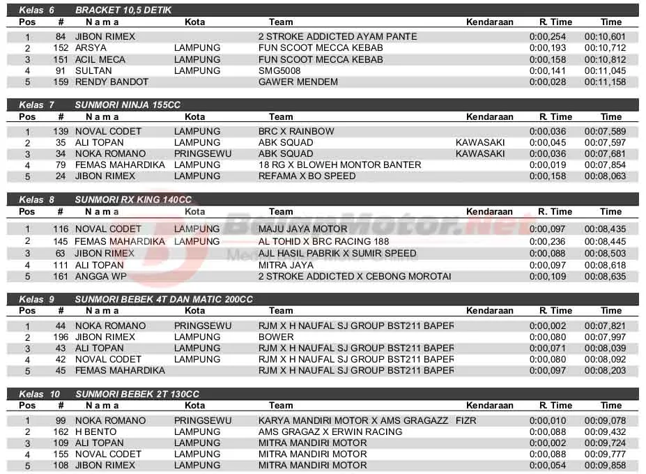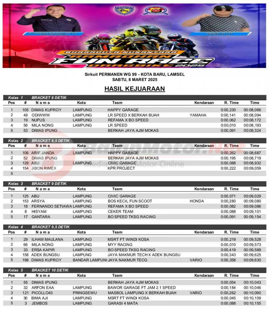BalapMotor.Net – Berikut merupakan hasil ajang balap lurus bertajuk Bharaduta Nusantara Ramadhan Fun Race Drag Bike 2025 yang berlangsung di sirkuit permanen WG 99 Kota Baru, Lampung Selatan pada Sabtu 8 Maret 2025. (**)