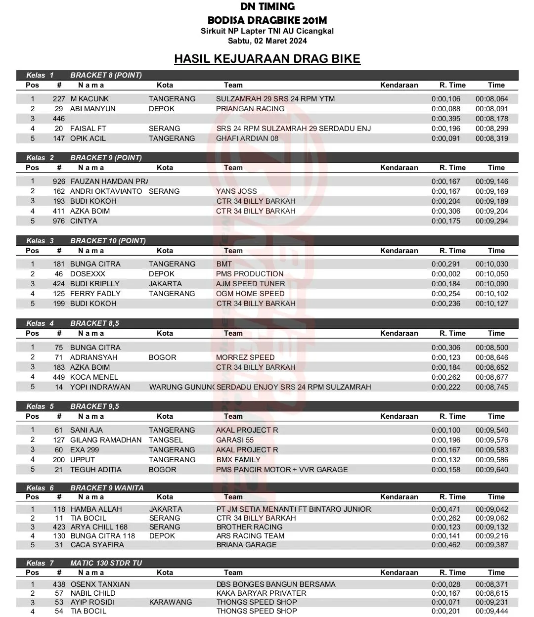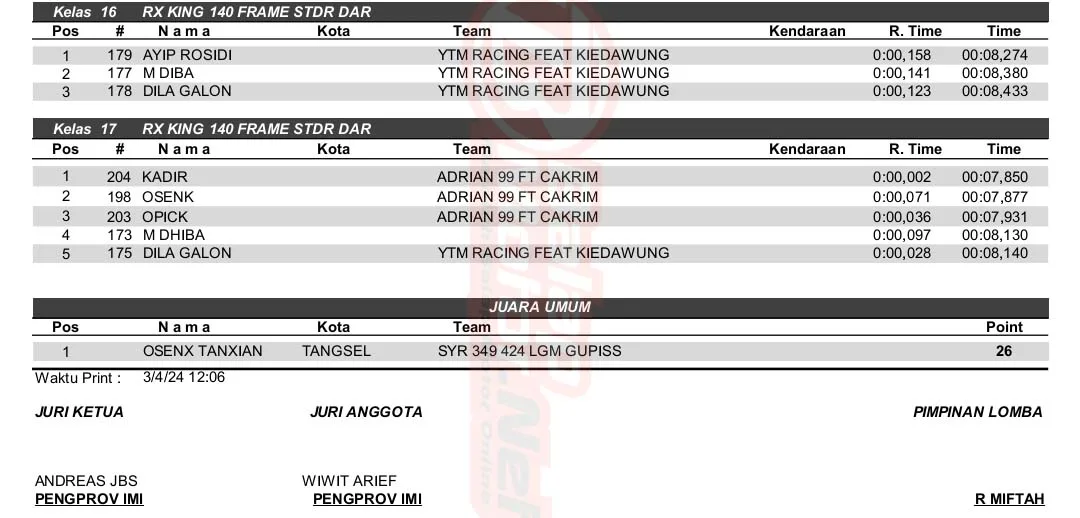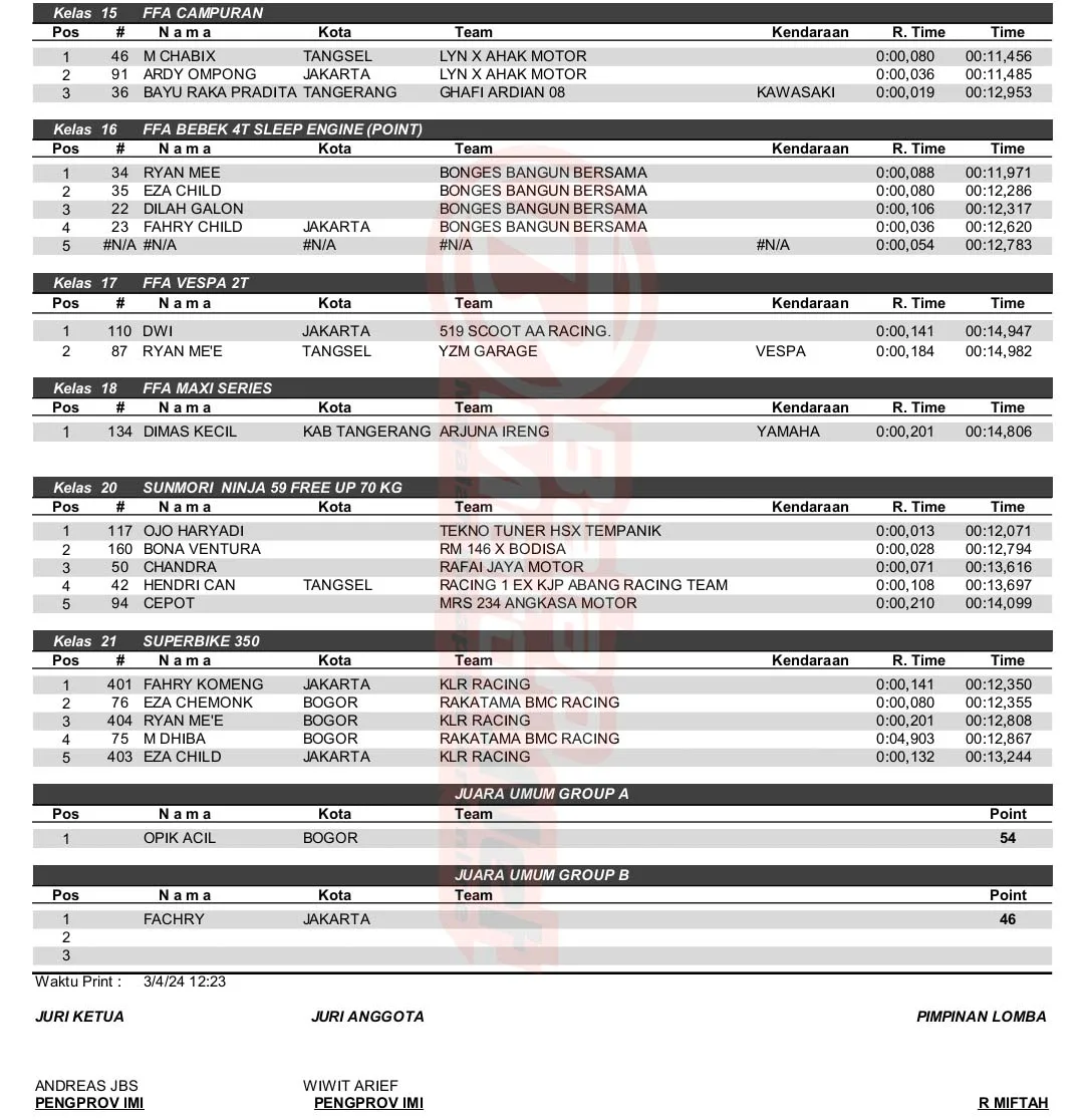 BalapMotor.Net – Berikut merupakan hasil kejuaraan balap lurus 201m dan 402m yang berlangsung di sirkuit NP. Lapter TNI AU Cicangkal pada 2-3 Maret 2024. (***)