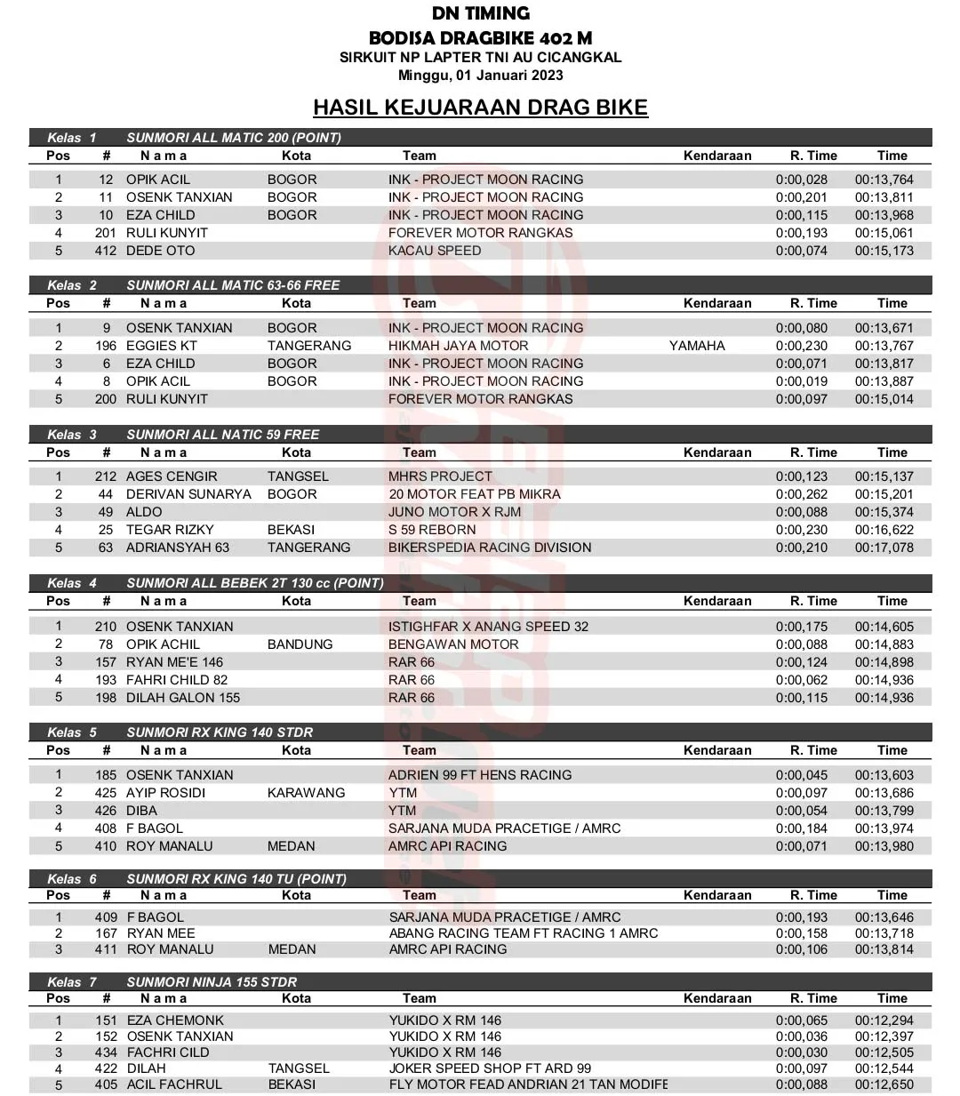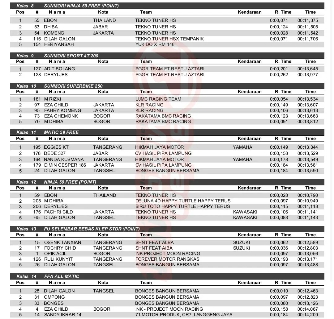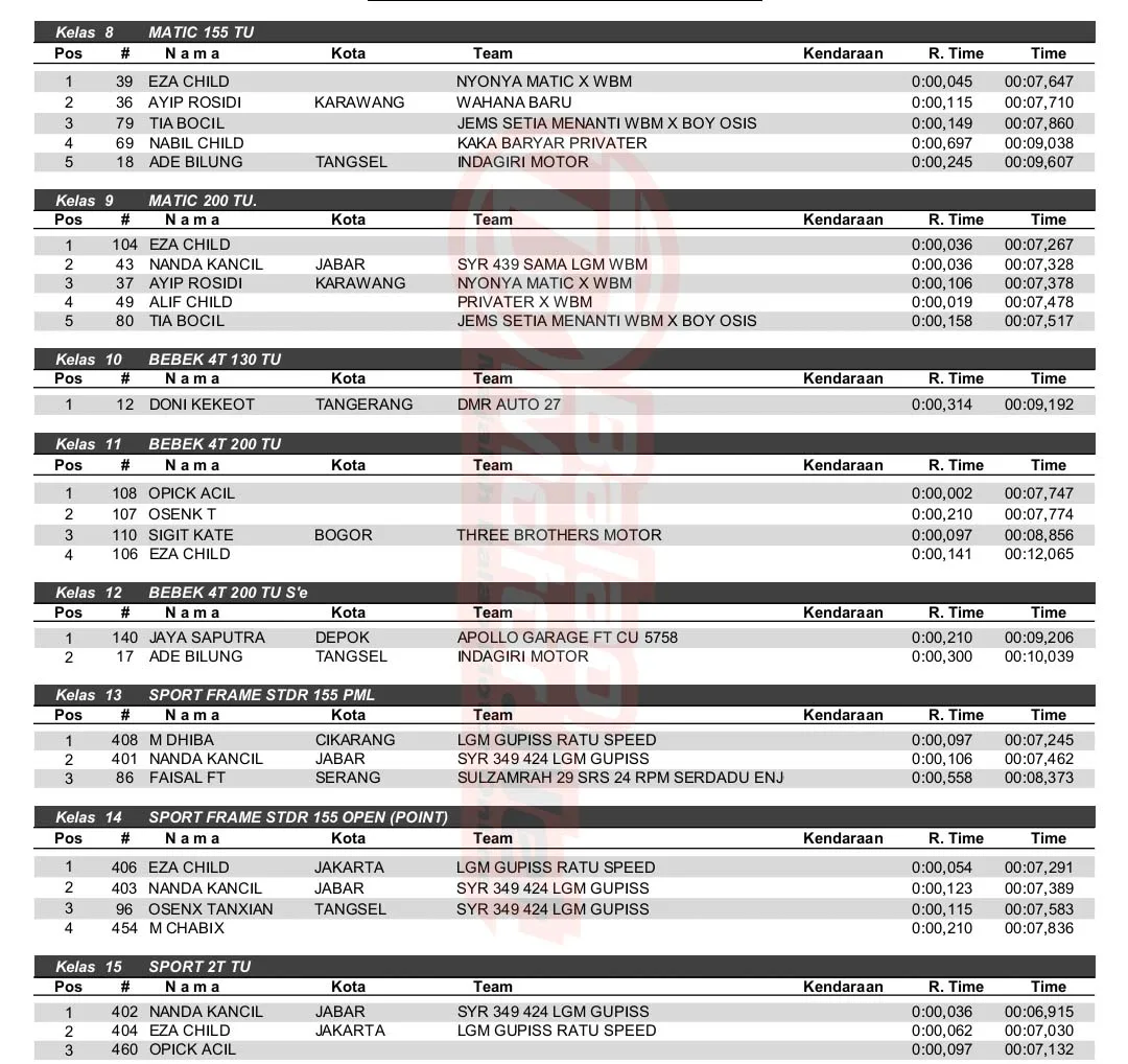 BalapMotor.Net – Berikut merupakan hasil kejuaraan balap lurus 201m dan 402m yang berlangsung di sirkuit NP. Lapter TNI AU Cicangkal pada 2-3 Maret 2024. (***)