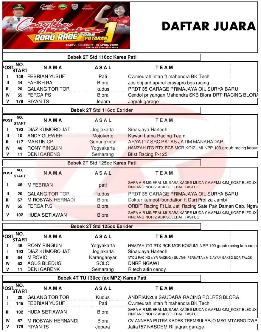 BalapMotor.Net – Berikut merupakan hasil juara di hari pertama Kejuaraan Casytha Manahadap Road Race Championship 2025 putaran pembuka yang berlangsung di sirkuit NP. Alun-alun Blora, Jawa Tengah pada Sabtu 12 April 2025. (**)