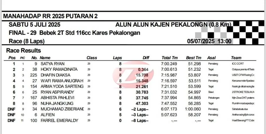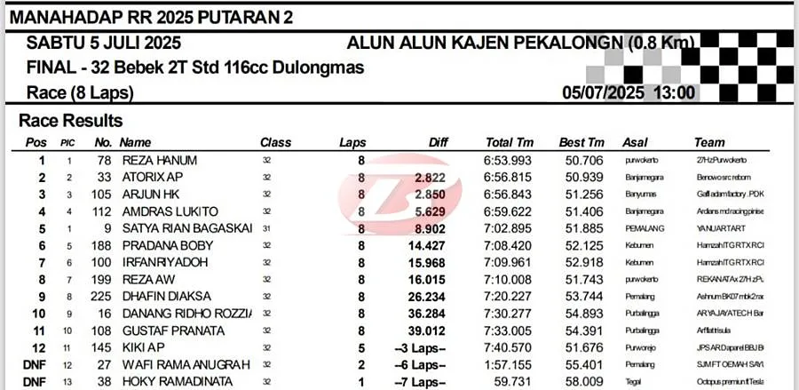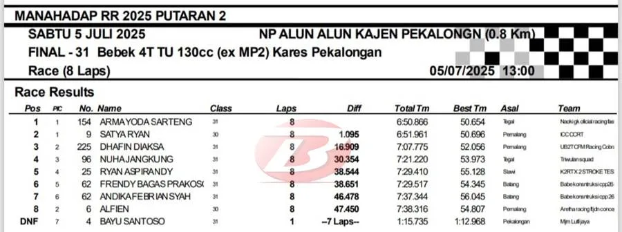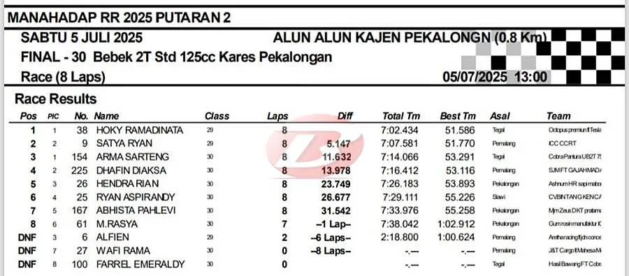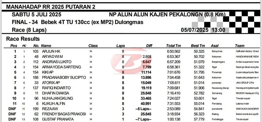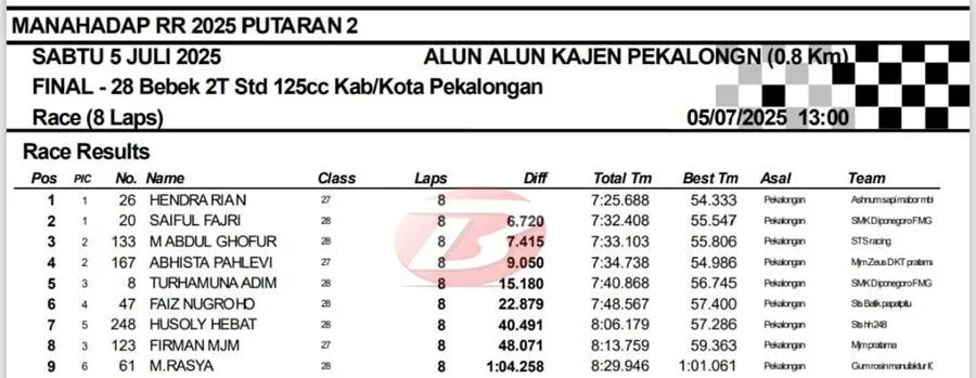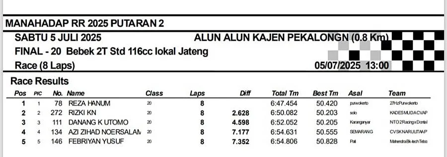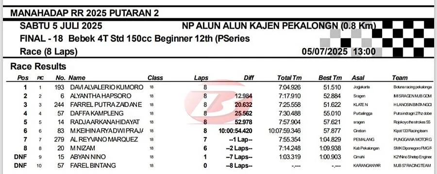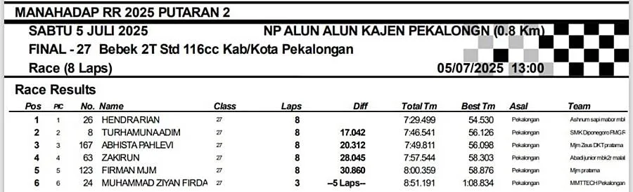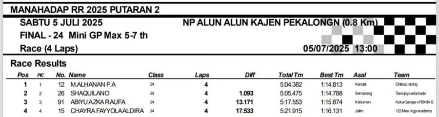 BalapMotor.Net – Berikut merupakan hasil juara kelas yang dipertandingkan di hari pertama kejuaraan Casytha Manahadap Road Race Championship 2025 seri kedua yang berlangsung di sirkuit NP. Alun-alun Kajen, Pekalongan, Jawa Tengah pada Sabtu 5 Juli 2025. (**)