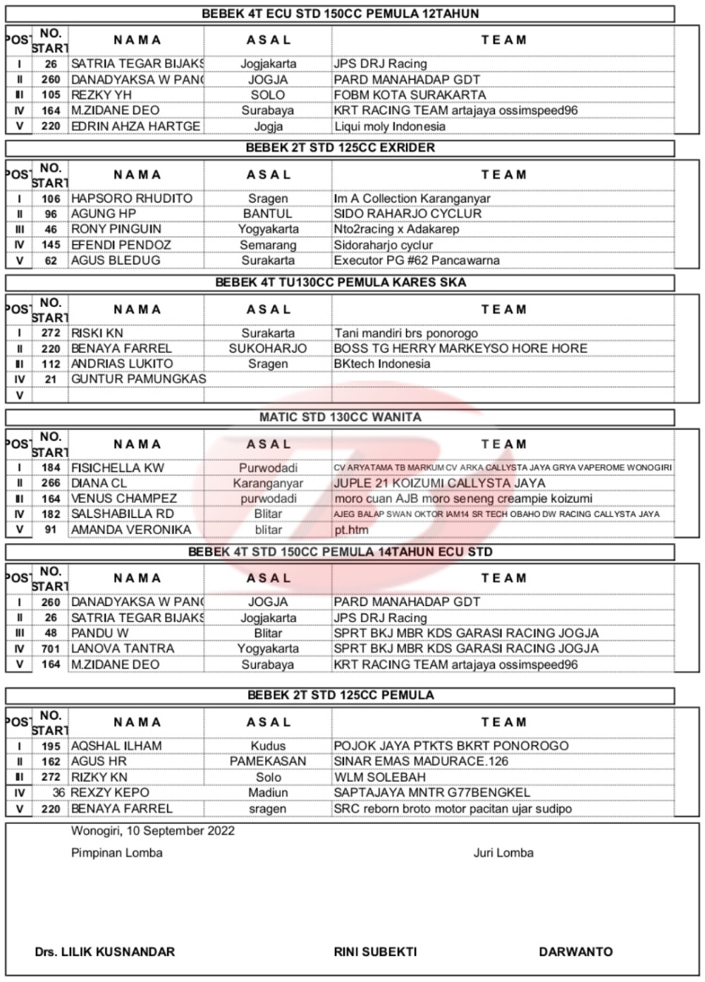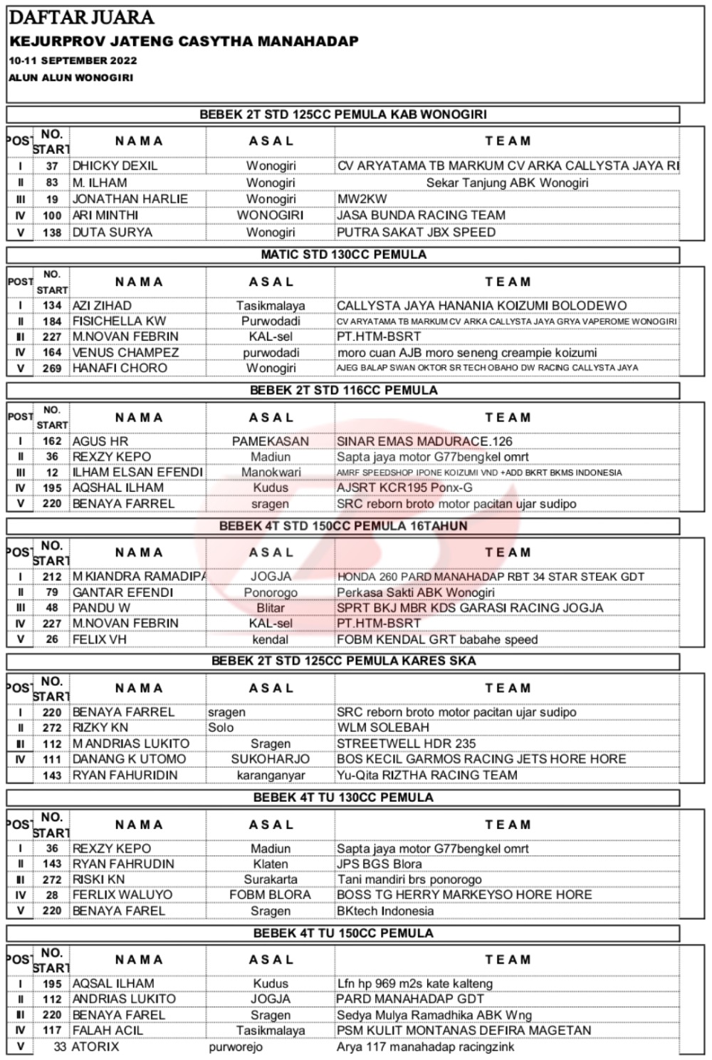 BalapMotor.Net – Berikut merupakan hasil juara kejuaraan balap motor dengan tajuk Kejurprov Jateng Casytha Manahadap Road Race Seri 3 yang berlangsung di Alun-alun Wonogiri pada Sabtu 10 September 2022.