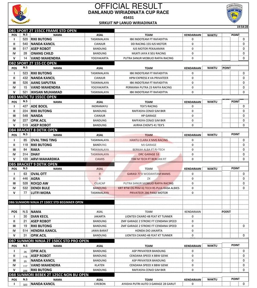 BalapMotor.Net – Berikut merupakan hasil lengkap kejuaraan balap lurus Danlanud Wiriadinata Cup Race yang berlangsung di sirkuit NP. Lanud Wiriadinata, Tasikmalaya, Jawa Barat pada 18- 19 Mei 2024. (***)