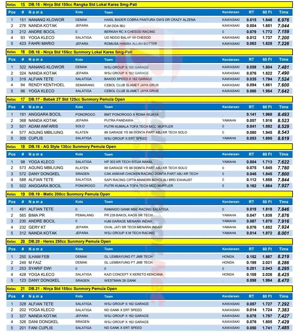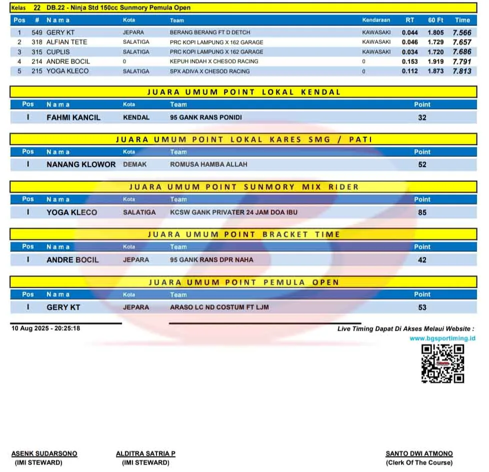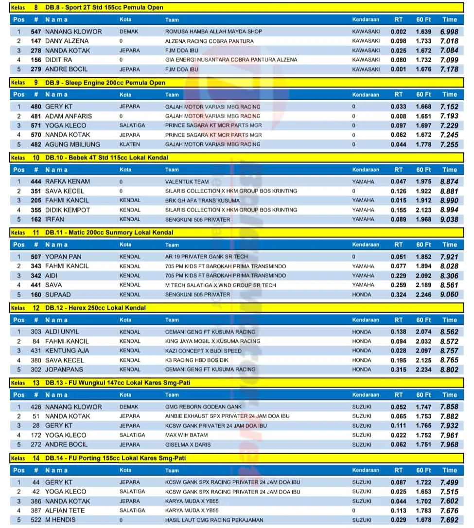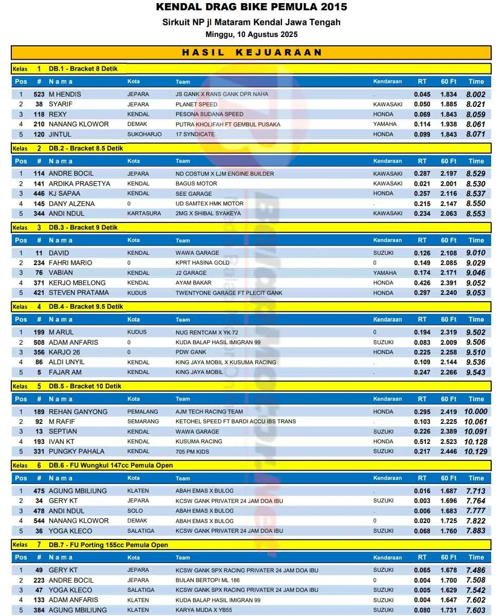 BalapMotor.Net – Berikut merupakan hasil lengkap kejuaraan balap lurus Kendal Drag Bike Pemula 2025 yang berlangsung di sirkuit NP. Jl. Mataram Kendal, Jawa Tengah pada 10 Agustus 2025. (**)