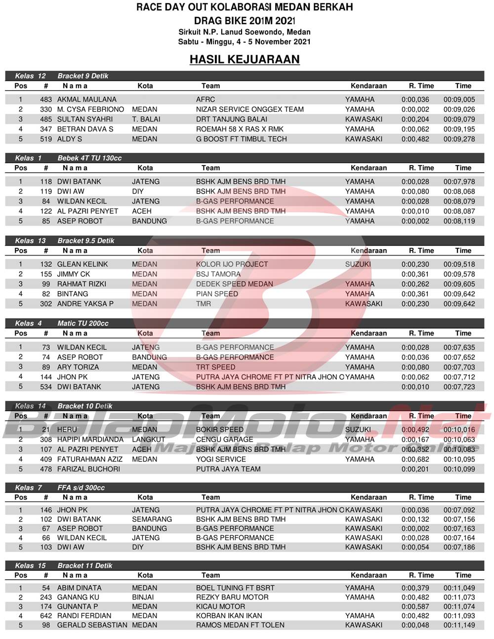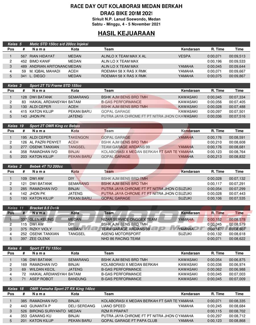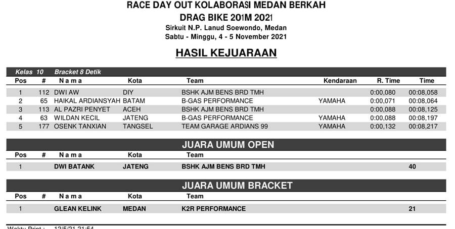 BalapMotor.Net – Berikut merupakan hasil juara dari gelaran Race Day Out Kolaborasi Medan Berkah Drag Bike 201 Meter 2021 yang berlangsung di Lanud Soewondo, Kota Medan, Sumut pada 4-5 Desember 2021. | Chan