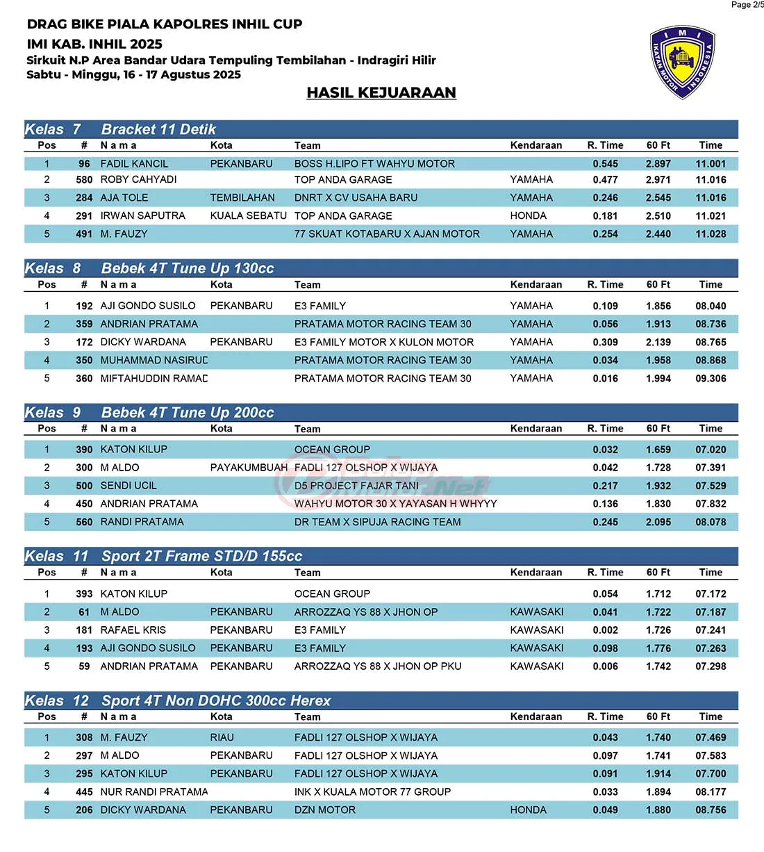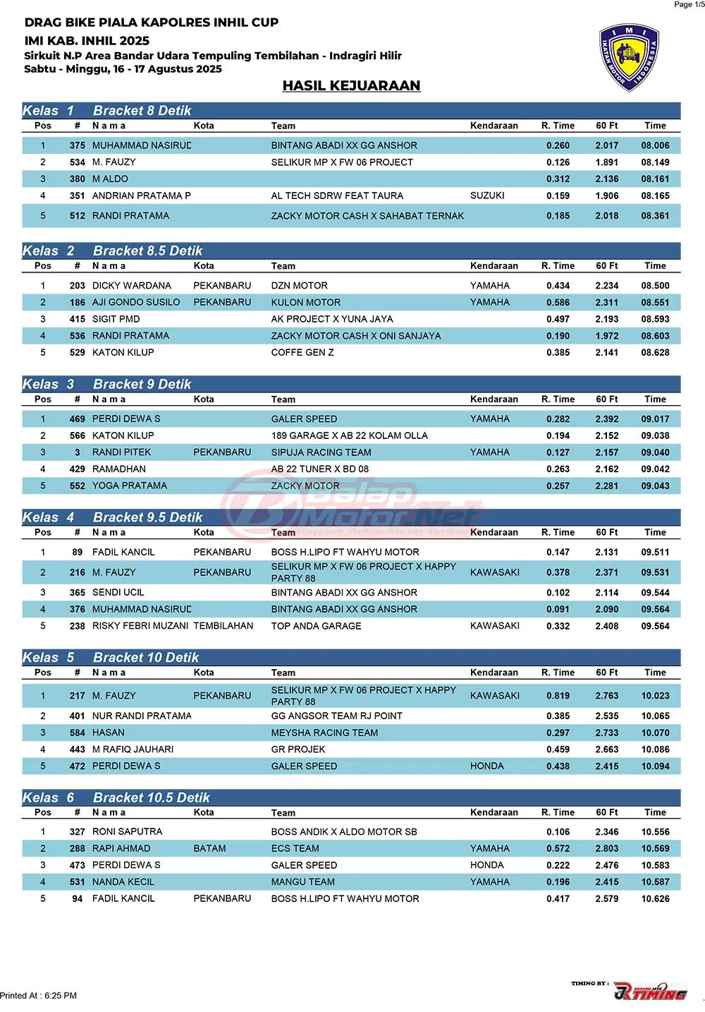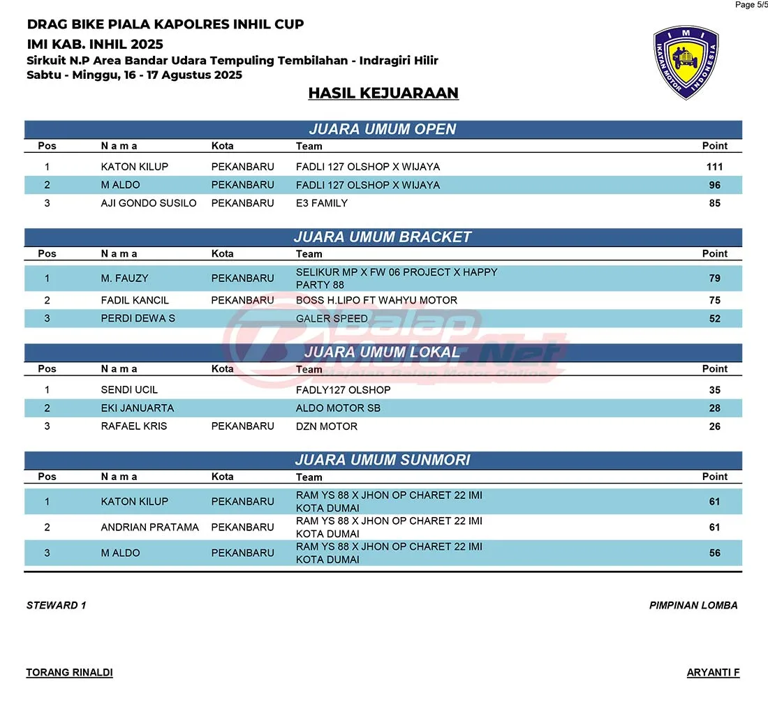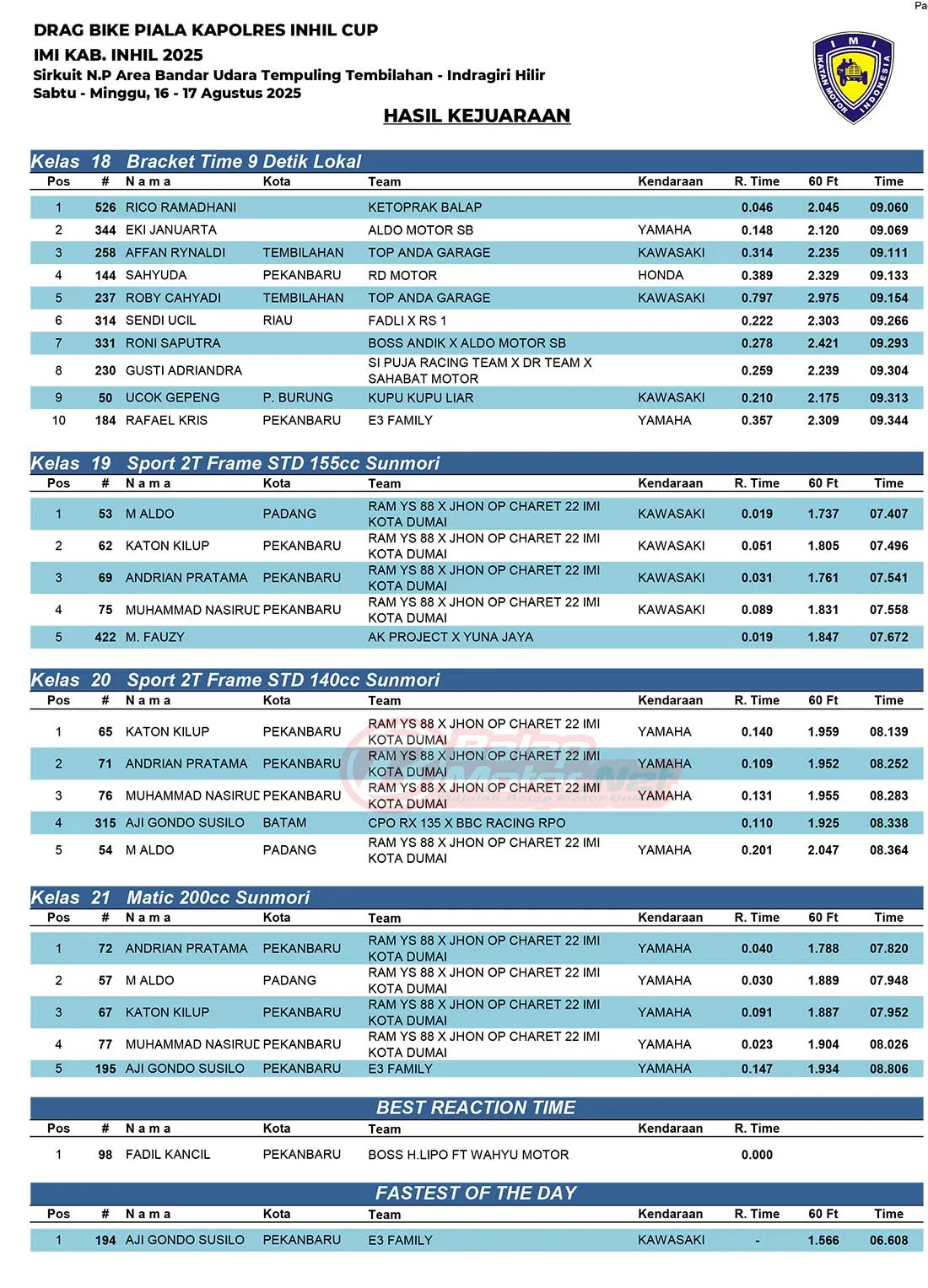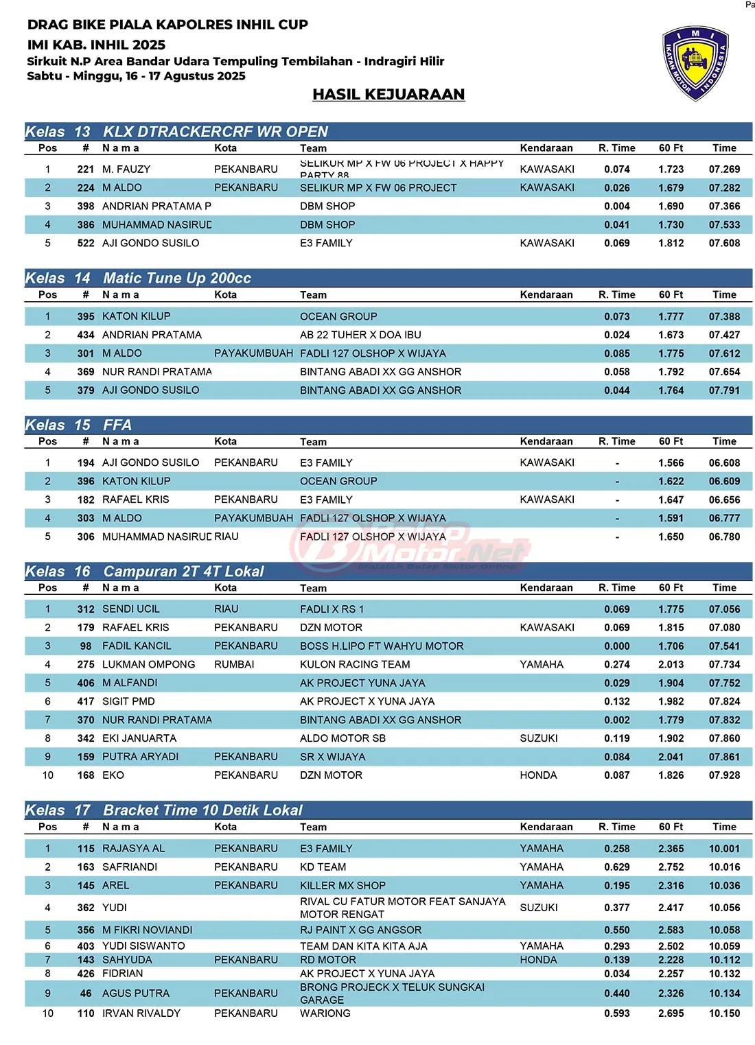 BalapMotor.Net – Berikut merupakan hasil juara dari gelaran Drag Bike Piala Kapolres Indragiri Hilir (Inhil) IMI Kab.Inhil 2025 yang berlangsung di Sirkuit NP Area Bandara Tempuling Tembilahan, Indragiri Hilir, Riau pada 16-17 Agustus 2025. (Halim)