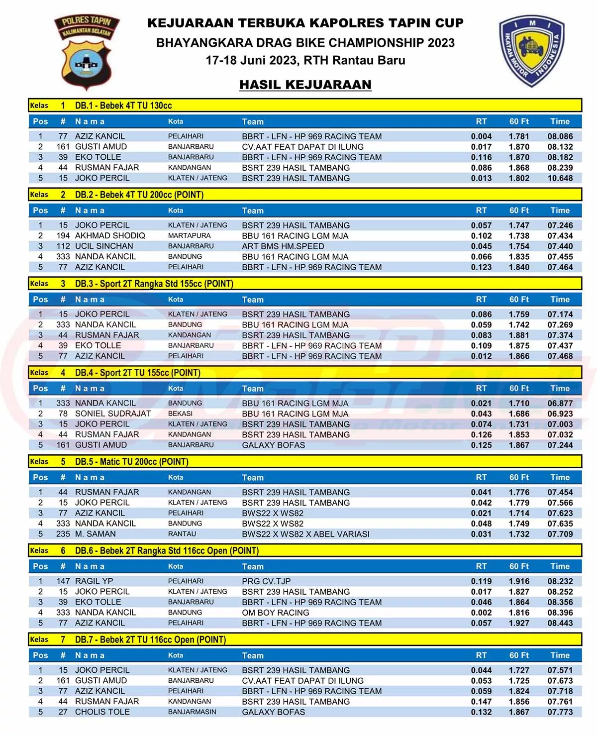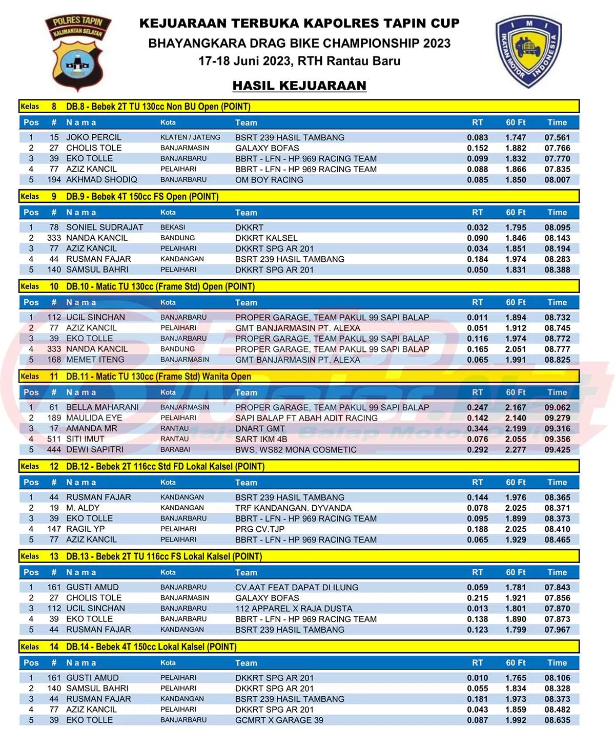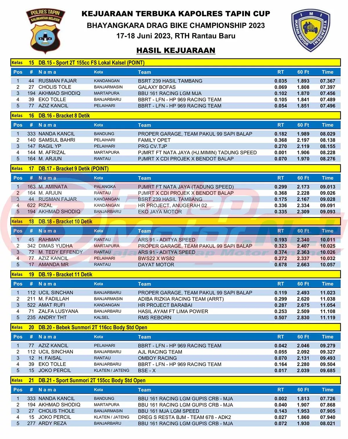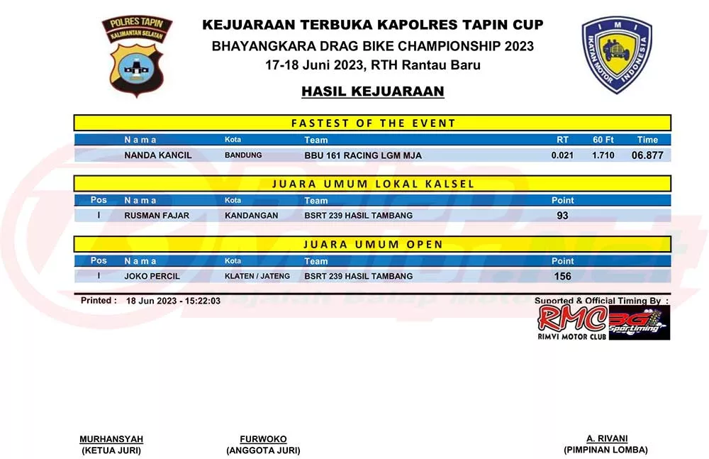 BalapMotor.Net – Berikut merupakan hasil juara dari Kejuaraan Terbuka Kapolres Tapin Cup Bhayangkara Drag Bike Championship 2023 yang digelar di sirkuit NP Ruang Terbuka Hijau (RTH) Rantau Baru, Kabupaten Tapin, Kalsel pada 17-18 Juni 2023. (*)