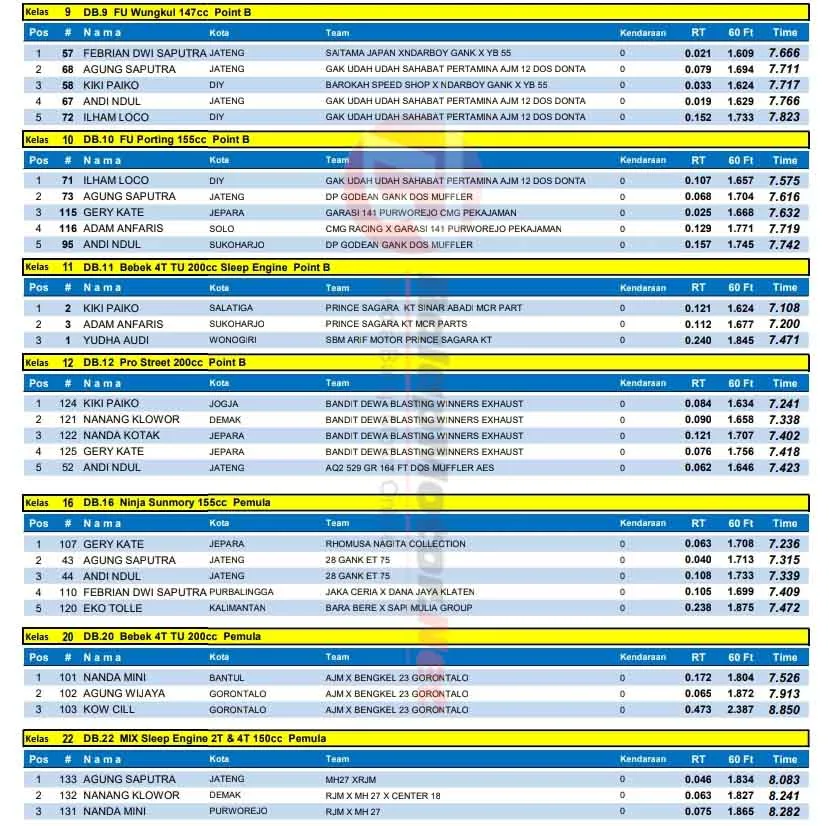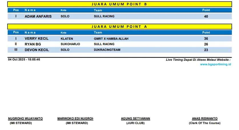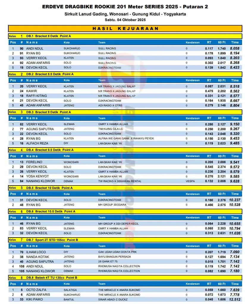 BalapMotor.Net – Berikut merupakan hasil lengkap kejuaraan balap lurus Erdeve Drag Bike Rookie putaran 2 yang berlangsung di sirkuit NP. Lanud Gading, Wonosari, Yogyakarta pada Sabtu 4 Oktober 2025. (**)