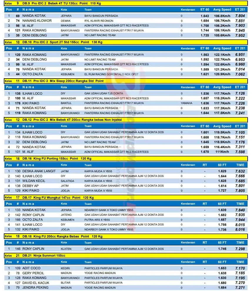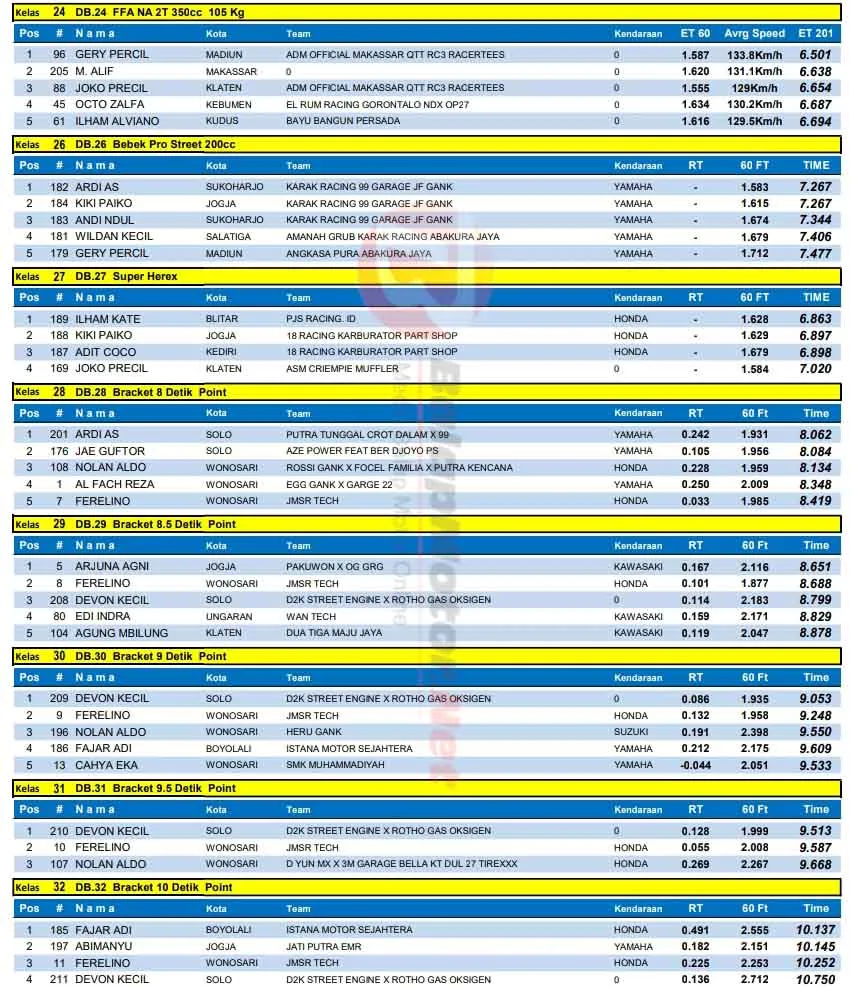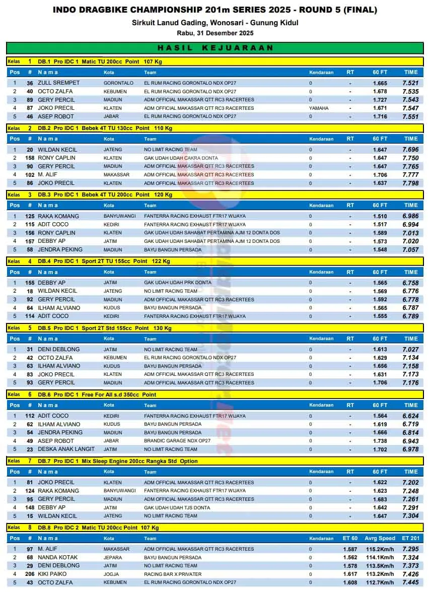 BalapMotor.Net – Berikut merupakan hasil lengkap kejuaraan Kawahara Djava K2R IDC Drag Bike Championship 2025 putaran final yang berlangsung di sirkuit NP. Lanud Gading, Wonosari, Yogyakarta pada Rabu 31 Desember 2025. (**)