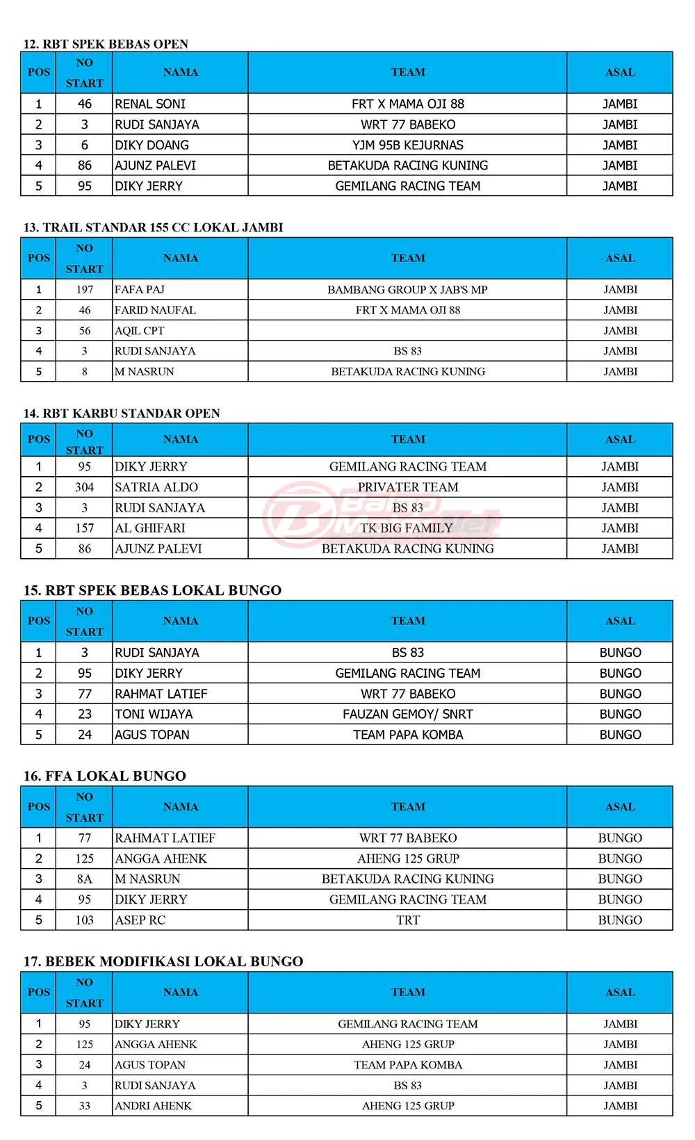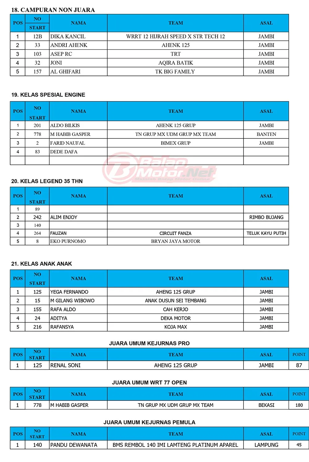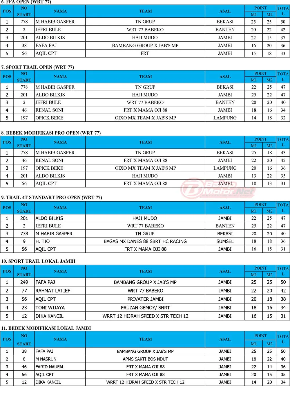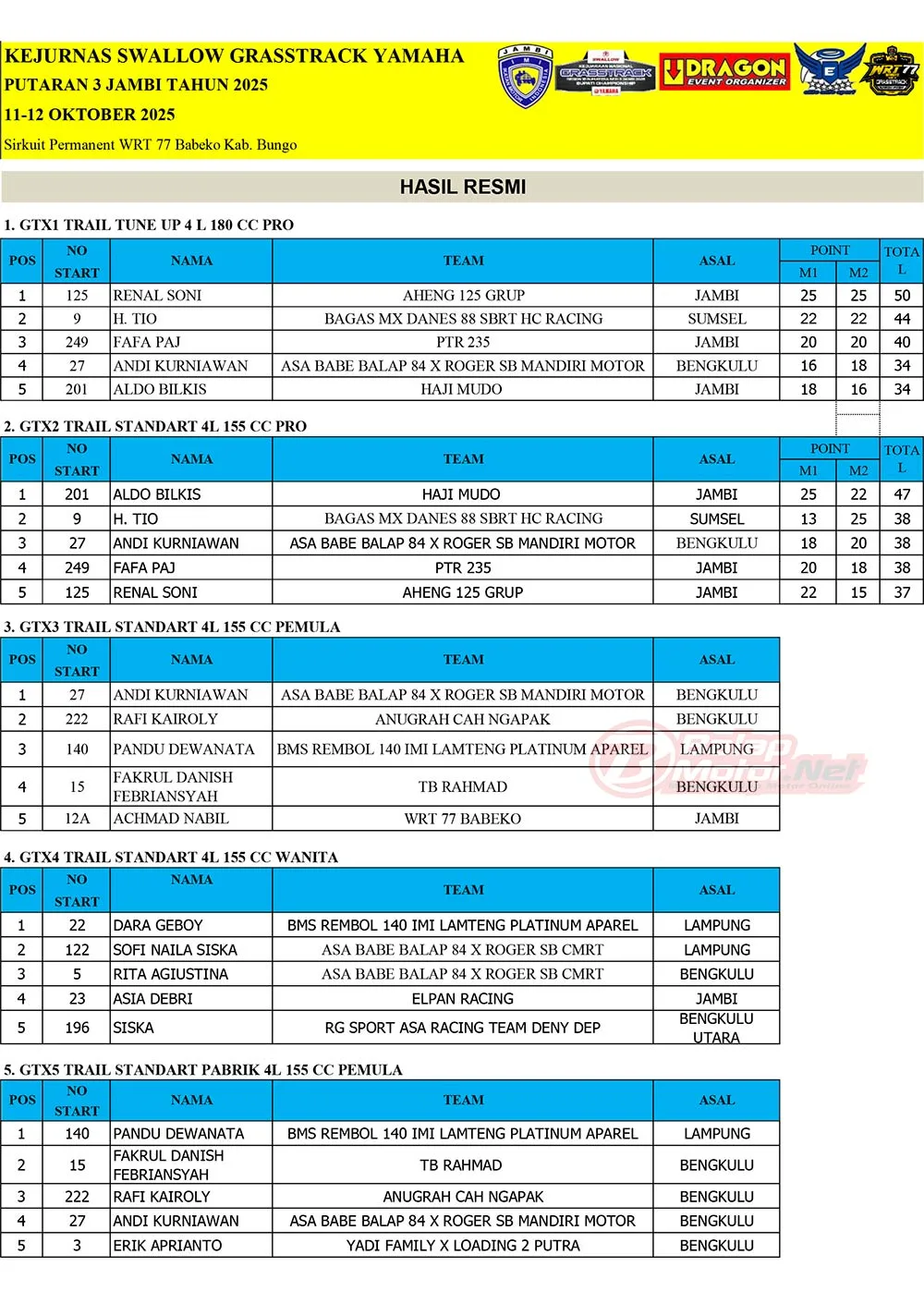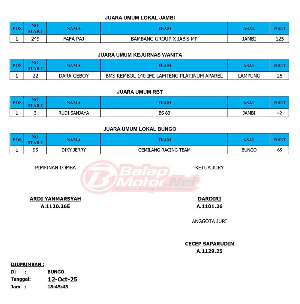 BalapMotor.Net – Berikut merupakan hasil juara dari gelaran Final Kejurnas Grasstrack Region 1B 2025 yang berlangsung di sirkuit Permanen WRT77 Babeko, Kabupaten Bungo, Jambi pada 11-12 Oktober 2025. (Budy)