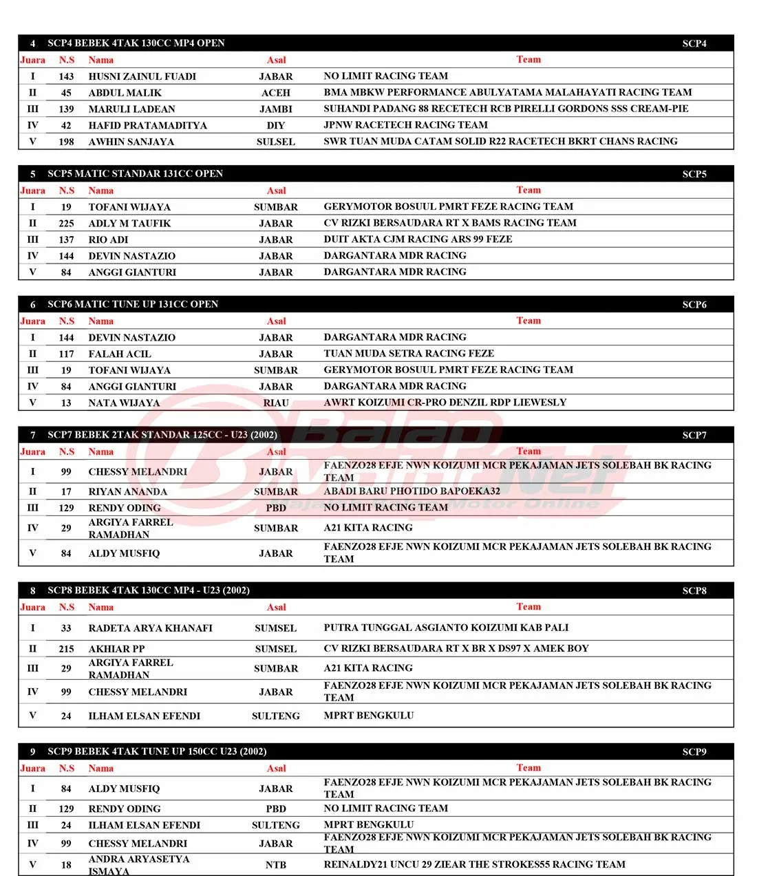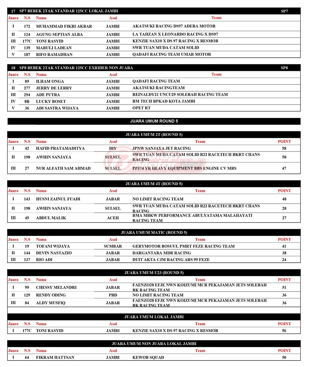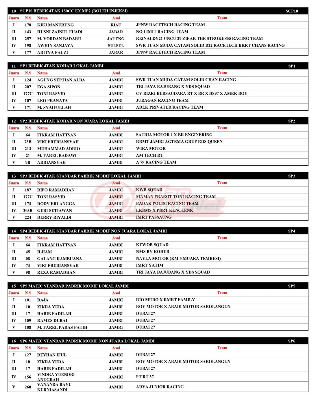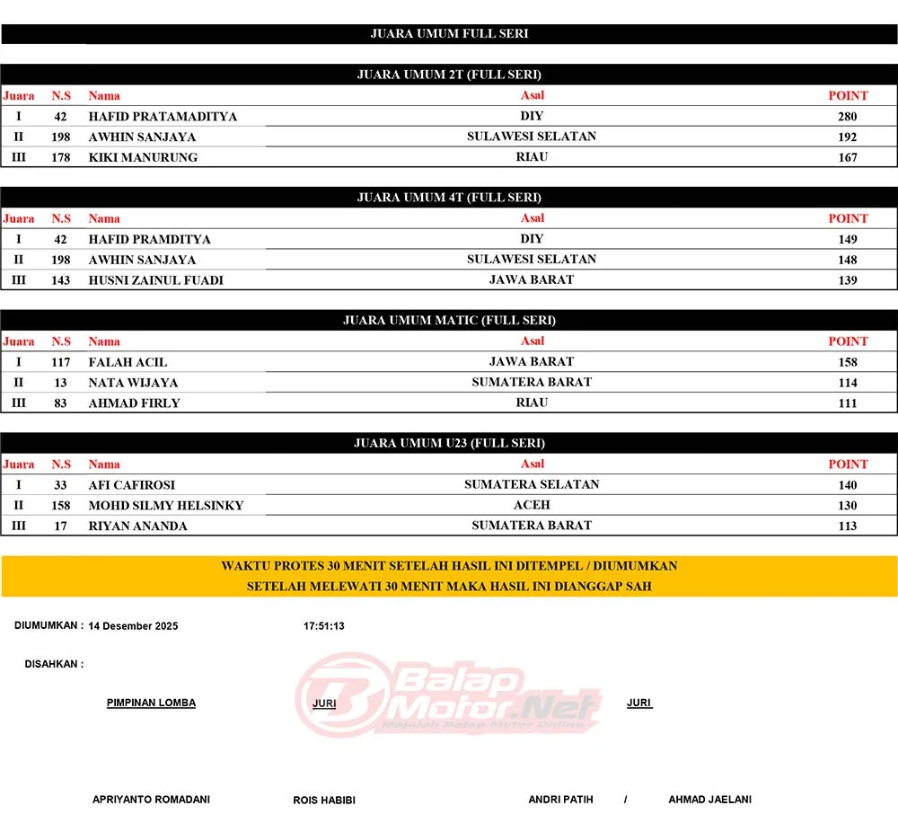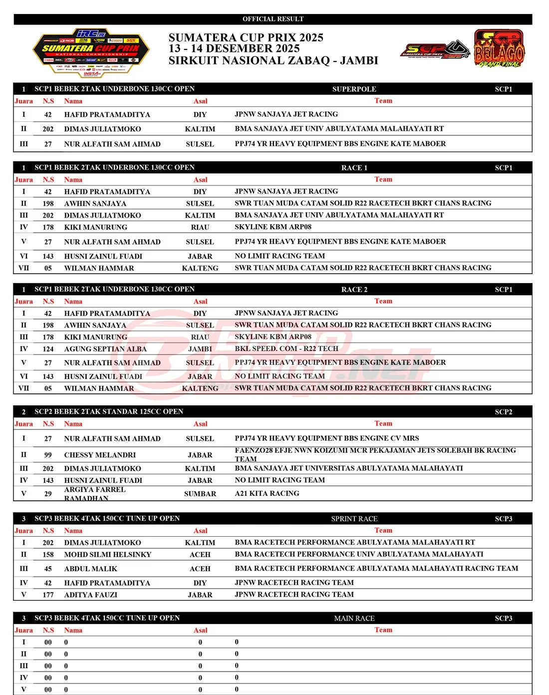 BalapMotor.Net – Berikut merupakan hasil juara dari gelaran ronde final Sumatera Cup Prix (SCP) 2025 yang berlangsung di sirkuit Nasional Zabaq, Kabupaten Tanjung Jabung Timur, Provinsi Jambi pada 13-14 Desember 2025. (**)