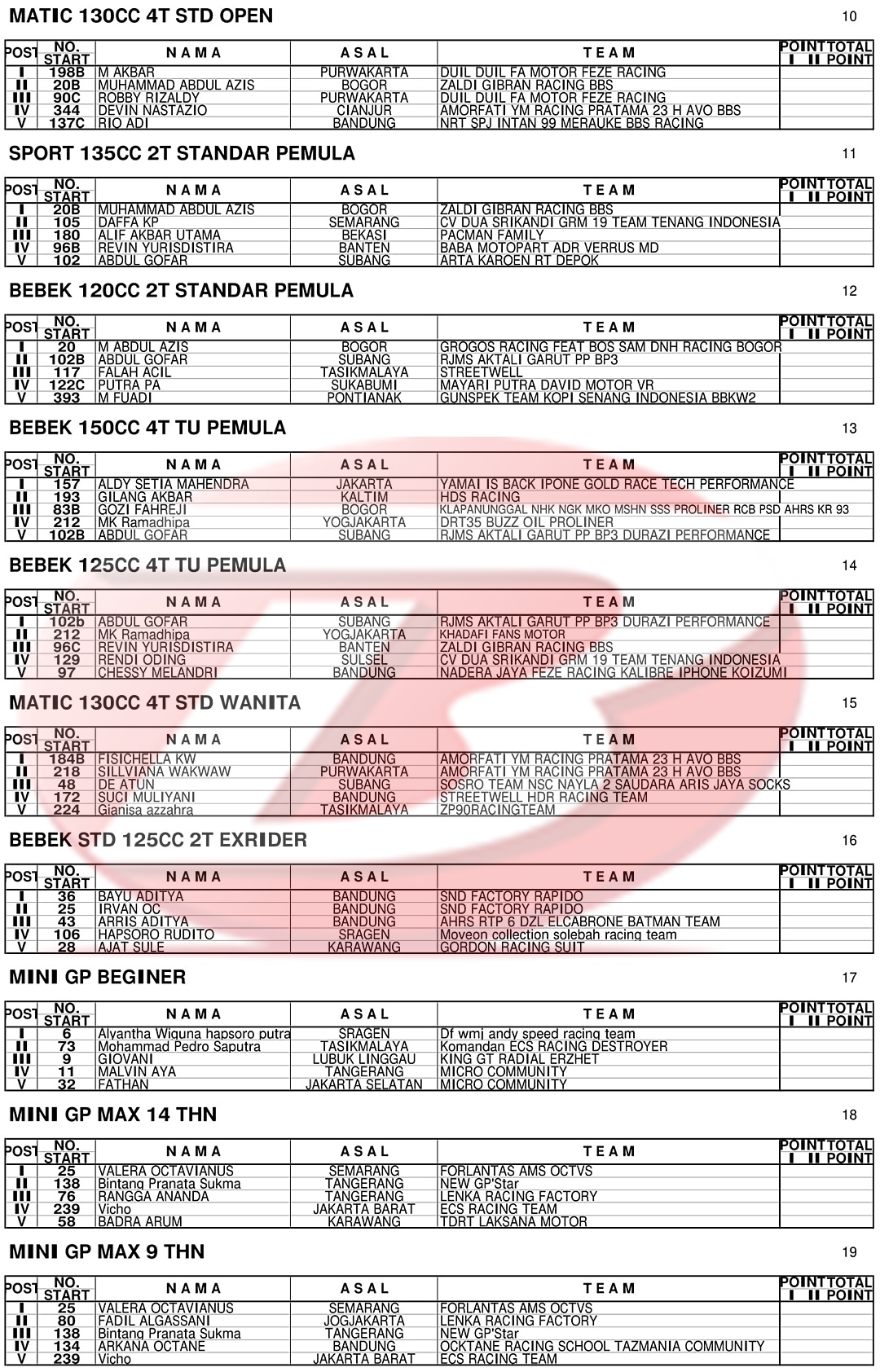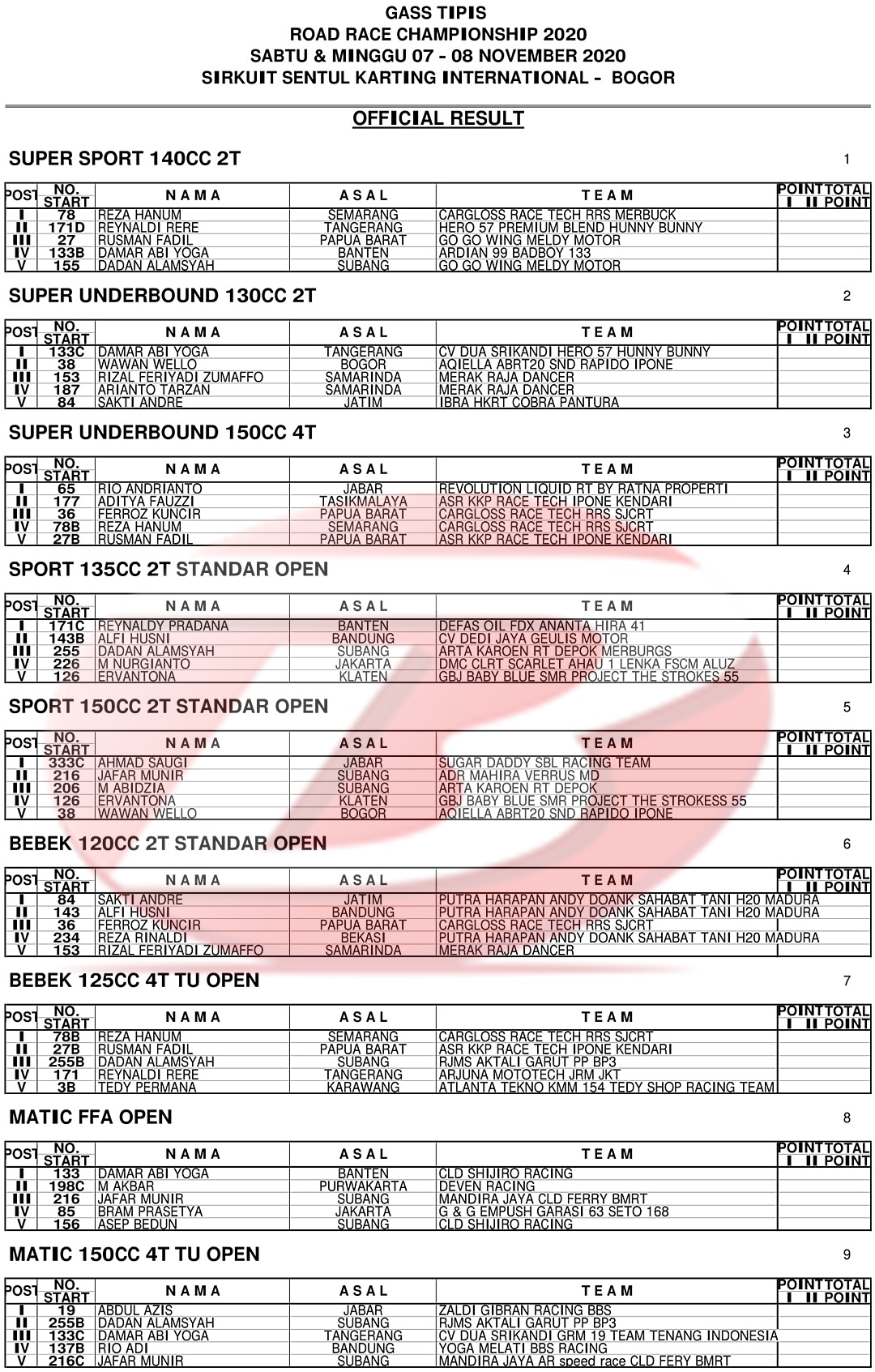 BalapMotor.Net – Berikut kami paparkan hasil kejuaraan balap motor bertajuk Gass Tipis Racing (GTR) Championship 2020 putaran 1 yang berlangsung di sirkuit Sentul Karting, Bogor pada Minggu, 8 November 2020.