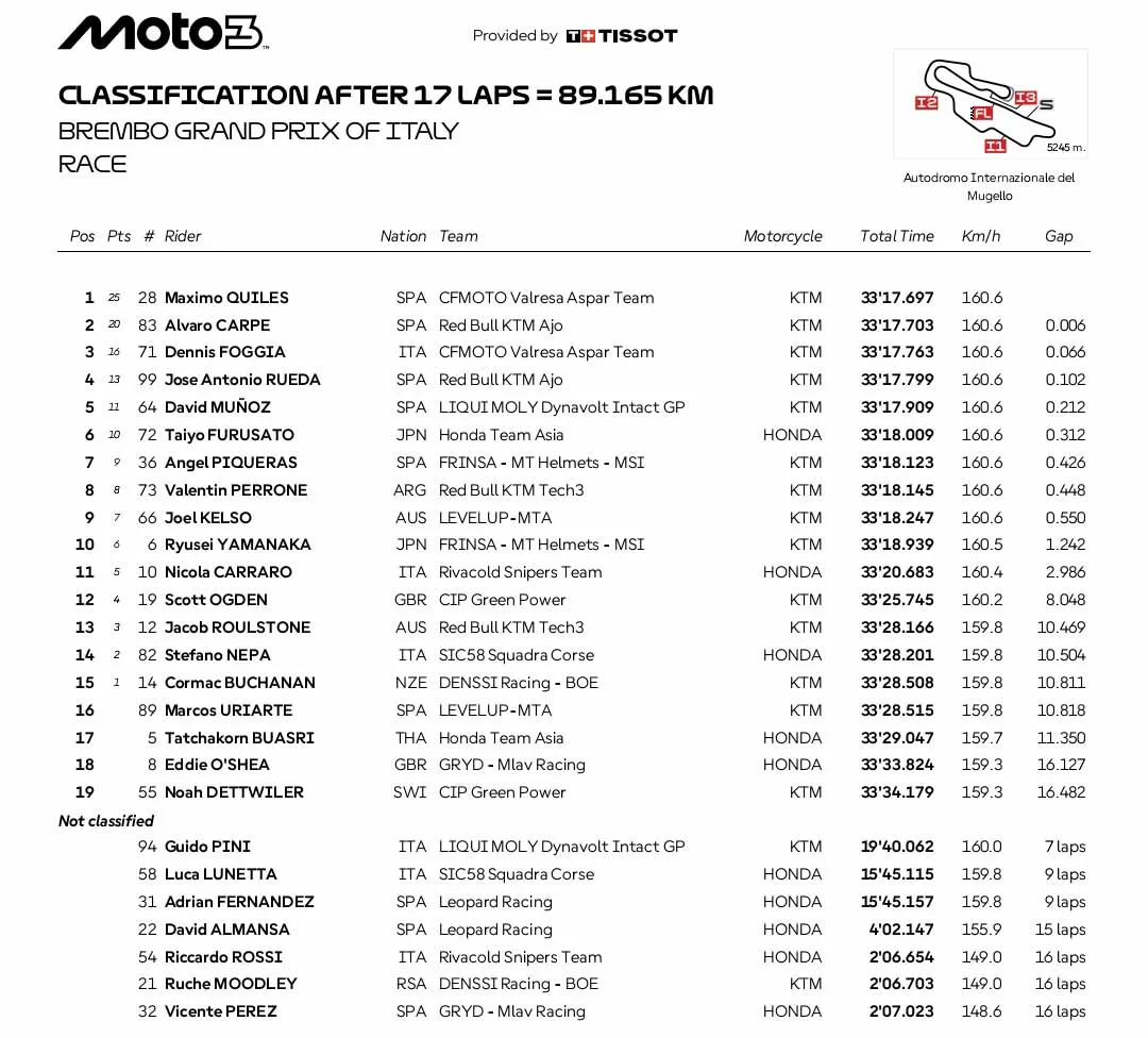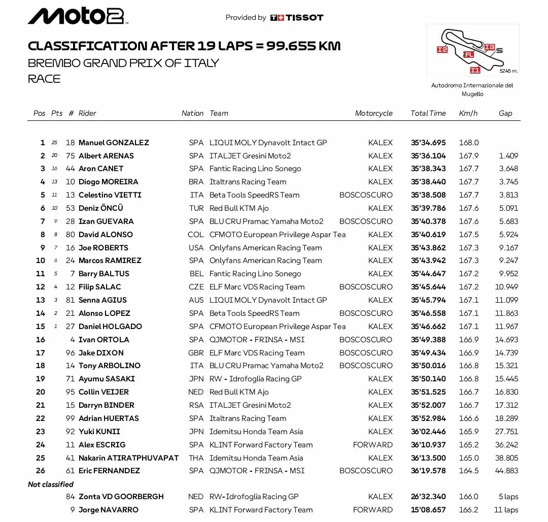 BalapMotor.Net – Berikut merupakan hasil race utama kejuaraan dunia MotoGP, Moto2 dan Moto3 yang berlangsung di sirkuit Mugello, Italia pada 20-22 Juni 2025. (**)