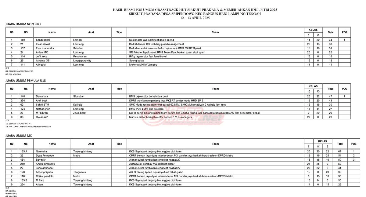 BalapMotor.Net – Berikut merupakan hasil resmi dan juga data hasil juara umum dari gelaran Grasstrack HUT Sirkuit Pradana & Memeriahkan Idul Fitri yang berlangsung di sirkuit Pradana, Desa Sripendowio, Bangun Rejo Lampung Tengah pada 12-13 April 2025. (Budy)