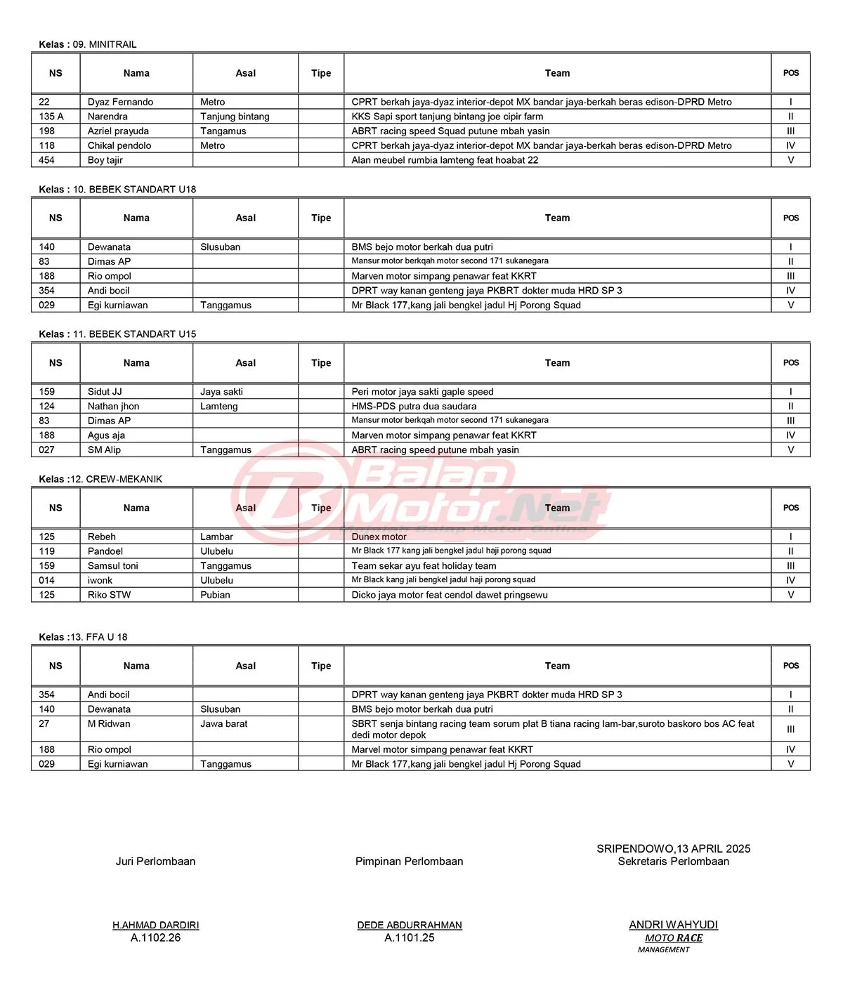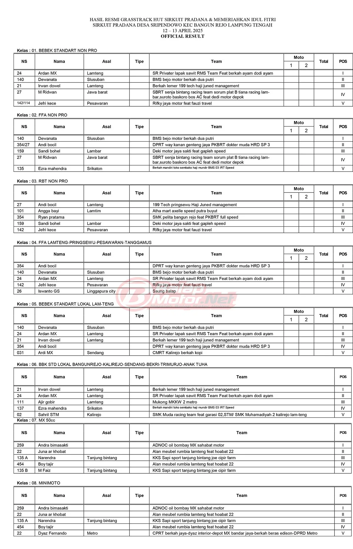 BalapMotor.Net – Berikut merupakan hasil resmi dan juga data hasil juara umum dari gelaran Grasstrack HUT Sirkuit Pradana & Memeriahkan Idul Fitri yang berlangsung di sirkuit Pradana, Desa Sripendowio, Bangun Rejo Lampung Tengah pada 12-13 April 2025. (Budy)