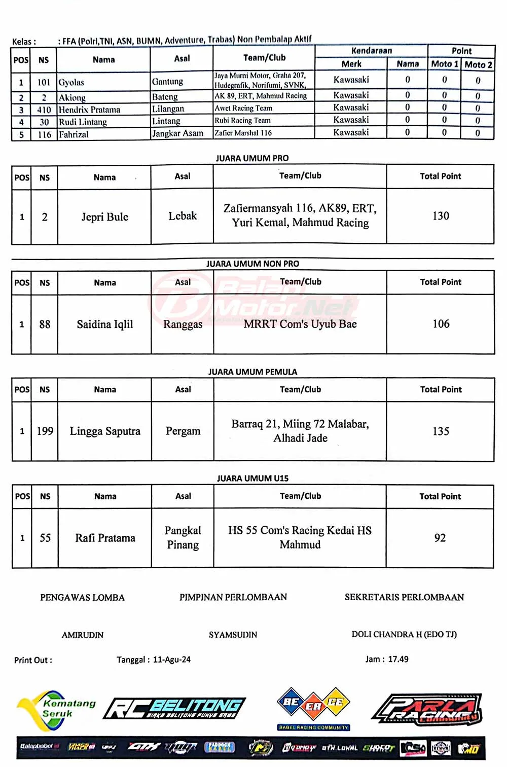 BalapMotor.Net – Berikut merupakan hasil juara dari gelaran Grasstrack Kembiri Menggelegar 2024 yang berlangsung di Circuit Padang Alu-Alu, Desa Kembiri, Belitung, Provinsi Babel pada 10-11 Agustus 2024. (Budy)