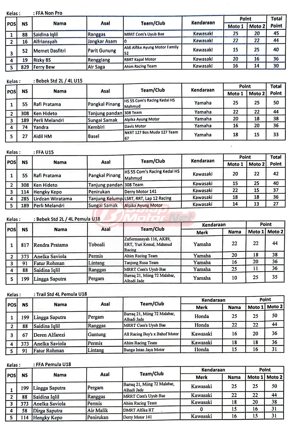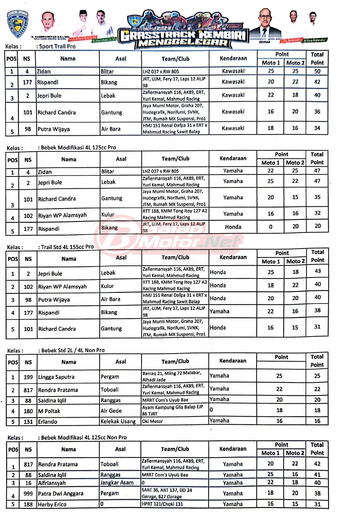 BalapMotor.Net – Berikut merupakan hasil juara dari gelaran Grasstrack Kembiri Menggelegar 2024 yang berlangsung di Circuit Padang Alu-Alu, Desa Kembiri, Belitung, Provinsi Babel pada 10-11 Agustus 2024. (Budy)