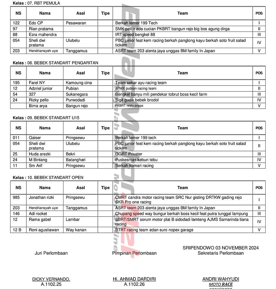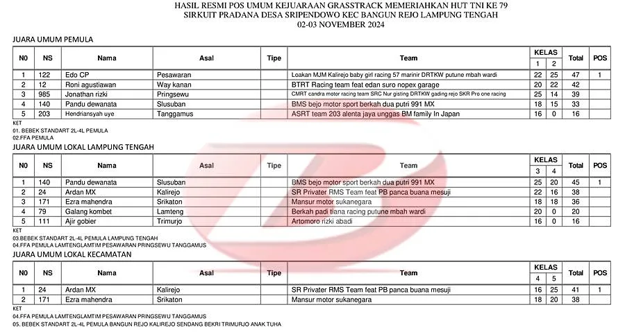Hasil Juara Grasstrack Lampung Tengah 2-3 November 2024