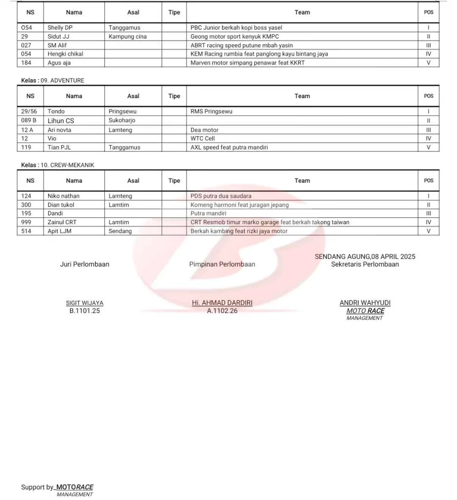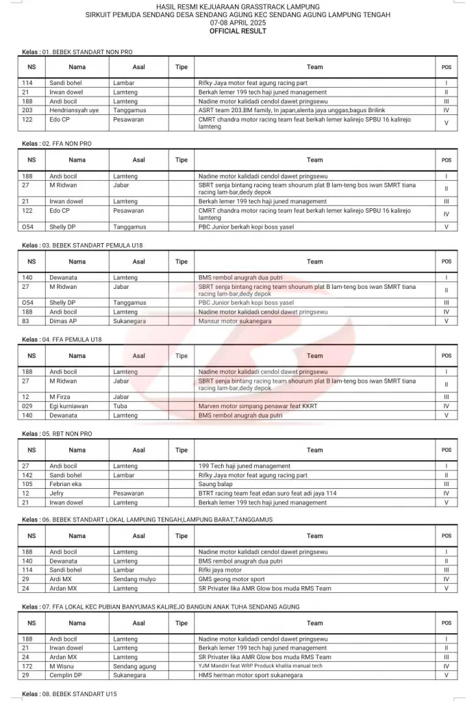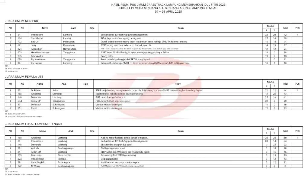 BalapMotor.Net – Berikut merupakan hasil kejuaraan garuk tanah “Grasstrack” Lampung yang berlangsung di sirkuit Pemuda Sendang, Kec. Sendang Agung, Lampung Tengah pada 7-8 April 2025. (**)
