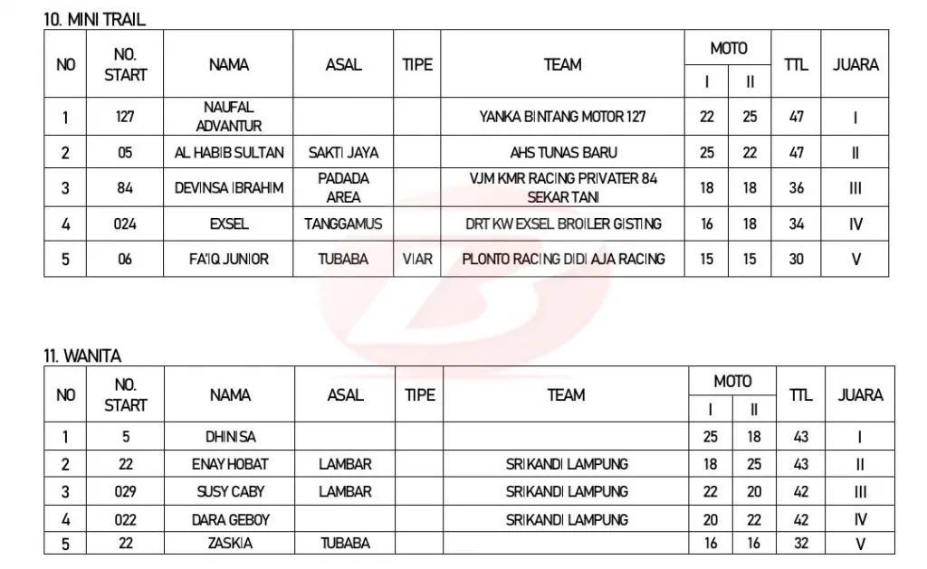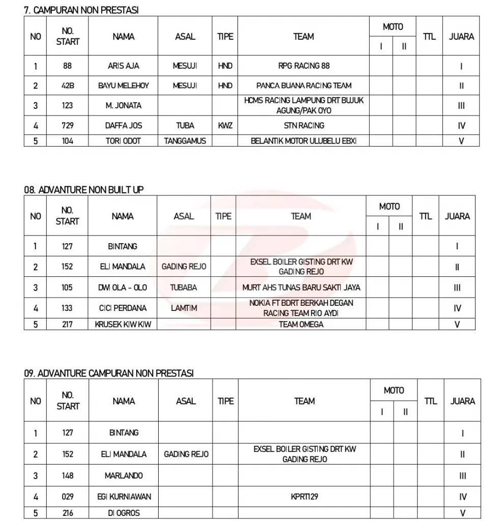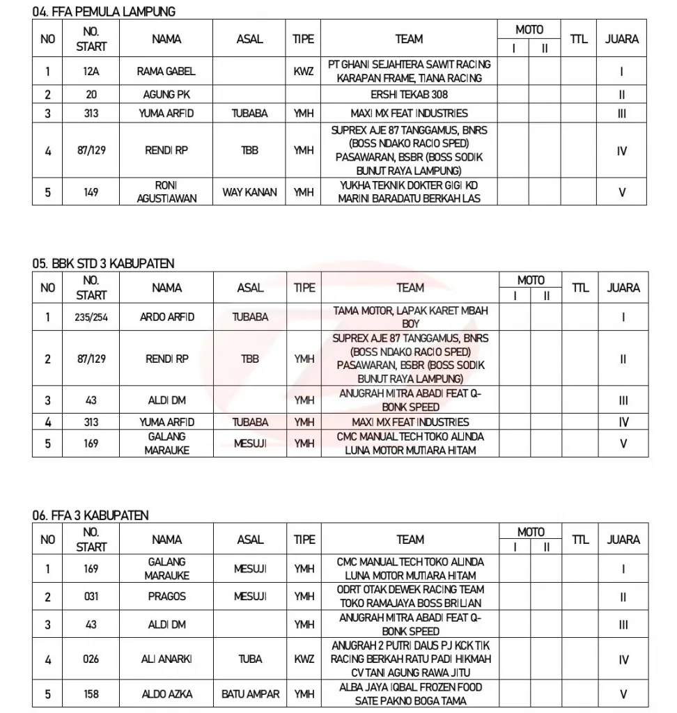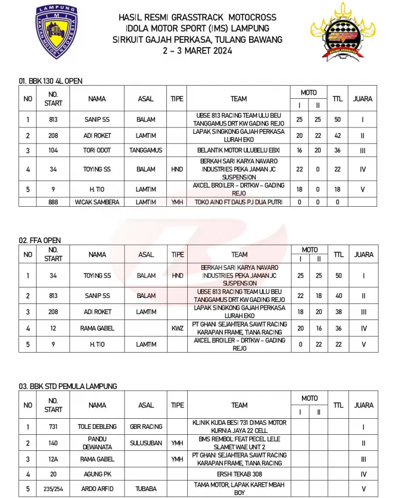 BalapMotor.Net – Berikut merupakan hasil lengkap kejuaraan garuk tanah Grasstrack – Motocross Idola Motor Sport (IMS) Lampung yang berlangsung di sirkuit Gajah Perkasa, Tulang Bawang pada 2-3 Maret 2024. (***)