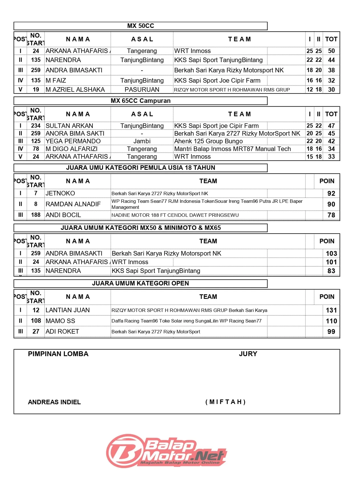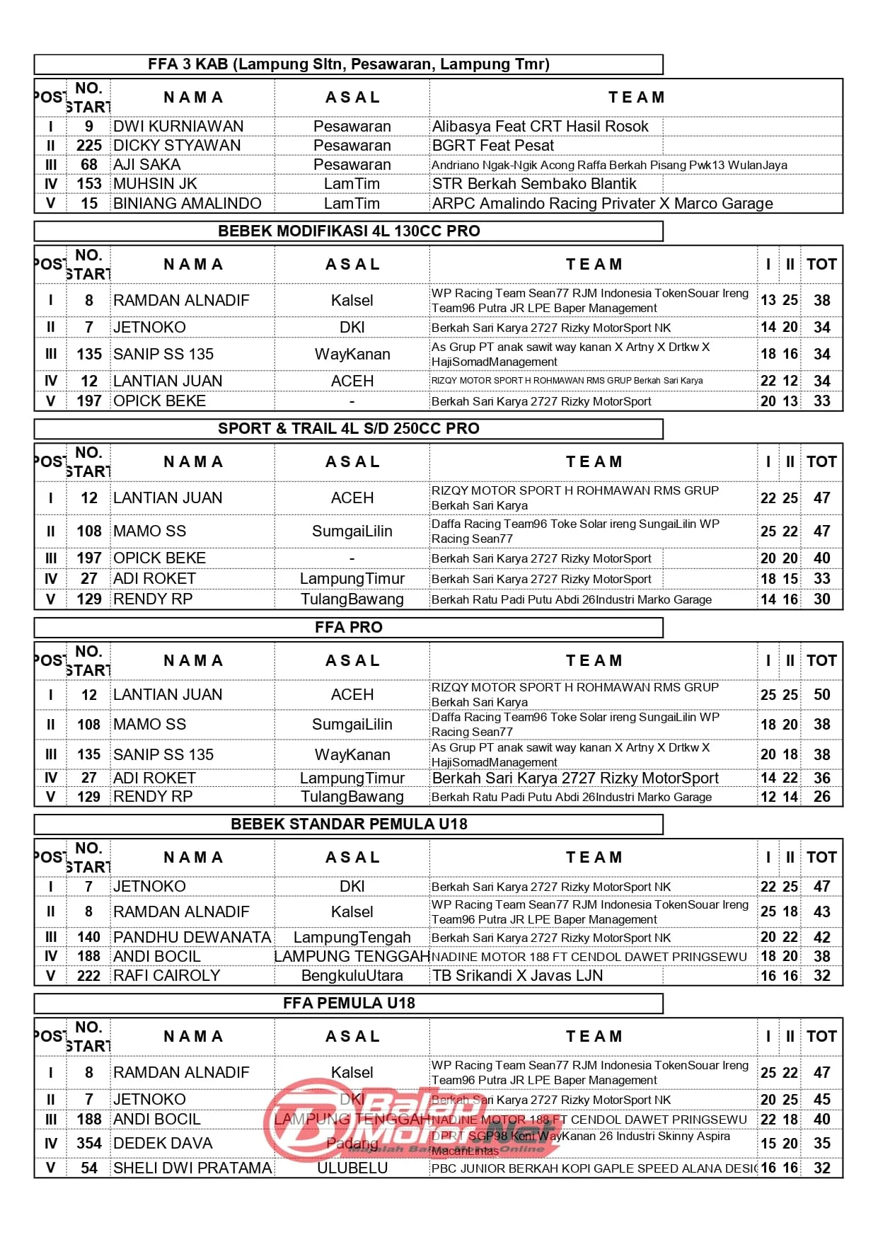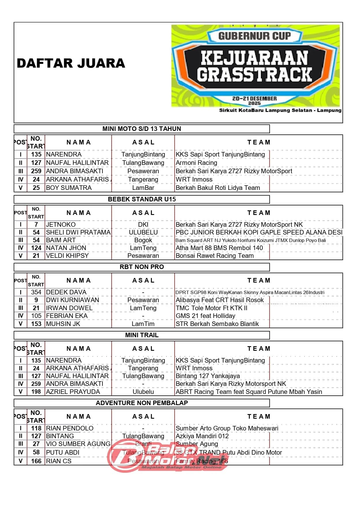 BalapMotor.Net – Berikut merupakan hasil juara dari gelaran Gubernur Cup Grasstrack & Motocross Championship 2025 yang berlangsung di sirkuit WG99 Kotabaru, Lampung Selatan-Lampung pada 20-21 Desember 2025. (Budy)