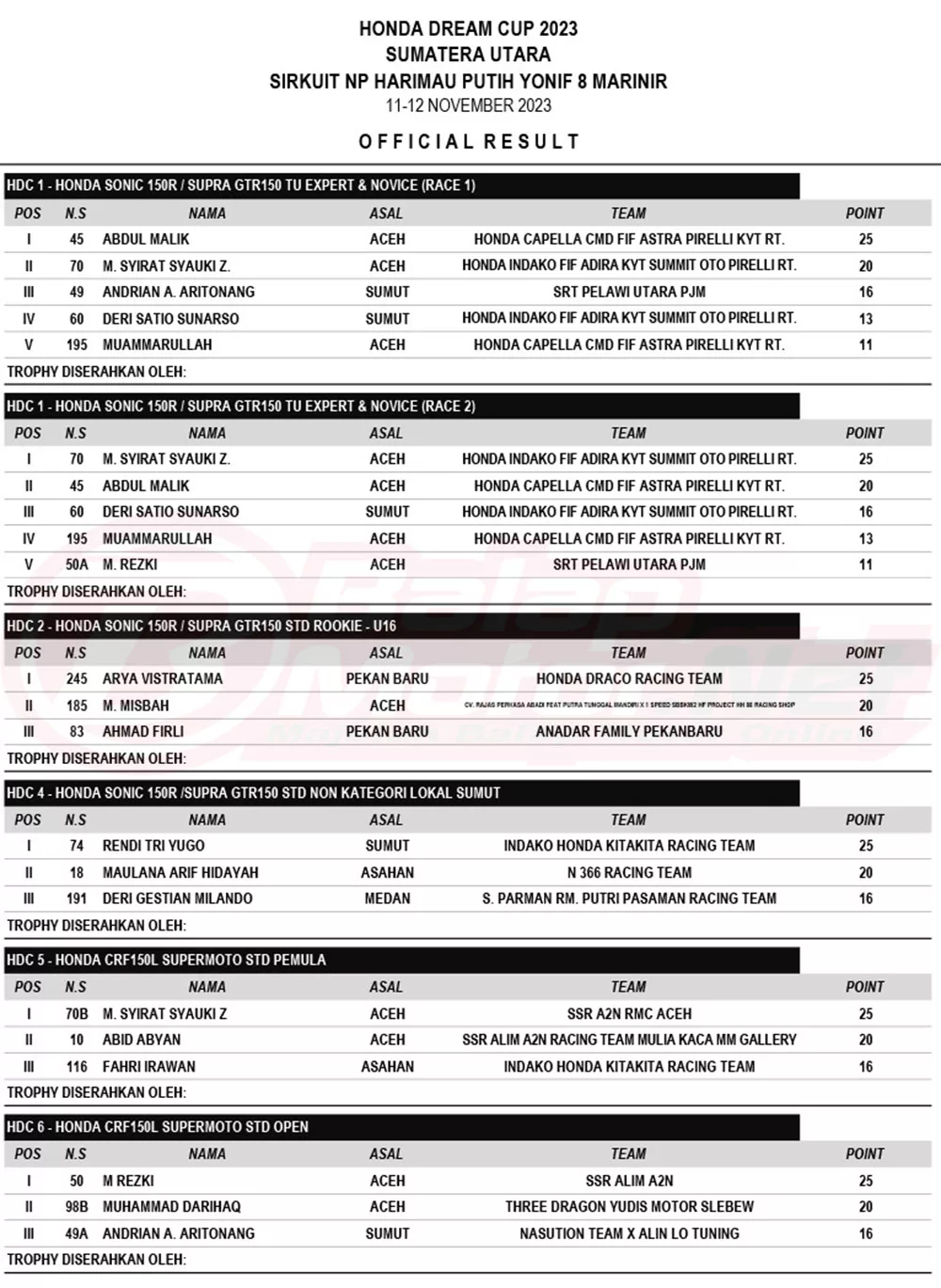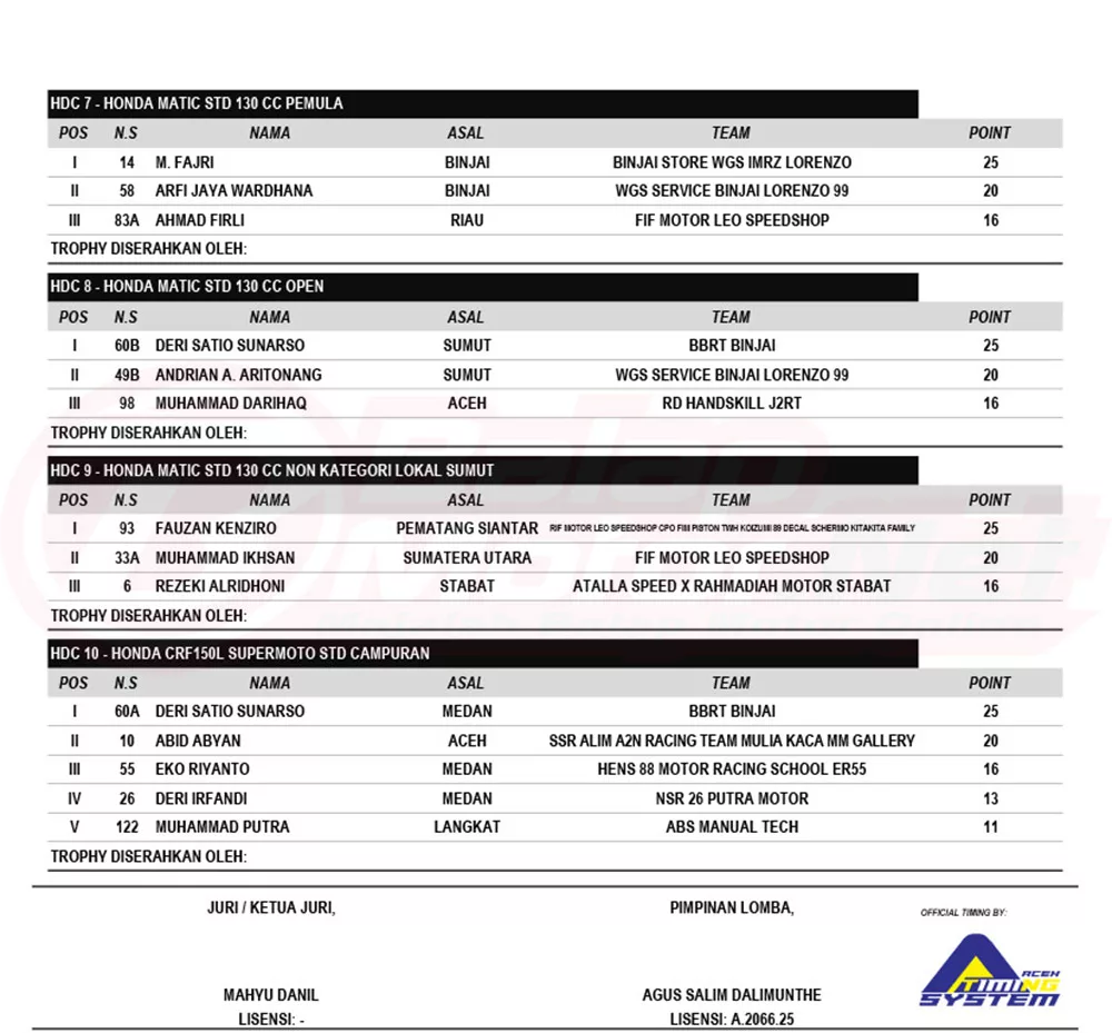 BalapMotor.Net – Berikut merupakan hasil juara dari gelaran Honda Dream Cup (HDC) 2023 Sumatera Utara yang digelar di sirkuit NP Harimau Putih Yonif 8 Marinir, Pangkalan Brandan, Kabupaten Langkat, Sumatera Utara 12 November 2023. (A2M)