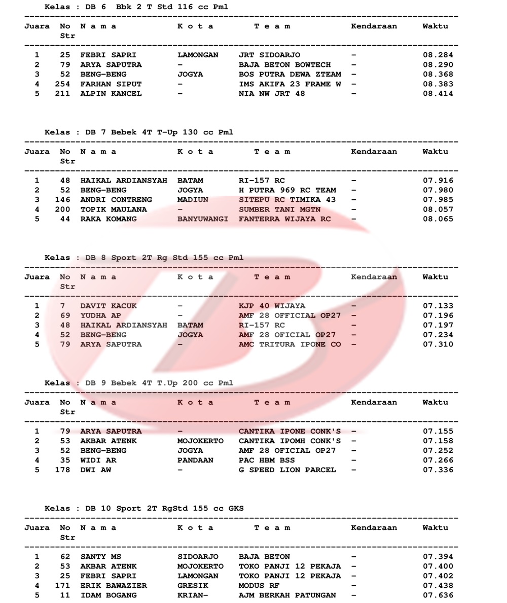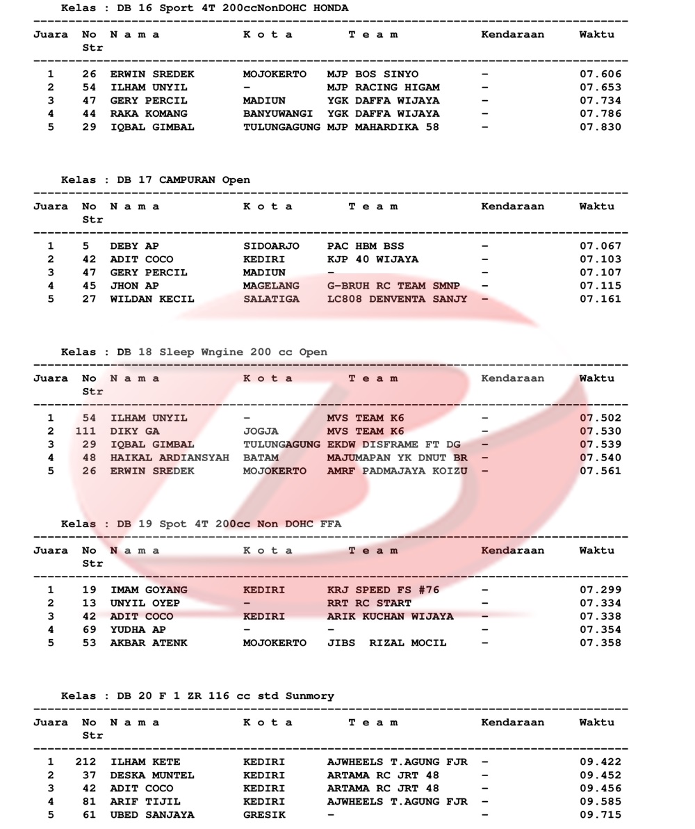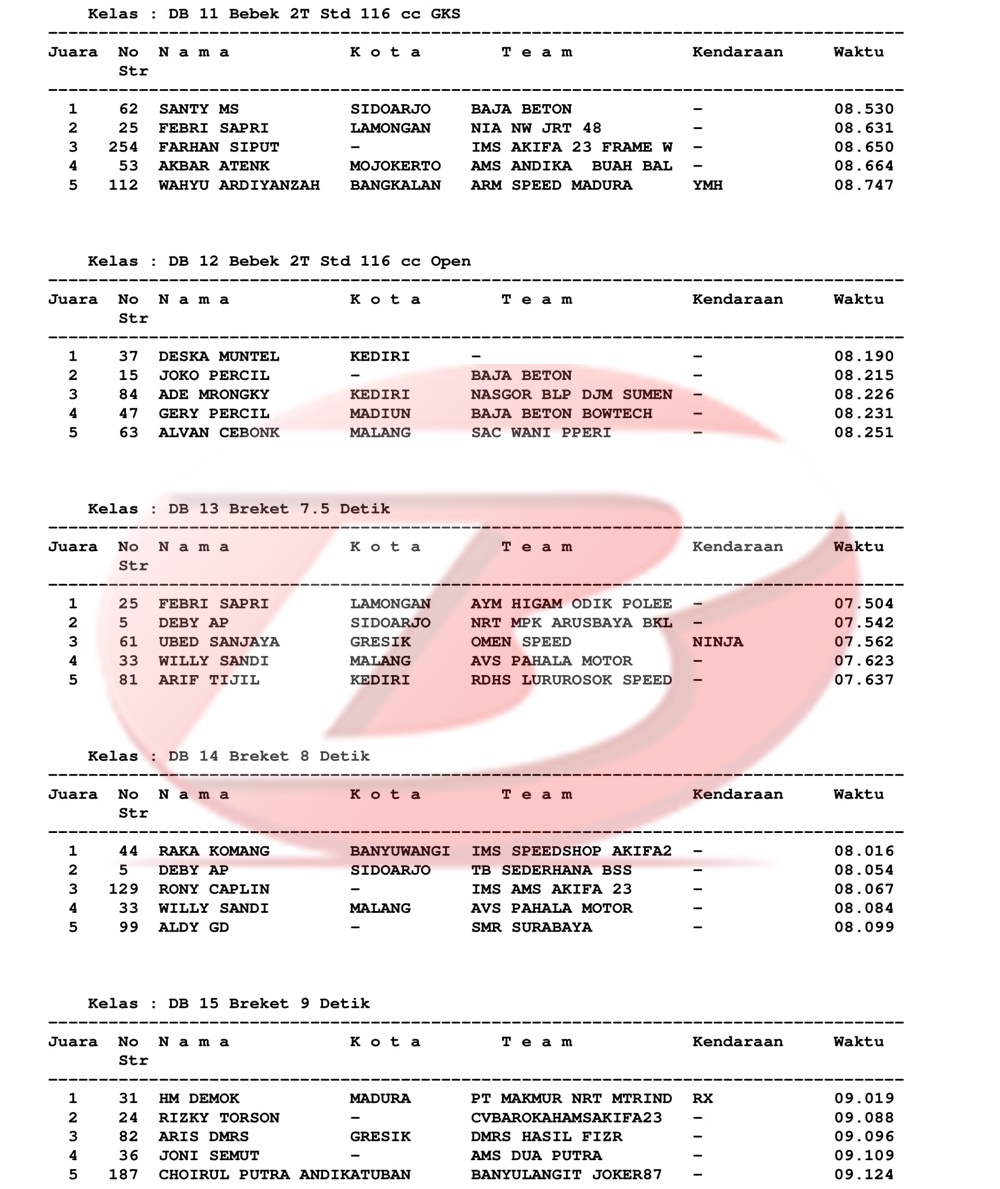 BalapMotor.Net – Berikut kami paparkan hasil lengkap para juara kejuaraan Jatim Drag Bike Championship 2021 yang berlangsung di sirkuit Bung Tomo, Surabaya pada Sabtu 27 November 2021.