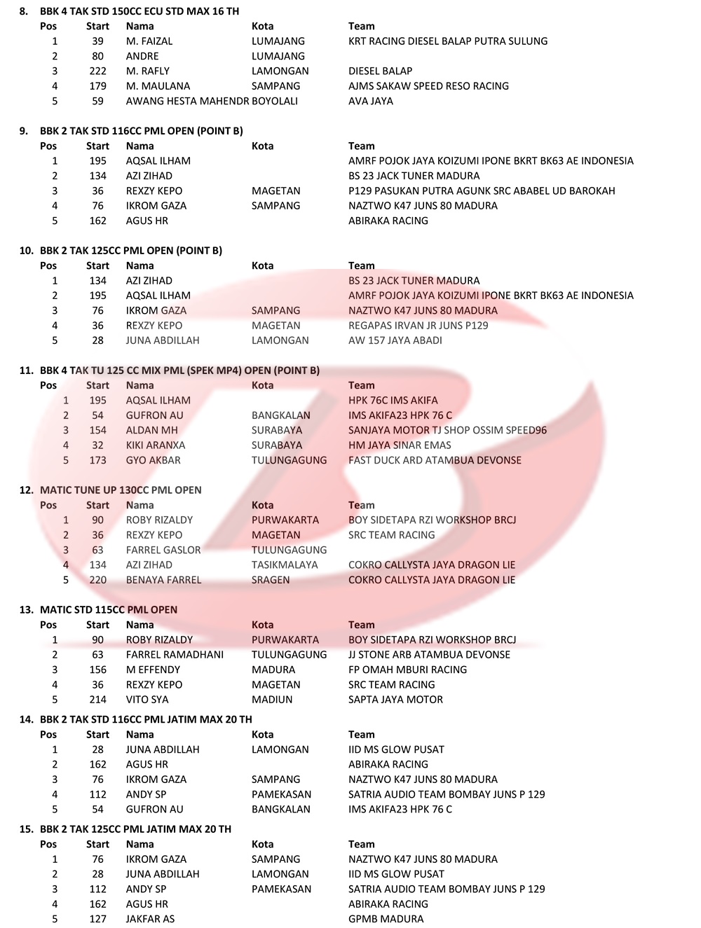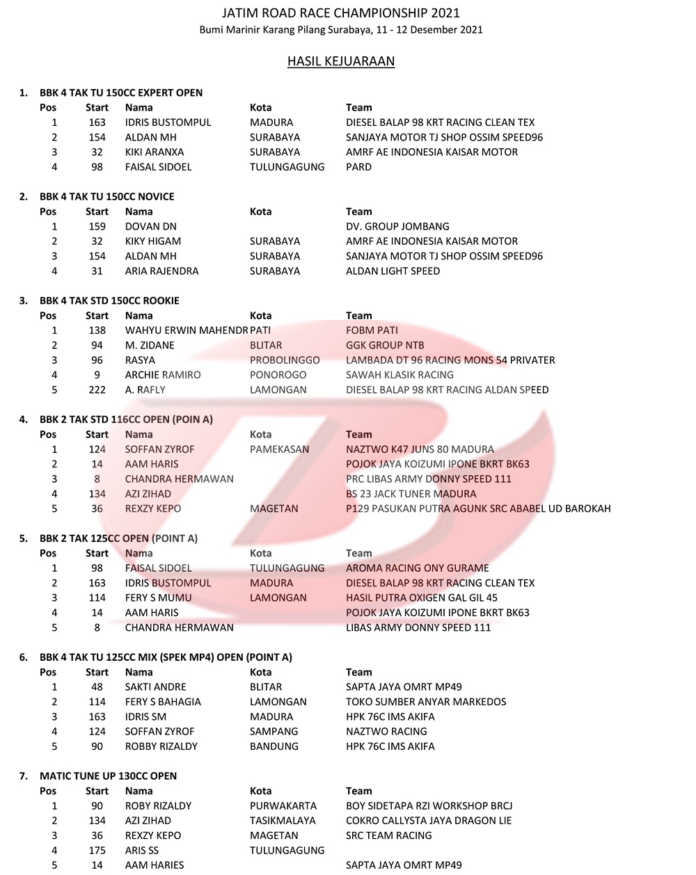 BalapMotor.Net – Berikut kami paparkan hasil para juara dari kejuaraan balap motor bertajuk Jatim Road Race Championship 2021 yang berlangsung di sirkuit NP. Bumi Marinir Karang Pilang, Surabaya, Jawa Timur pada 11-12 Desember 2021.