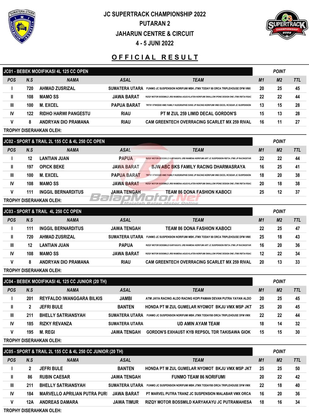 BalapMotor.Net – Berikutb merupakan hasil juara dari gelaran JC Supertrack Championship 2022 putaran 2 yang berlangsung di Jaharun Centre & Circuit Deli Serdang, Sumatera Utara pada 5-6 Juni 2022. | A2M