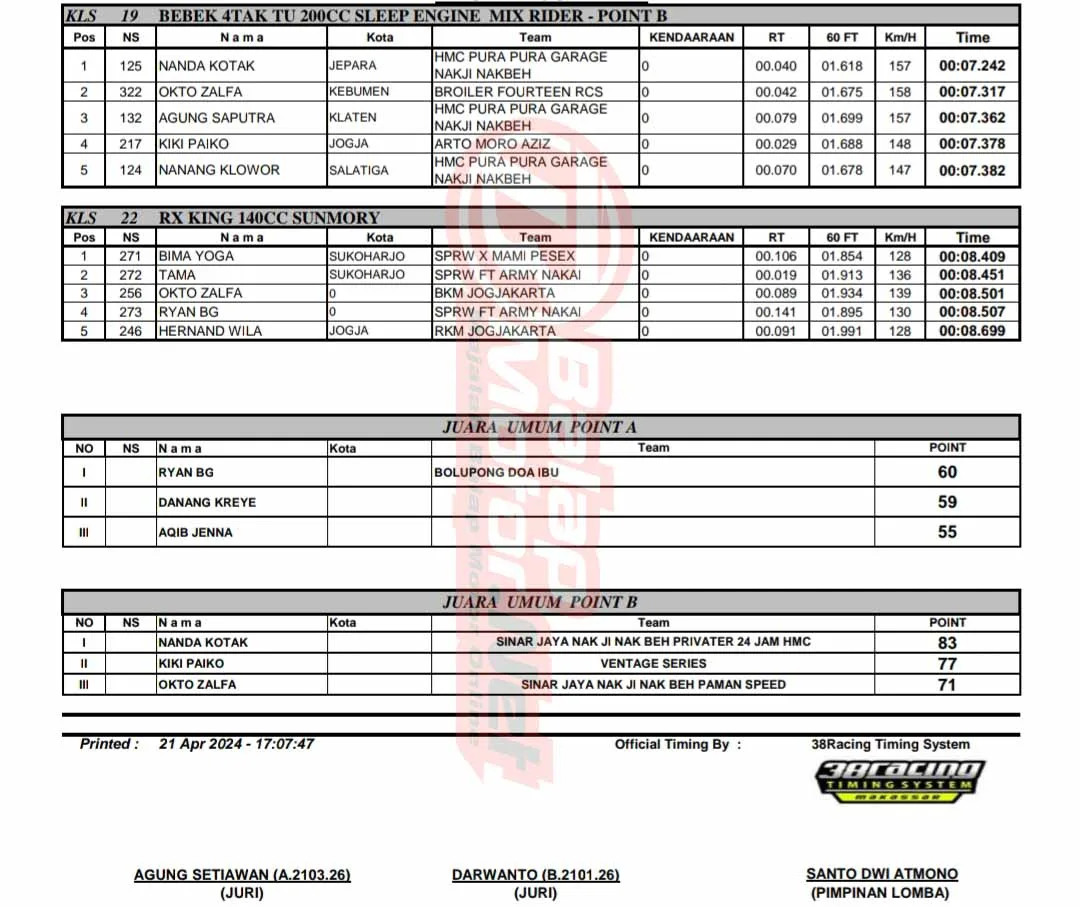 BalapMotor.Net – Berikut merupakan hasil lengkap kejuaraan balap lurus bertajuk Kartini Rookie Drag Bike Challenge yang berlangsung di sirkuit NP. Komplek Pemkab. Boyolali, Jawa Tengah pada Minggu 21 April 2024. (***)