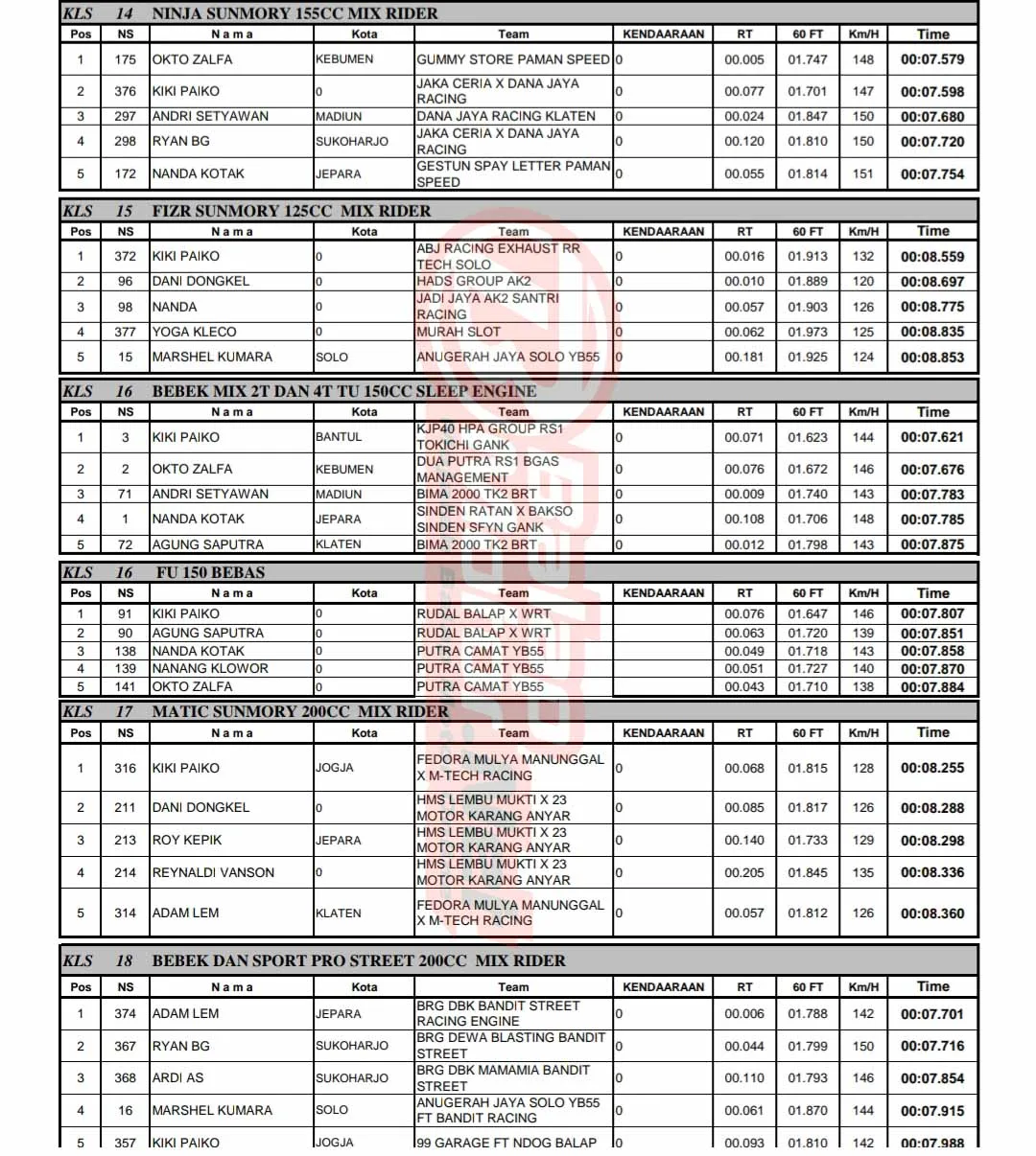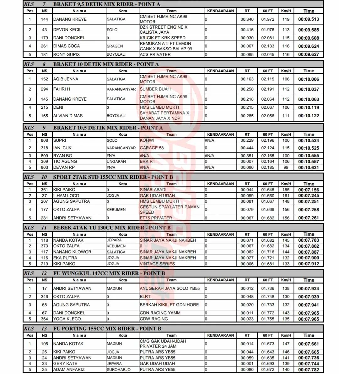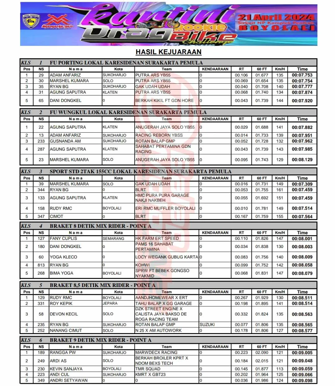 BalapMotor.Net – Berikut merupakan hasil lengkap kejuaraan balap lurus bertajuk Kartini Rookie Drag Bike Challenge yang berlangsung di sirkuit NP. Komplek Pemkab. Boyolali, Jawa Tengah pada Minggu 21 April 2024. (***)