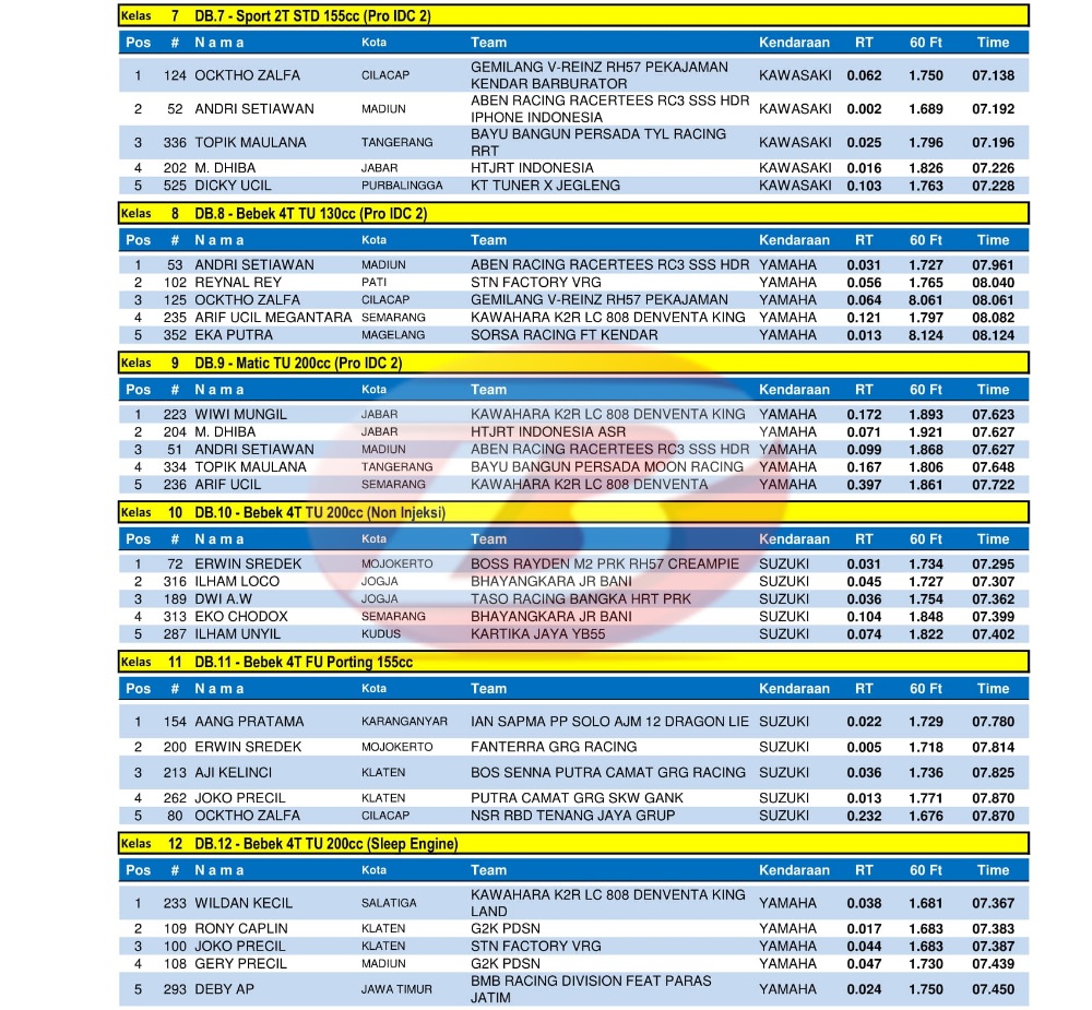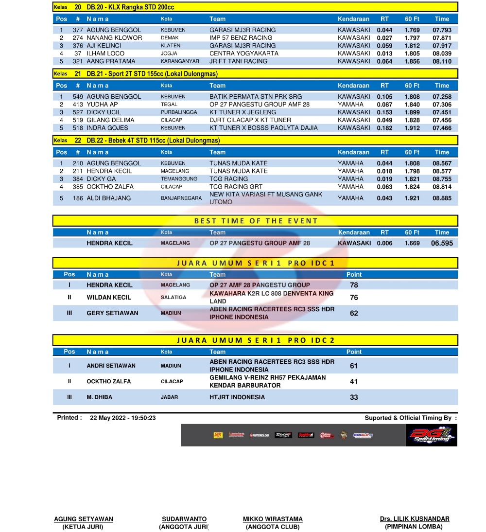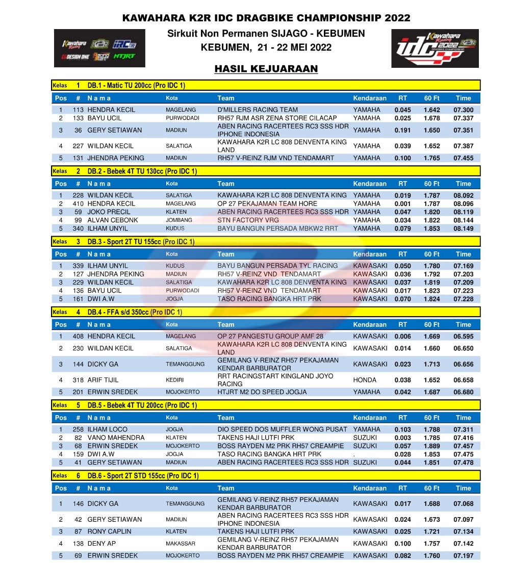 Hasil Juara Kawahara K2R IDC Drag Bike Seri 1 Kebumen 21-22 Mei 2022Penulis Yugo Aol - 23/05/2022 BalapMotor.Net – Berikut kami paparkan hasil lengkap seri pembuka Kawahara K2R IDC Drag Bike Championship 2022 yang berlangsung di Kebumen, Jawa Tengah pada 21-22 Mei 2022.