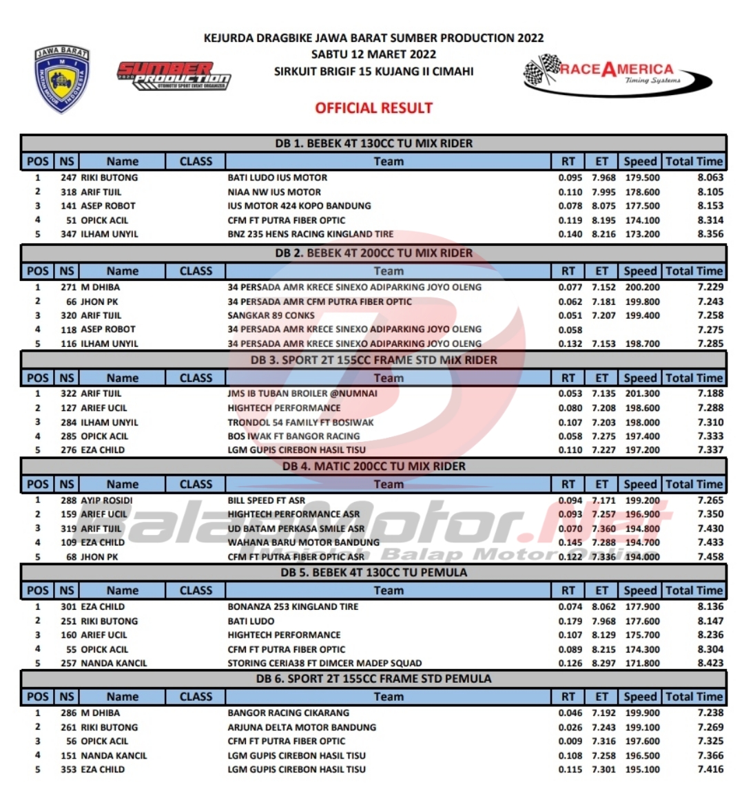 BalapMotor.Net – Berikut merupakan hasil juara dari gelaran Kejurda Drag Bike Jawa Barat Sumber Production 2022 yang berlangsung di sirkuit Brigif 15 Kujang II Cimahi pada hari Sabtu 12 Maret 2022.
