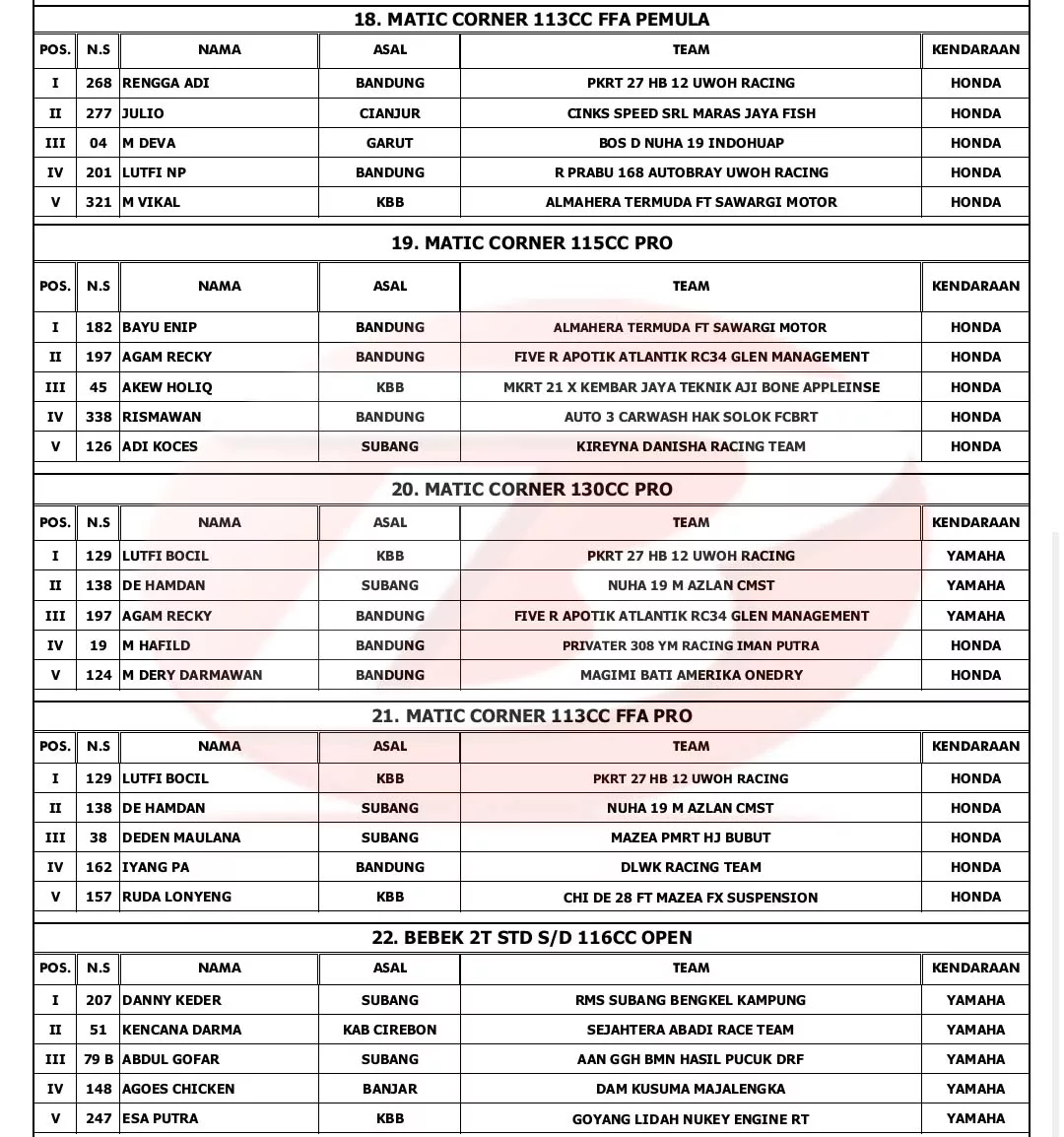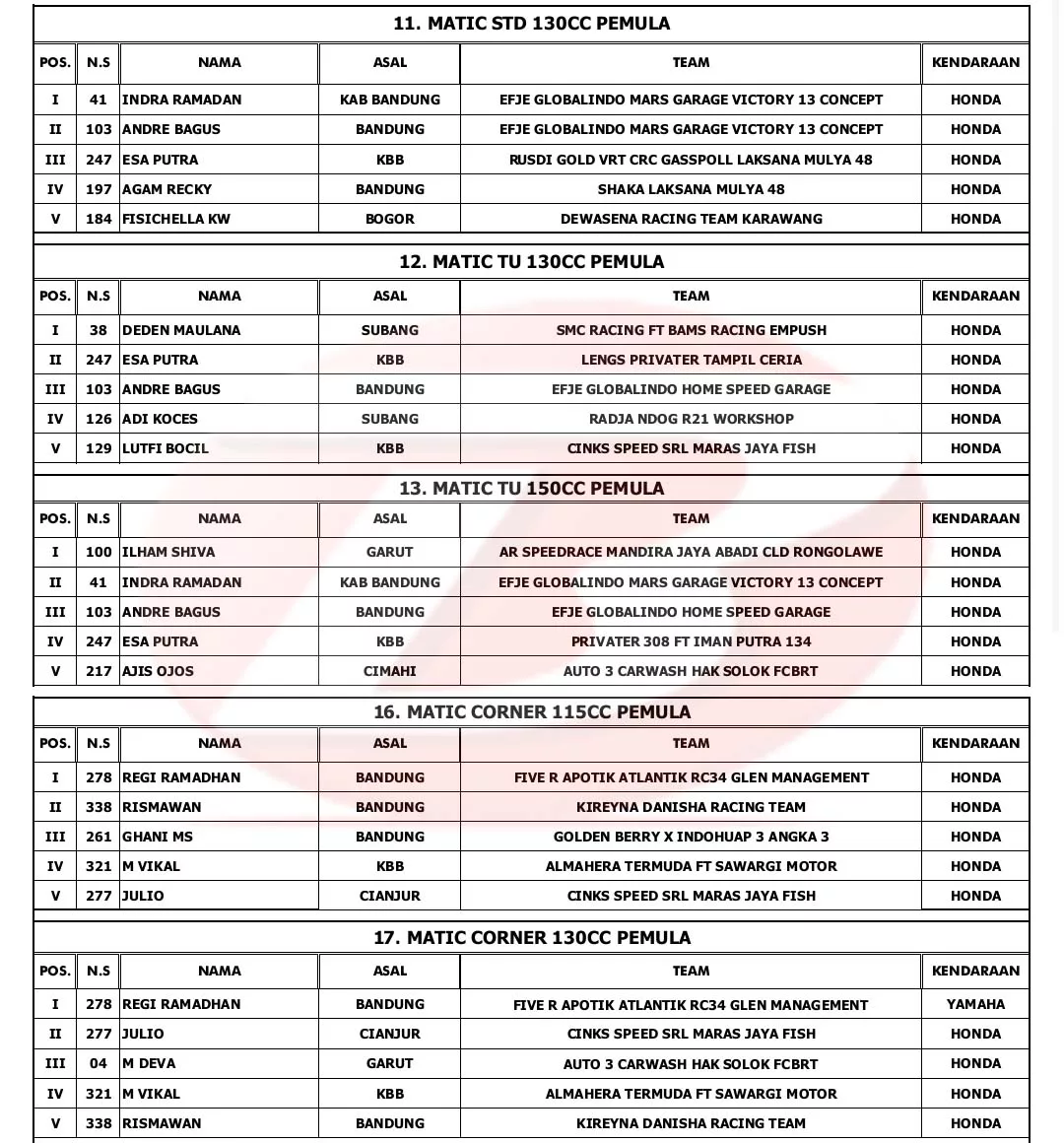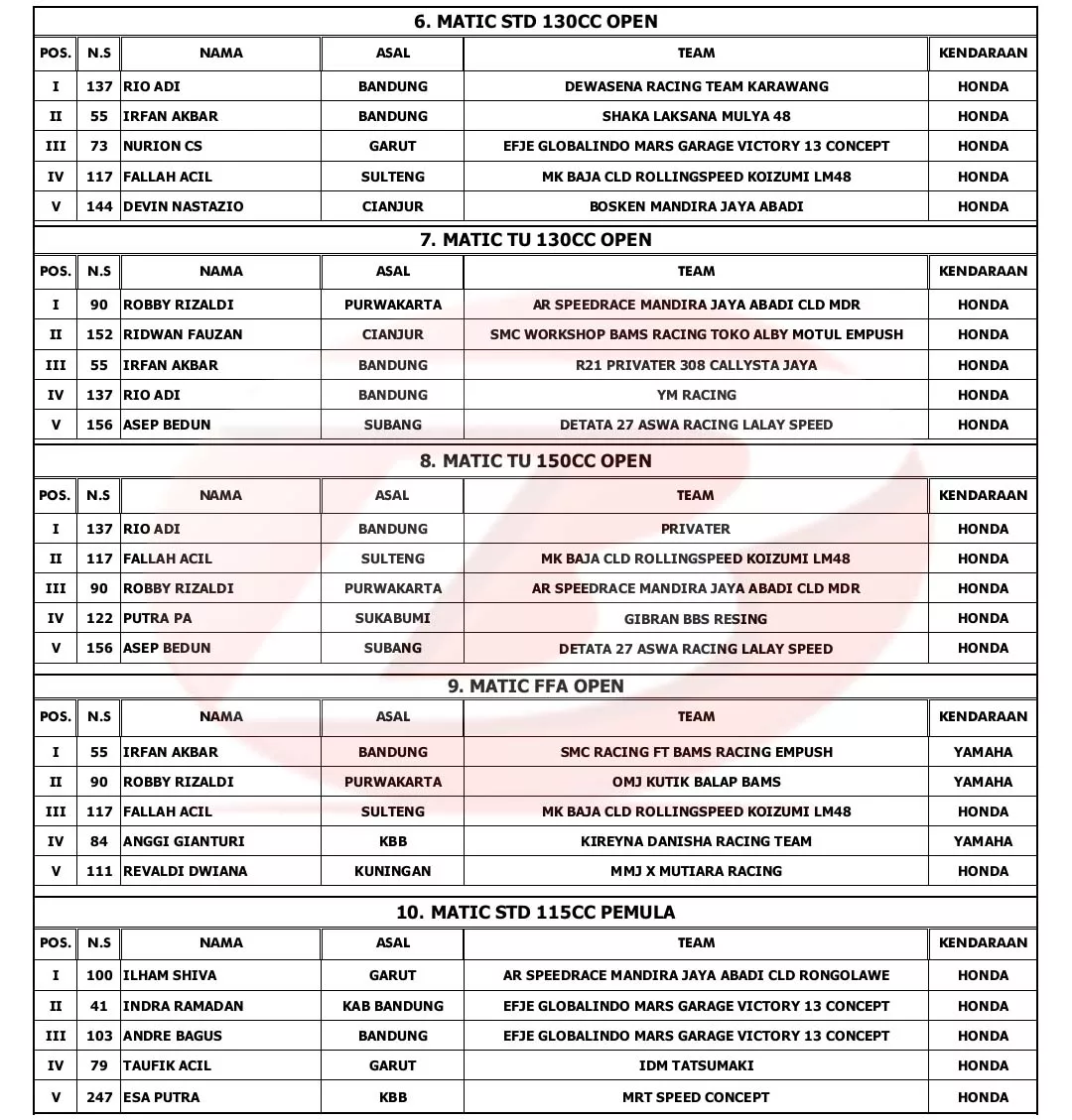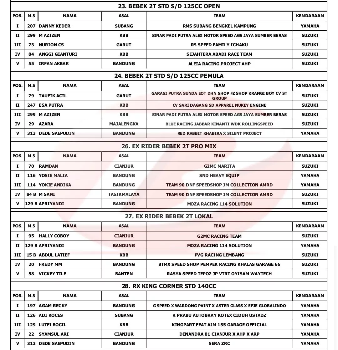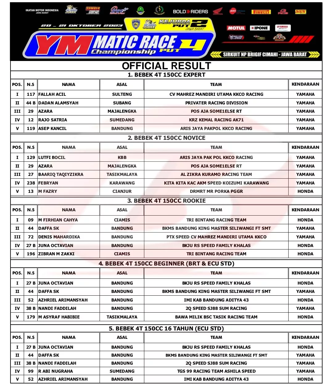 BalapMotor.Net – Berikut merupakan hasil lengkap Kejurda Road Race Jawa Barat seri kedua dan juga YM Matic Race putaran ke-4 yang berlangsung di sirkuit NP. Brigif 15 Kujang II Cimahi, pada 20-21 Oktober 2023. (***)