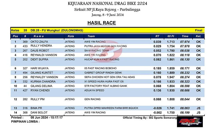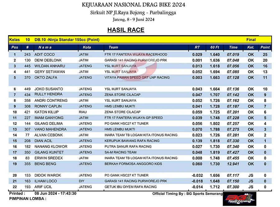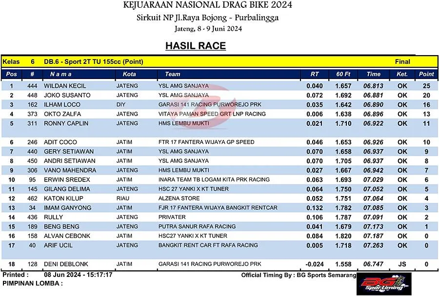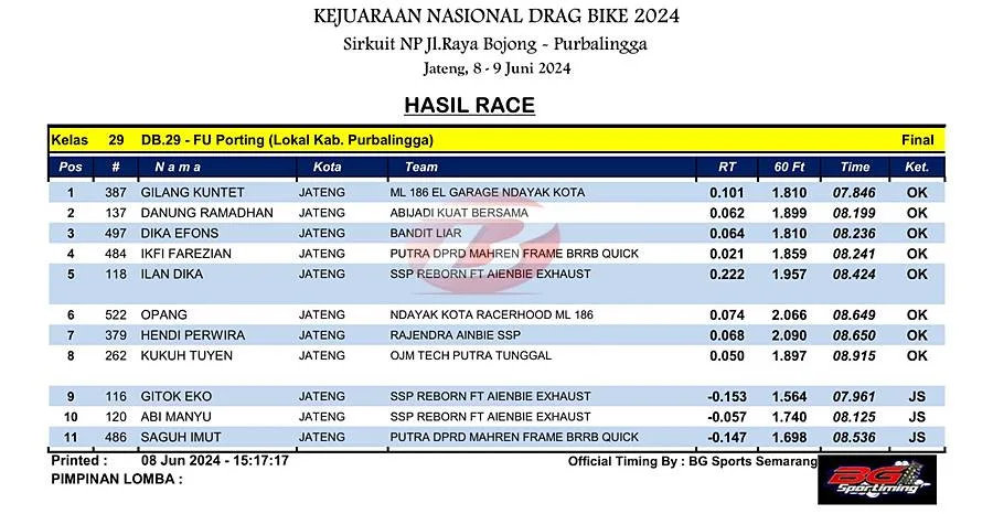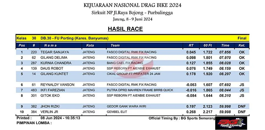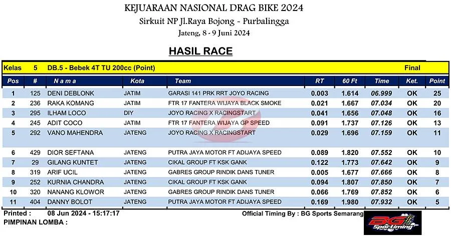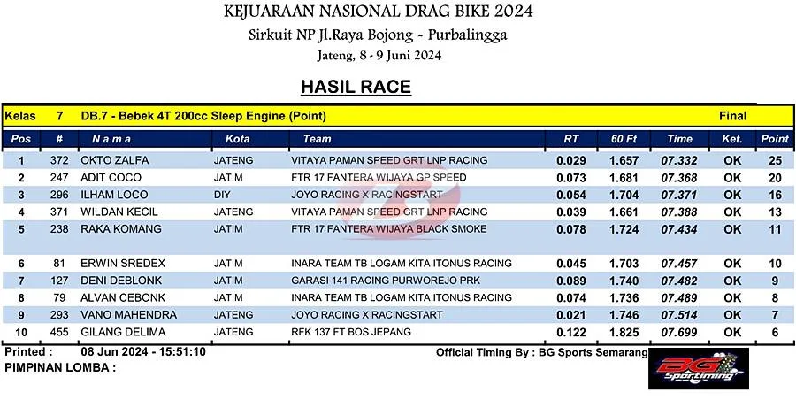 BalapMotor.Net – Berikut merupakan hasil juara kelas supporting poin dan lokal yang dilombakan pada Kejuaraan Nasional Drag Bike Region 2 Seri pertama yang berlangsung di sirkuit NP. Jl. Raya Bojong, Purbalingga, Jawa Tengah pada Sabtu 8 Juni 2024. (***)