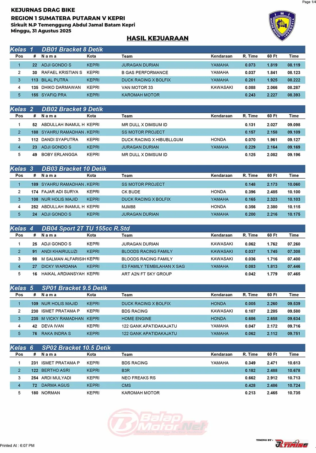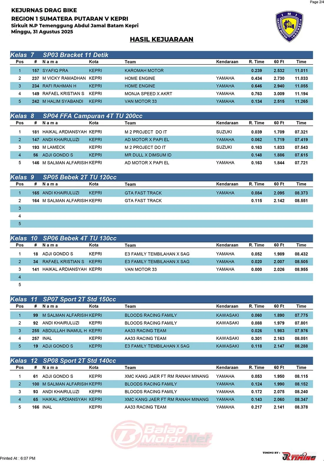 BalapMotor.Net – Berikut merupakan hasil juara dari gelaran Kejurnas Drag Bike Region 1 Sumatera putaran 5 yang berlangsung di sirkuit NP Temenggung Abdul Jamal, Batam-Kepri pada hari Minggu 31 Agustus 2025. (**)