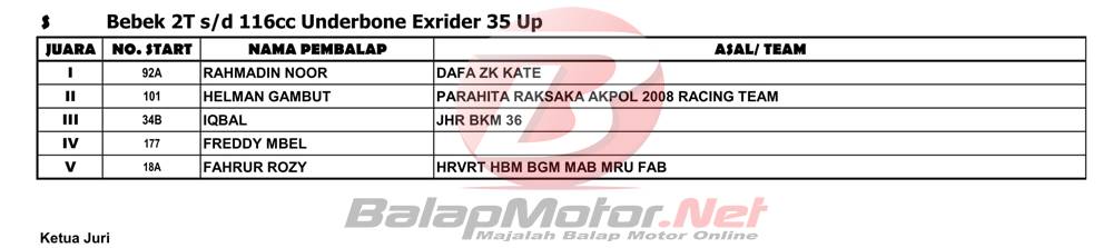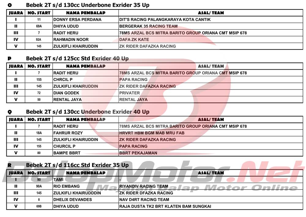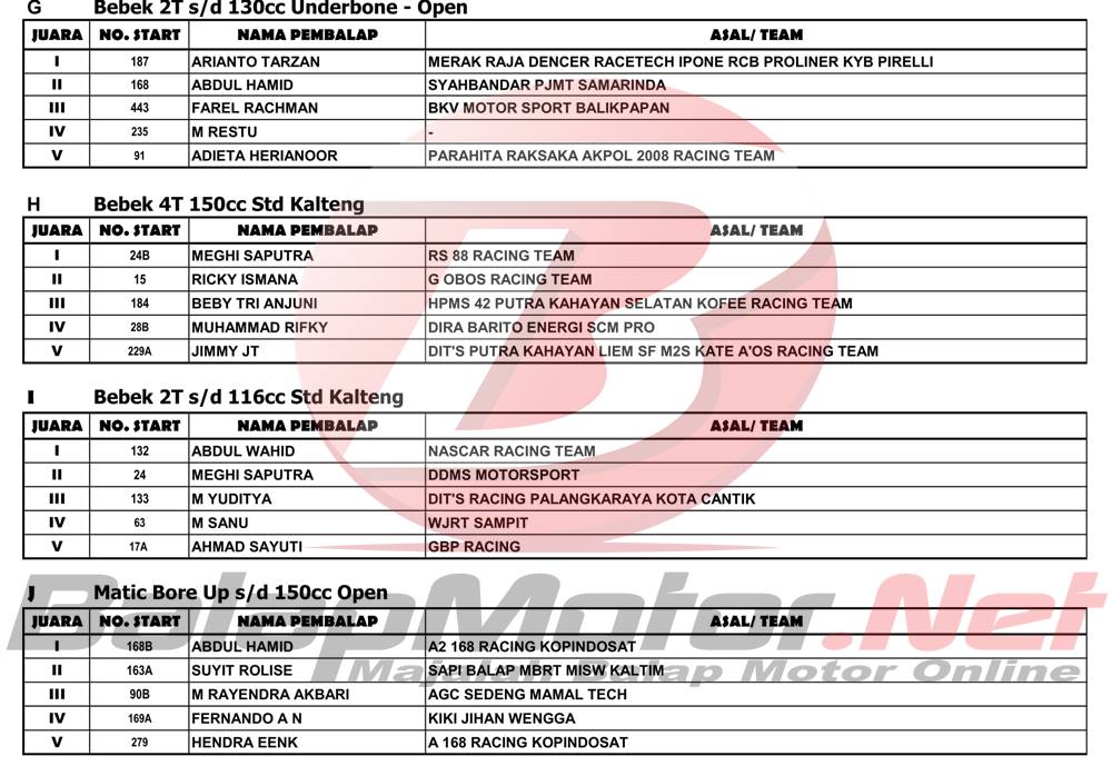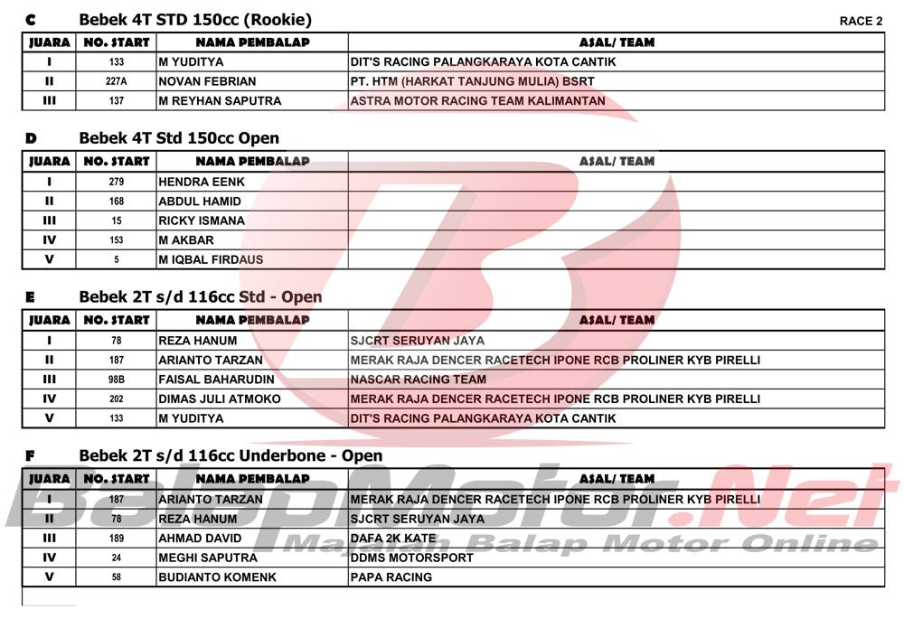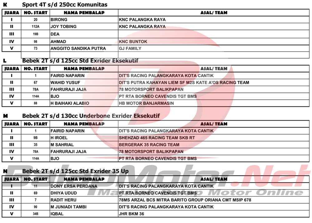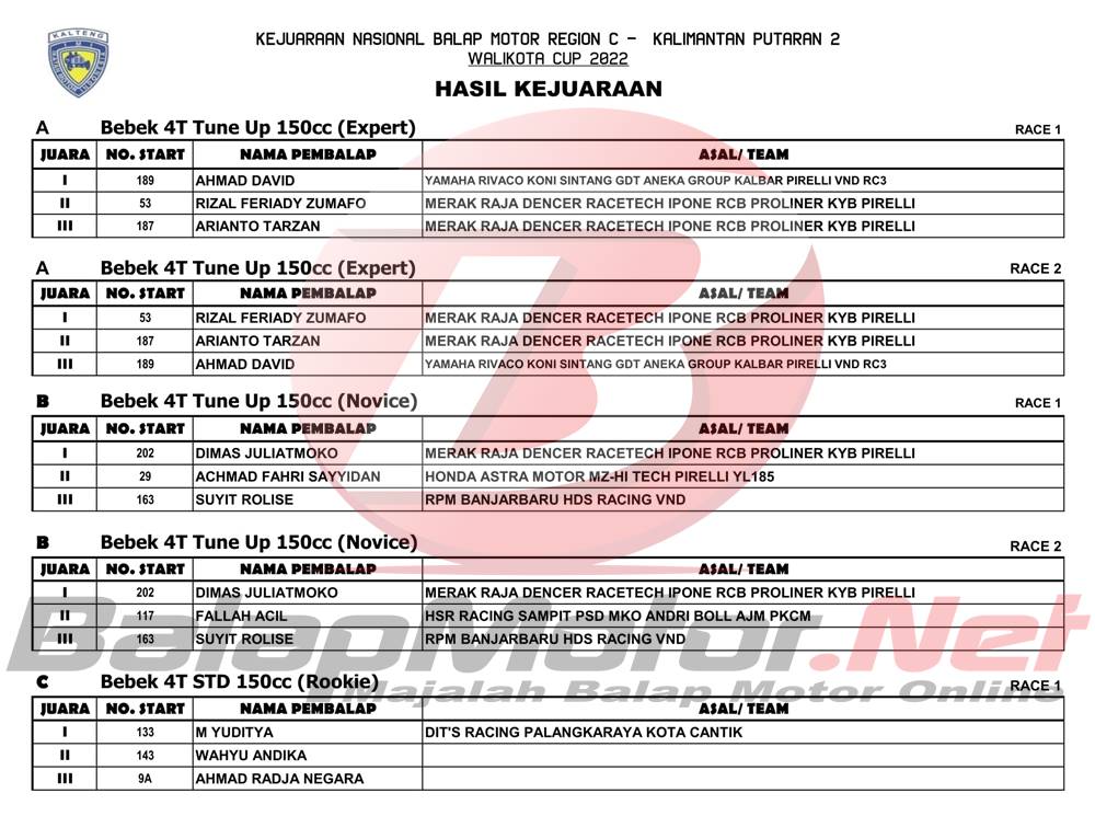 BalapMotor.Net – Berikut merupakan hasil juara dari gelaran Kejuaraan Nasional Balap Motor (Motoprix) Region C Kalimantan ronde kedua 2022 yang digelar di sirkuit permanen Sabaru, Kota Palangkaraya, Kalimantan Tengah pada 14-15 Mei 2022.
