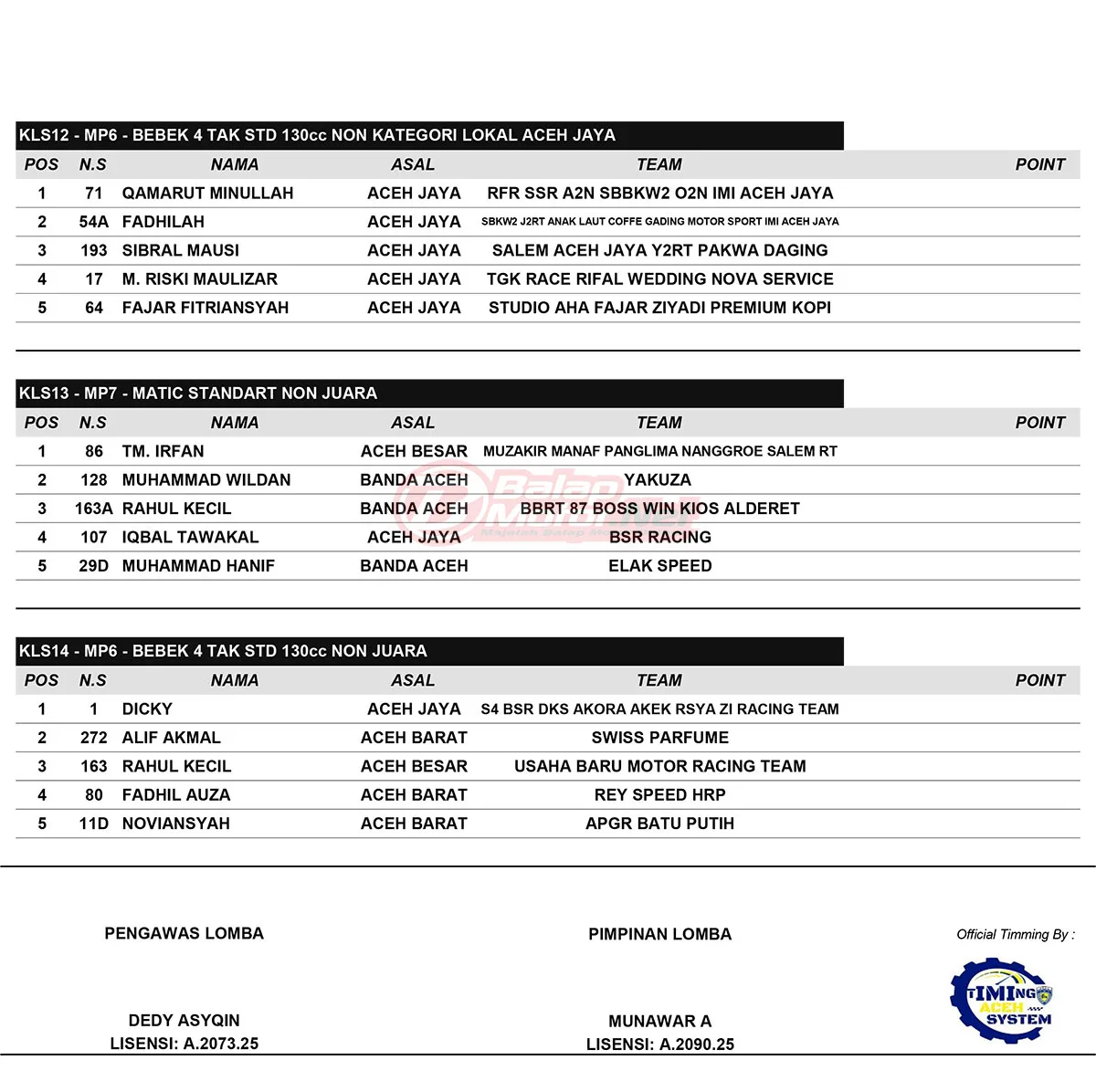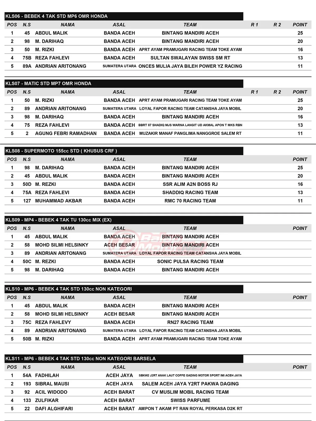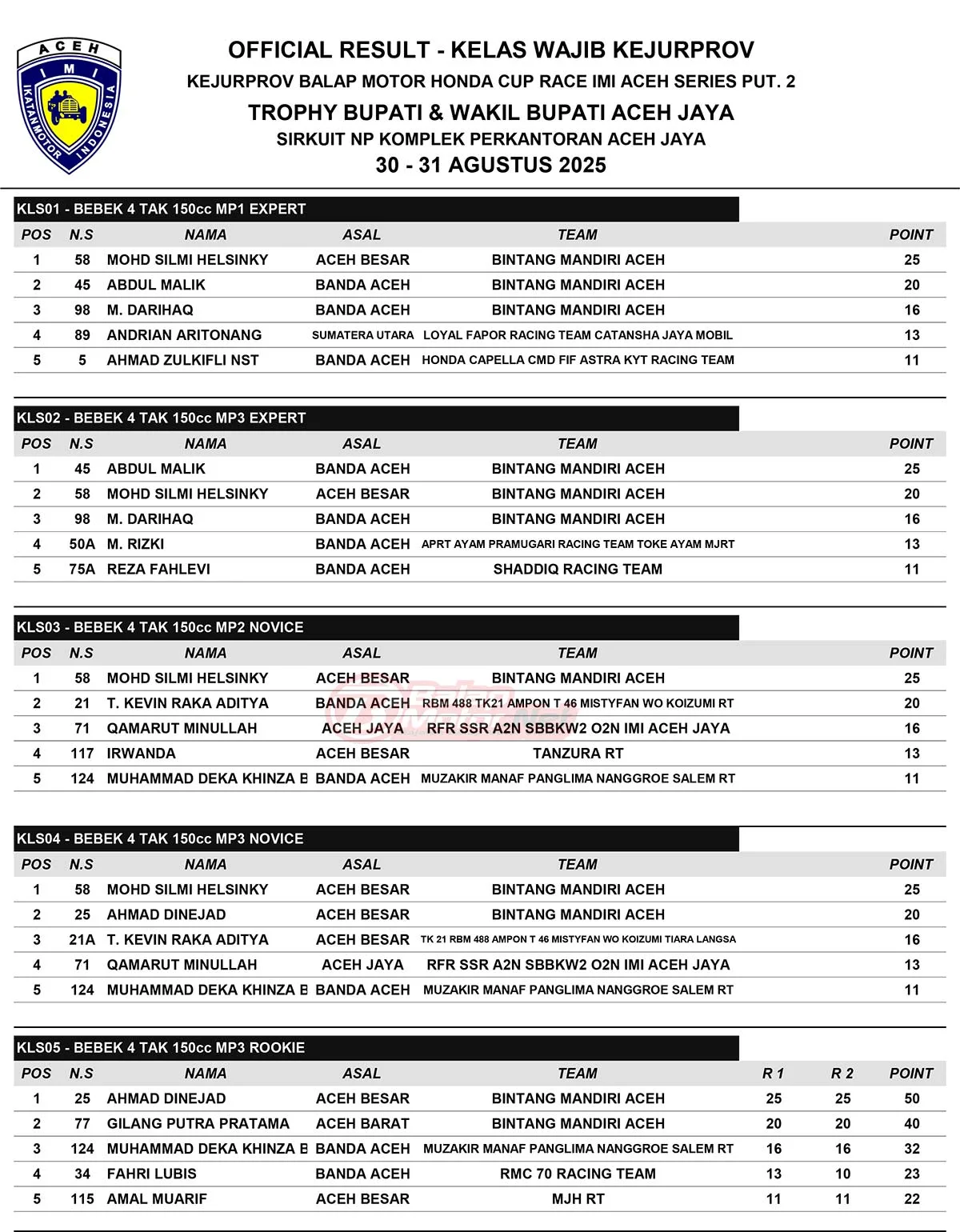 Hasil Juara Kejurprov Balap Motor Honda Cup Race IMI Aceh 2025 Putaran 2 di Aceh JayaPenulis BalapMotor.net - 01/09/2025 BalapMotor.Net – Berikut merupakan hasil juara dari gelaran Kejurprov Balap Motor – Honda Cup Race IMI Aceh 2025 putaran 2 yang berlangsung di Sirkuit NP Komplek Perkantoran Aceh Jaya, NAD pada 30-31 Agustus 2025. (Zulham Saputra)