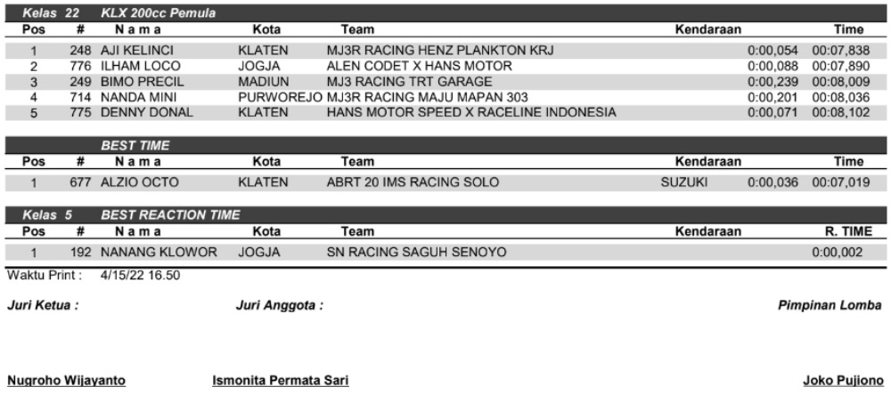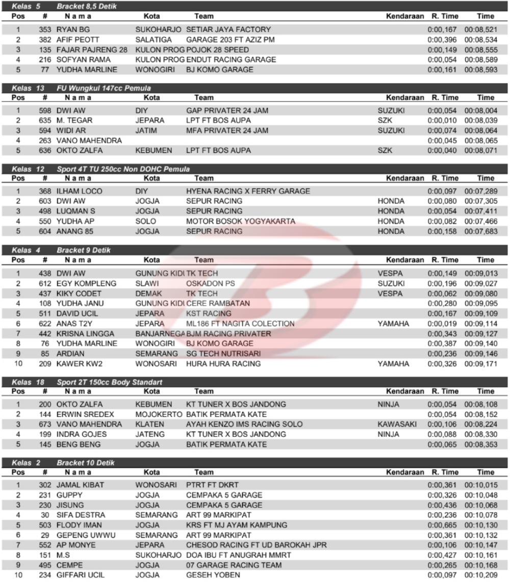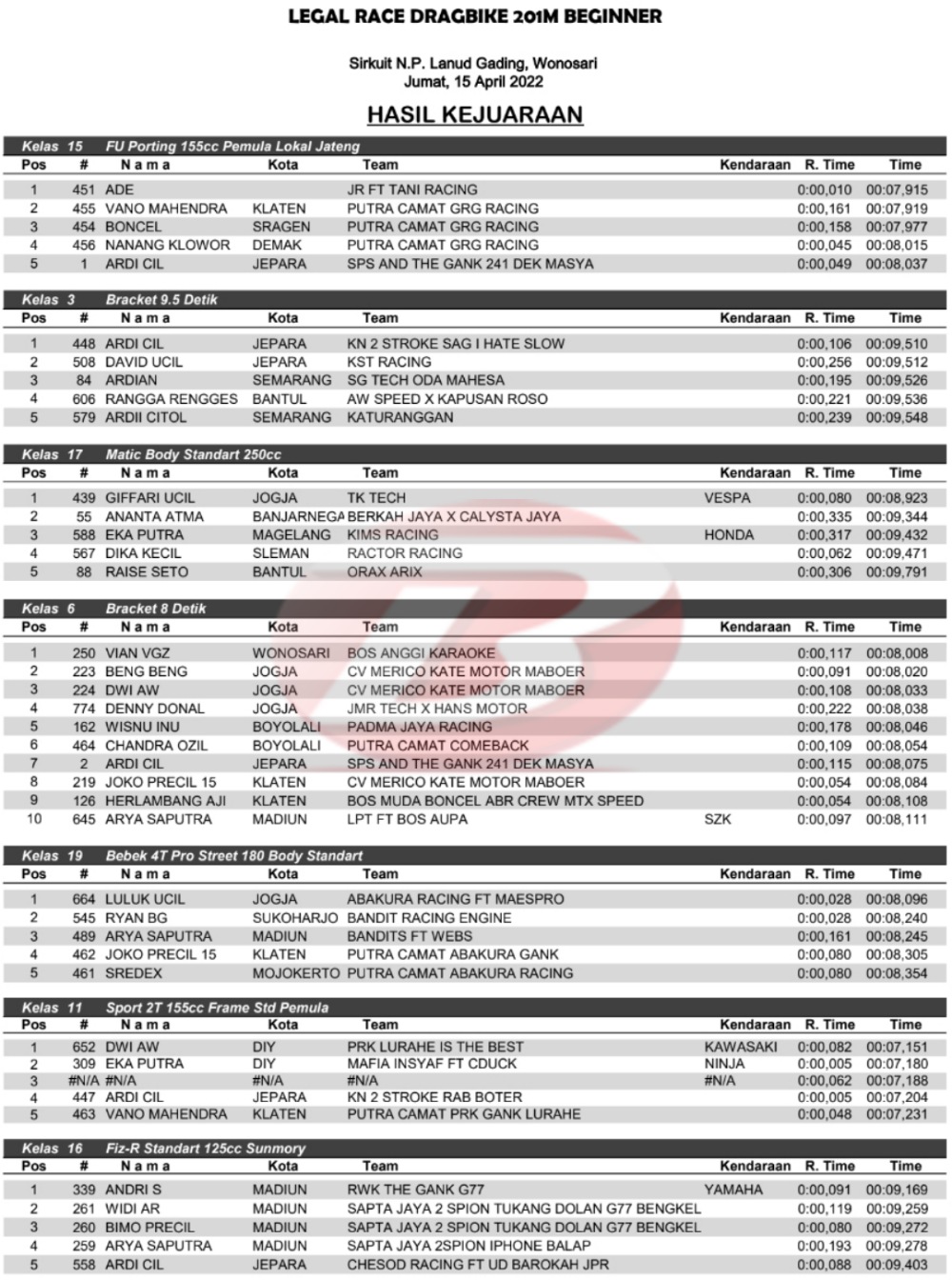 Hasil Juara Legal Race Drag Bike Wonosari 15 April 2022Penulis Yugo Aol - 15/04/2022 BalapMotor.Net – Berikut kami paparkan hasil lengkap kejuaraan balap lurus dengan tajuk Legal Race Drag Bike 201m Beginner yang berlangsung di sirkuit NP. Lanud Gading, Wonosari, Yogyakarta pada Jum’at 15 April 2022.