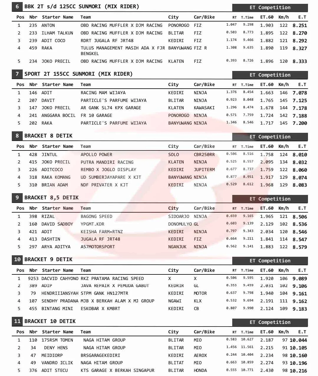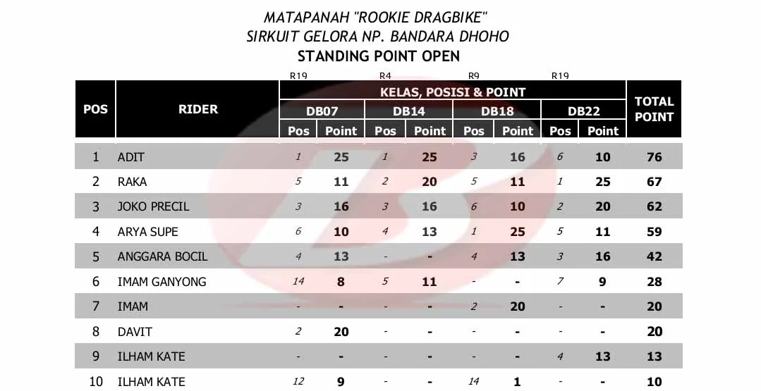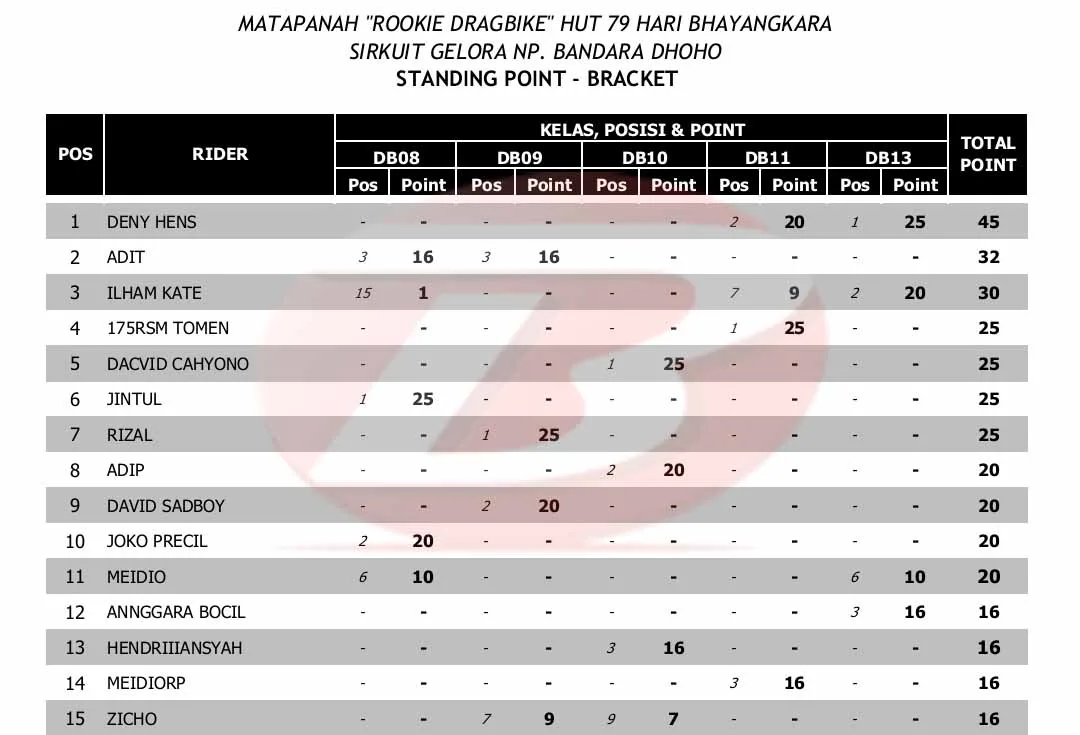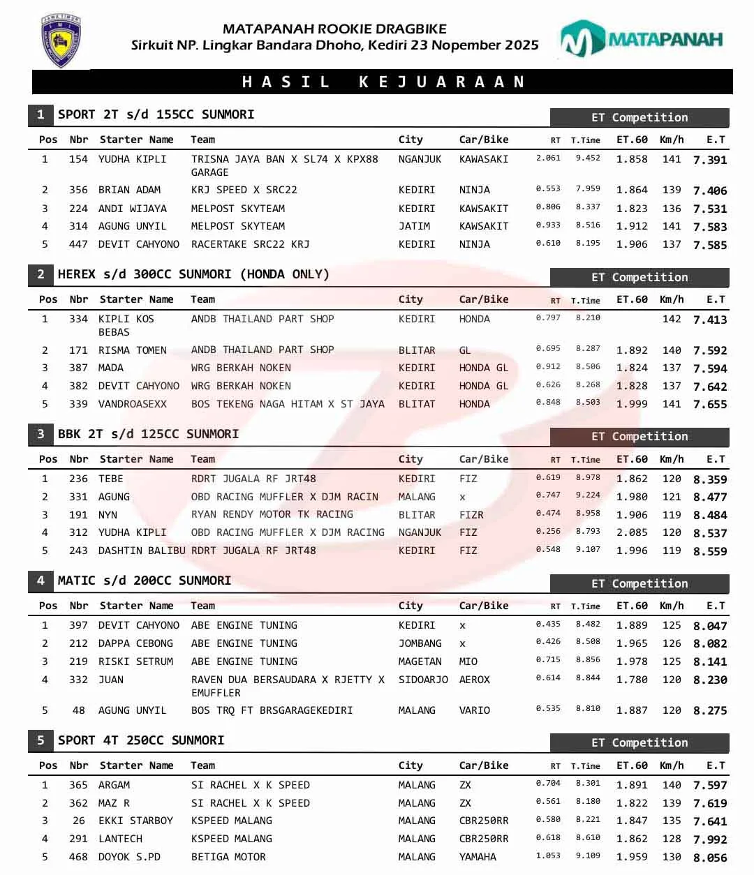 BalapMotor.Net – Berikut merupakan hasil kejuaraan balap lurus Matapanah Rookie Drag Bike 2025 yang berlangsung di sirkuit NP. Gelora Bandara Dhoho Kediri, Jawa Timur pada Minggu 23 November 2025. (**)