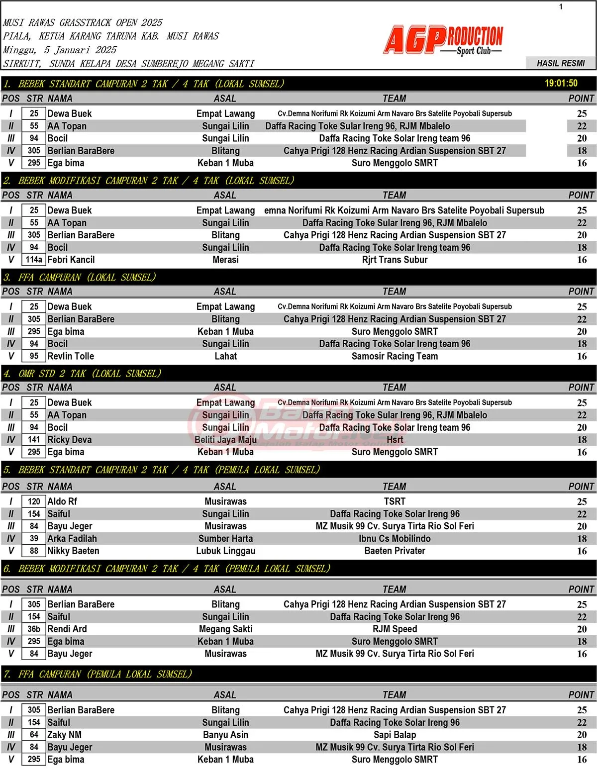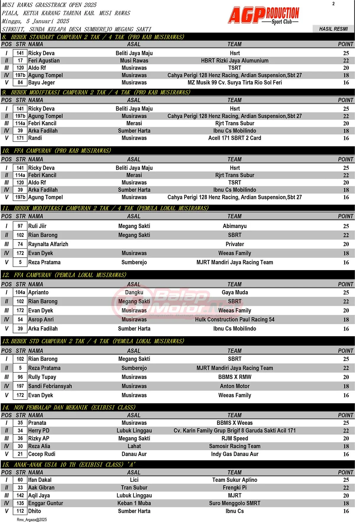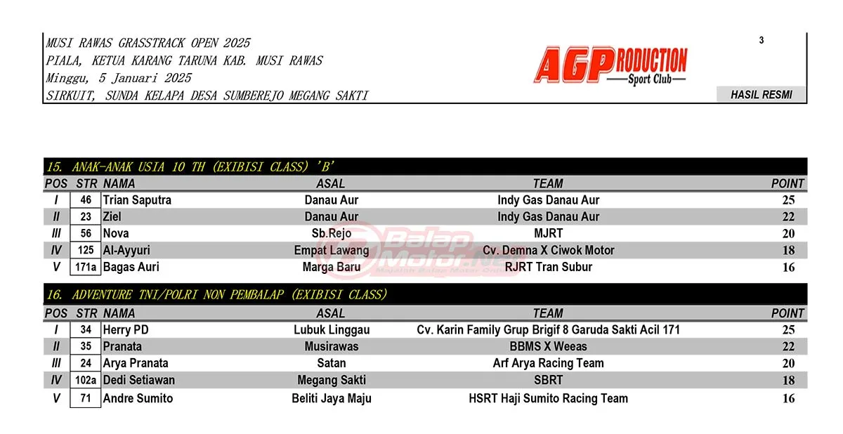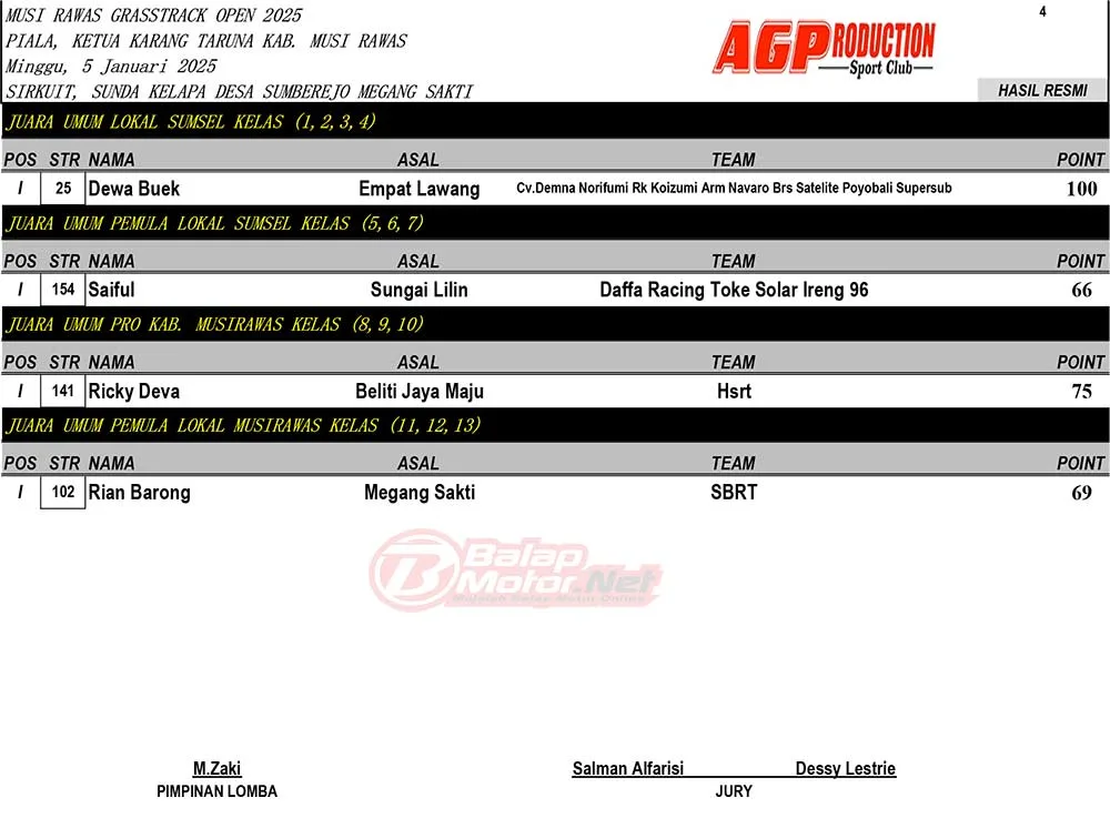 Hasil Juara Musi Rawas Grasstrack Open 2025Penulis BalapMotor.net - 08/01/2025 BalapMotor.Net – Berikut merupakan hasil juara dari gelaran Musi Rawas Grasstrack Open 2025 Piala Karang Taruna Kabupaten Musi Rawas yang berlangsung di sirkuit Sunda Kelapa, Desa Sumberejo, Megang Sakti, Musi Rawas, Sumsel 5 Januari 2025. (Budy)