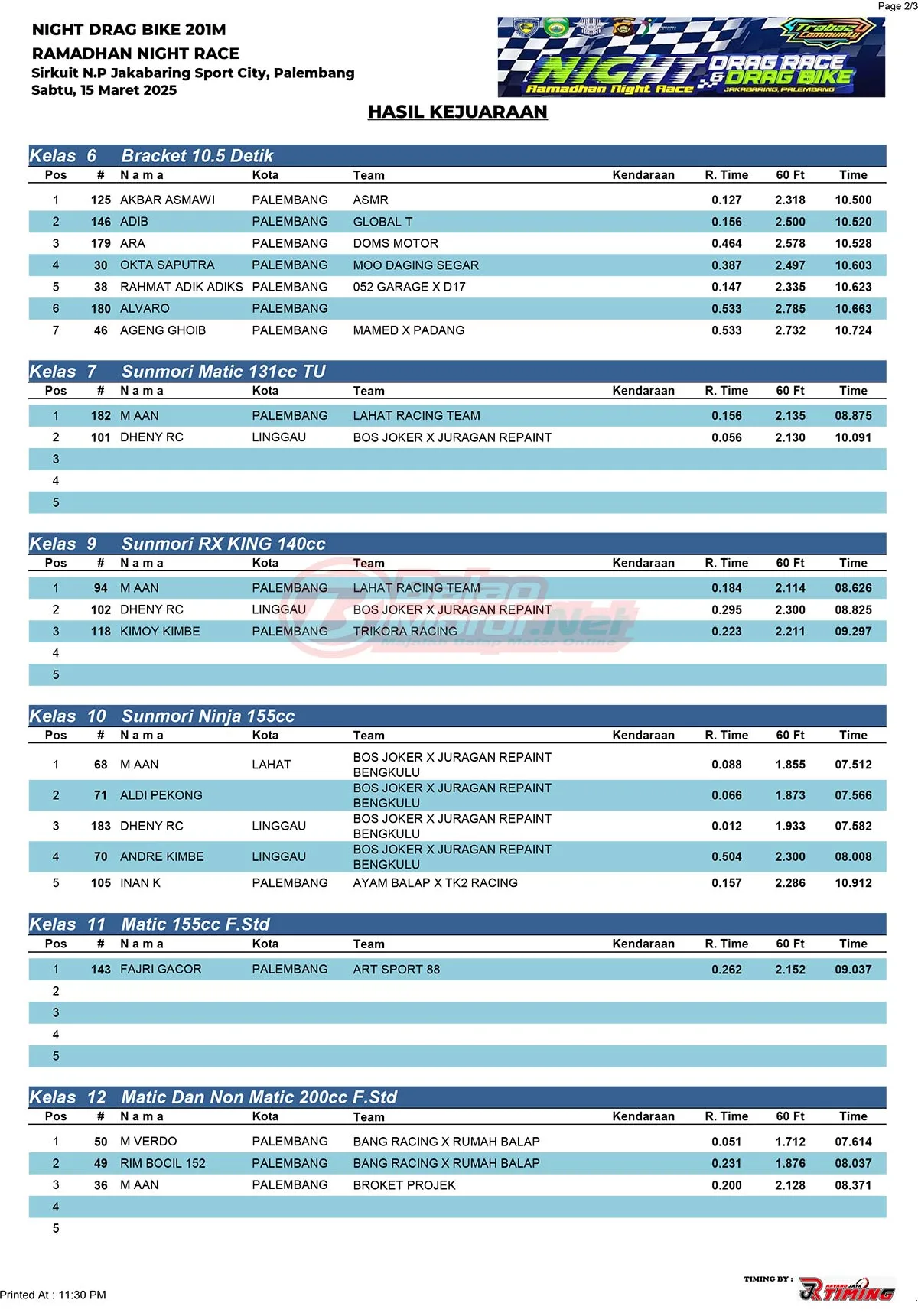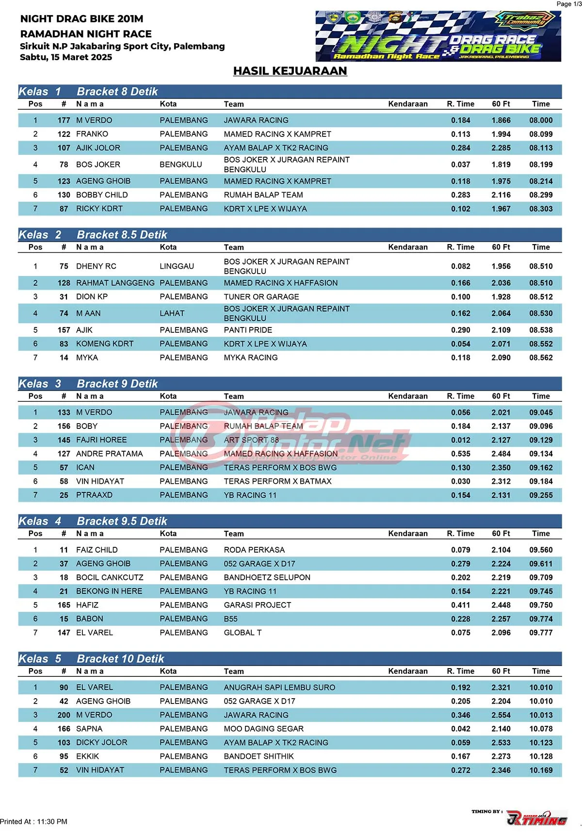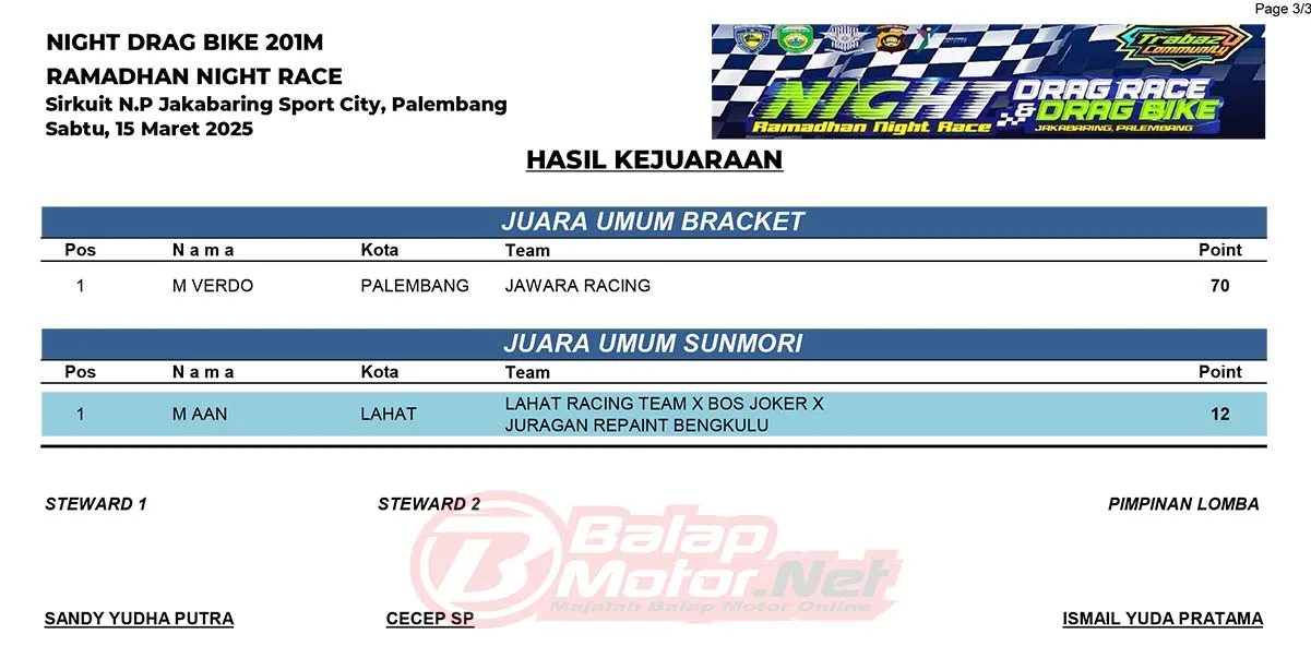 Hasil Juara Night Drag Bike 201M Palembang 15 Maret 2025