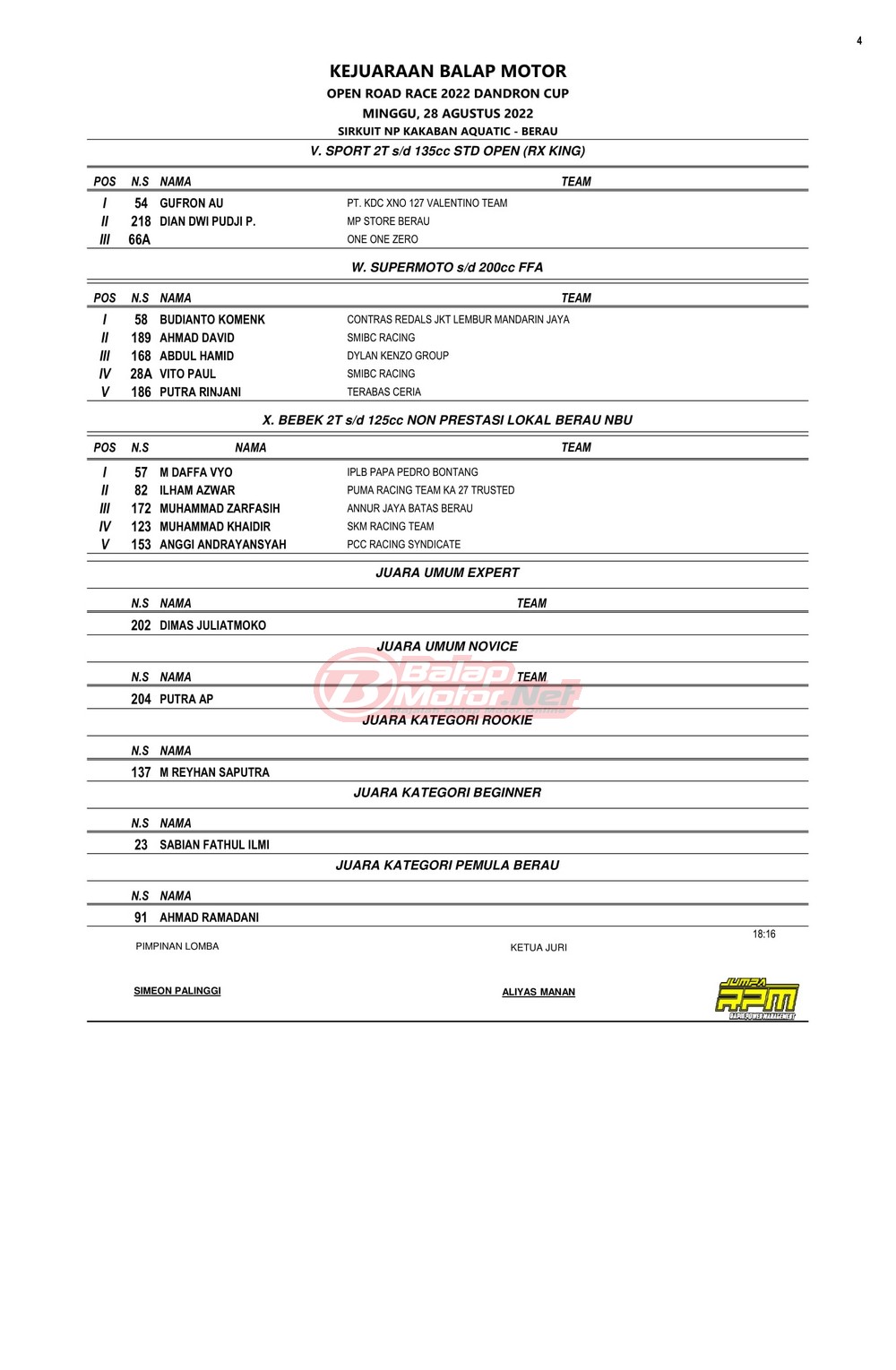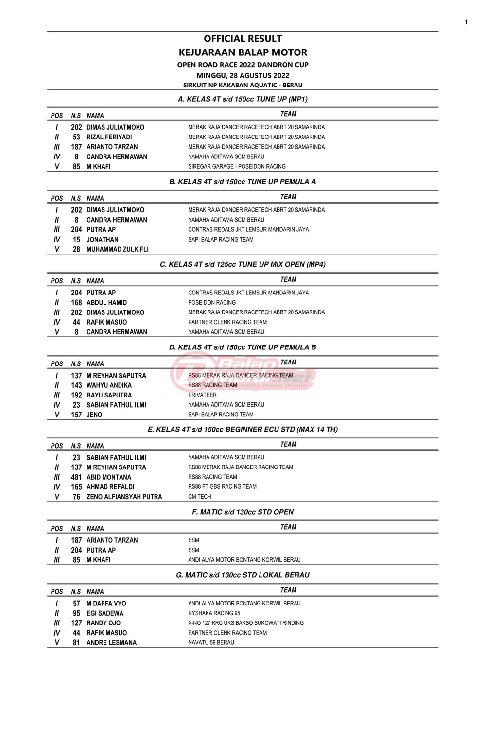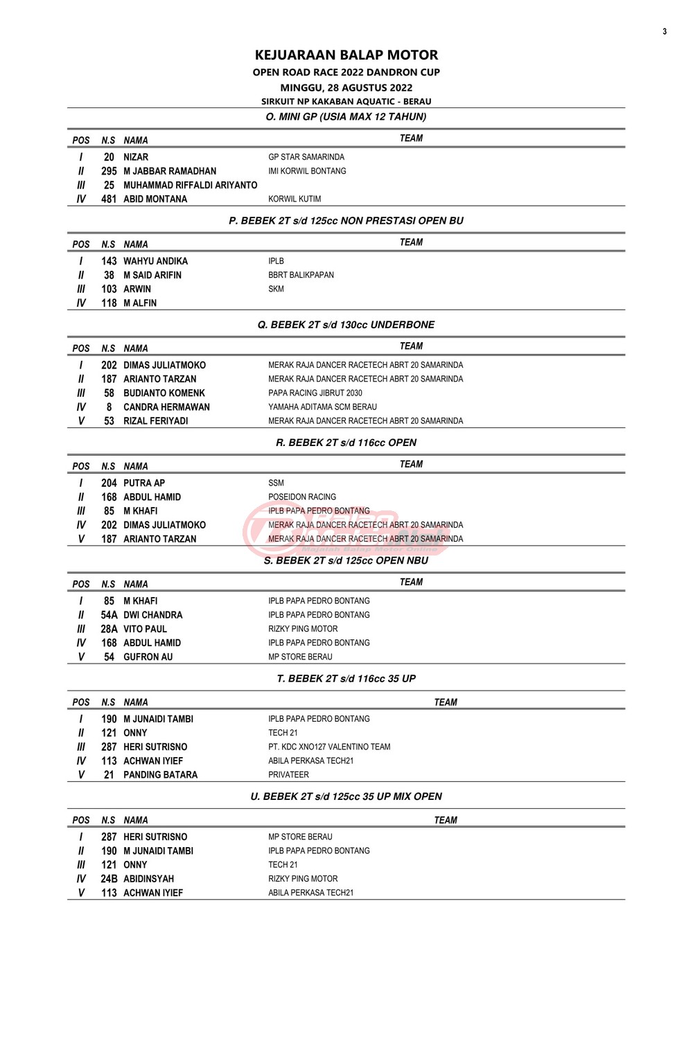 BalapMotor.Net – Berikut merupakan hasil juara dari Kejuaraan Balap Motor Open Road Race 2022 Dandron Cup yang berlangsung di sirkuit NP Kakaban Aquatic-Berau, Kalimantan Timur pada 27-28 Agustus 2022.