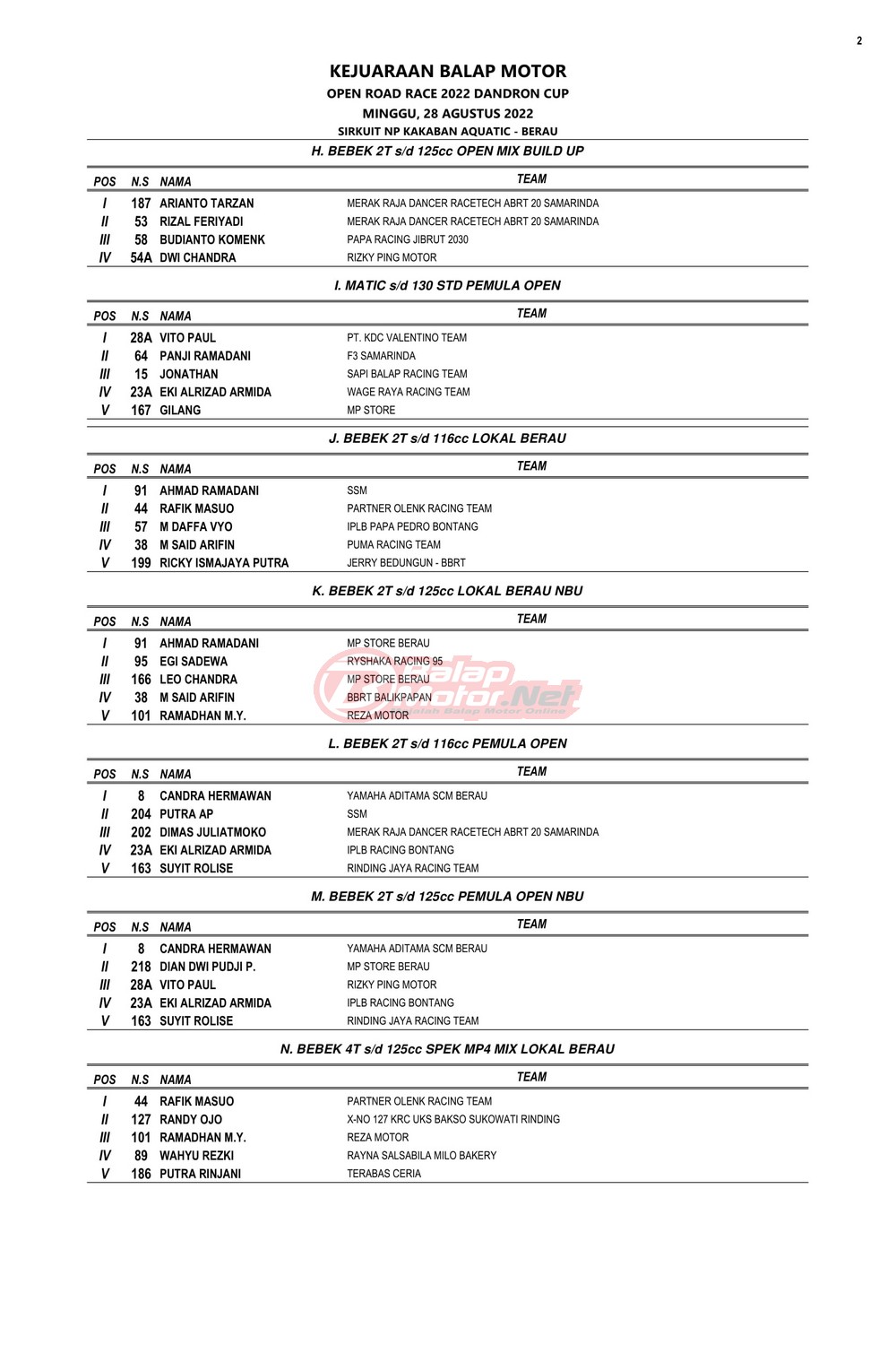 BalapMotor.Net – Berikut merupakan hasil juara dari Kejuaraan Balap Motor Open Road Race 2022 Dandron Cup yang berlangsung di sirkuit NP Kakaban Aquatic-Berau, Kalimantan Timur pada 27-28 Agustus 2022.